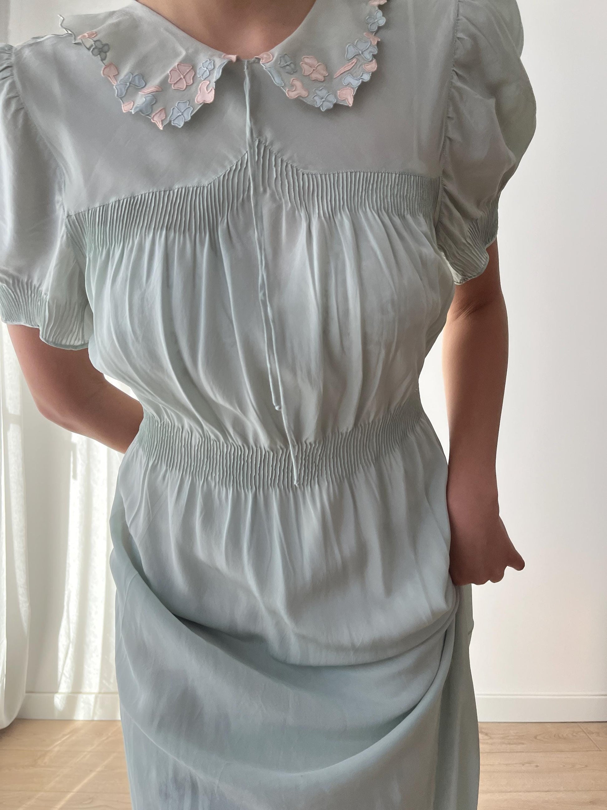 Robe de nuit en soie bleu pâle style vintage des années 1930, coupe en biais, lingerie maxi