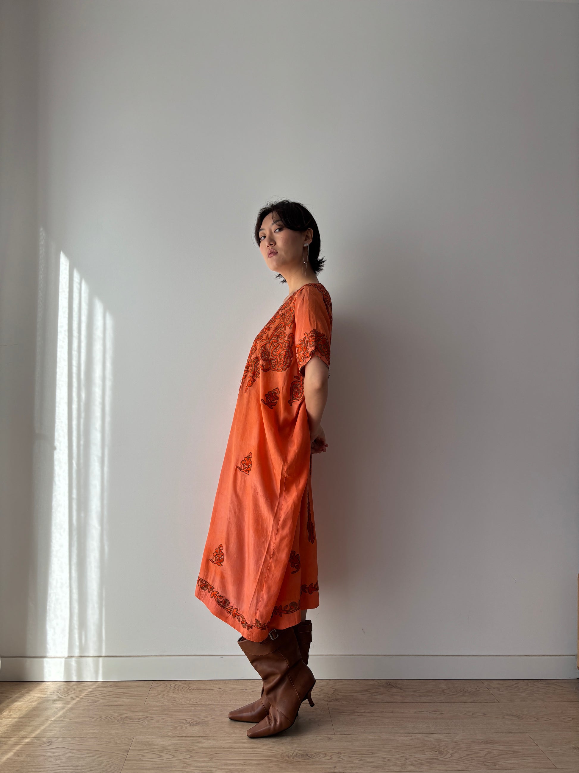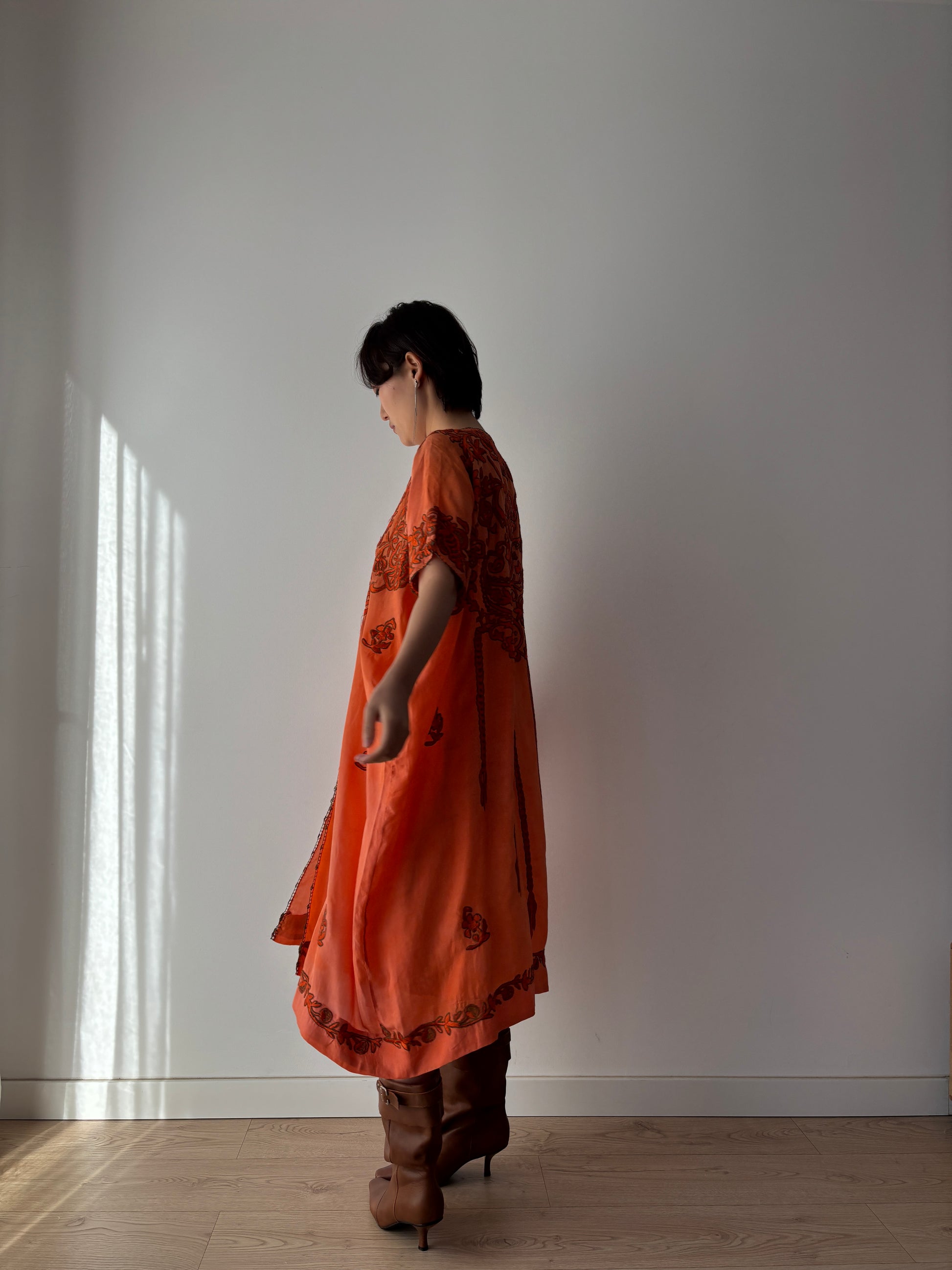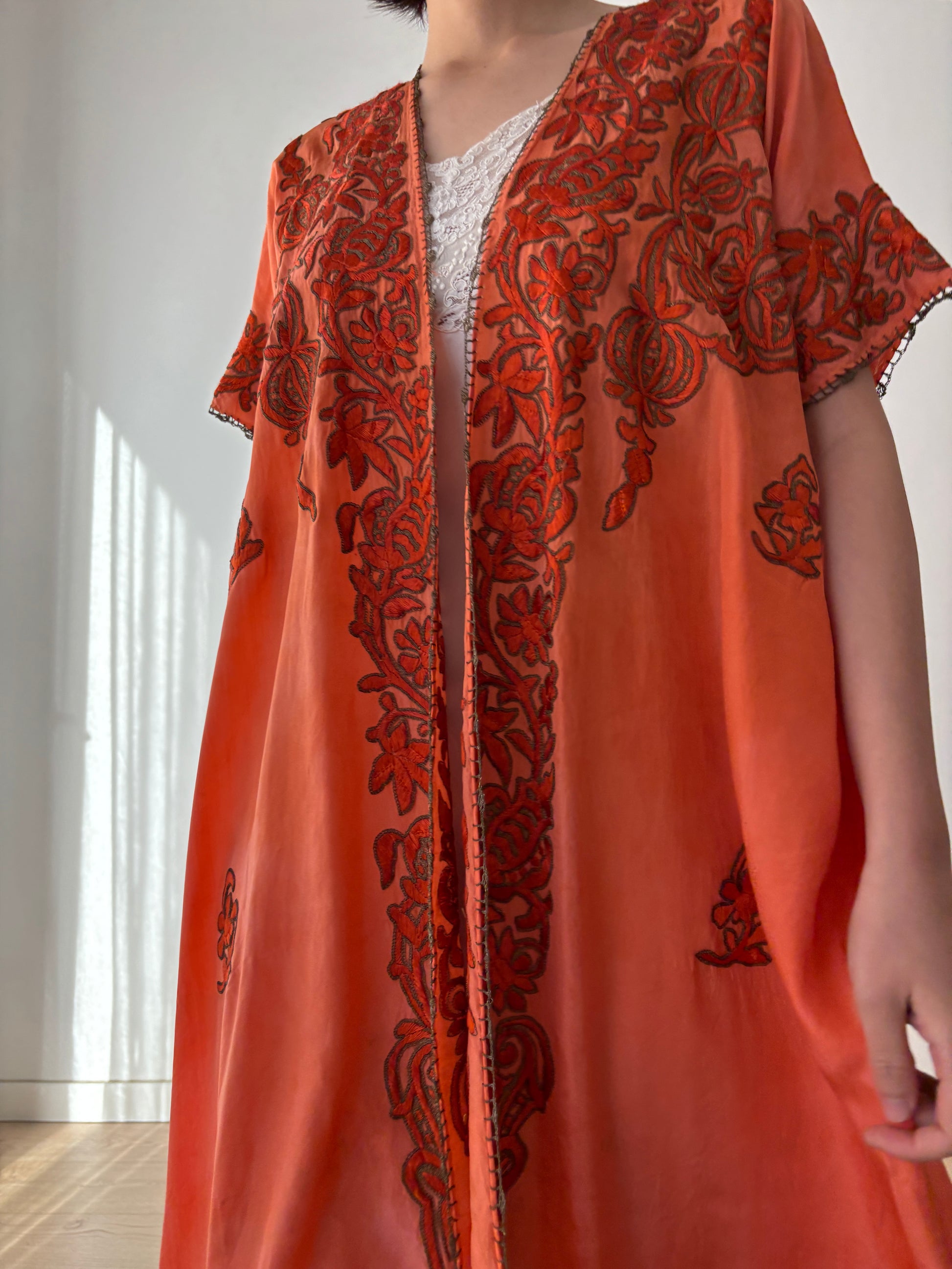 1900s 1910s Ottoman Embroidered Robe in Orange: Metallic Floral Hand Embroidery
