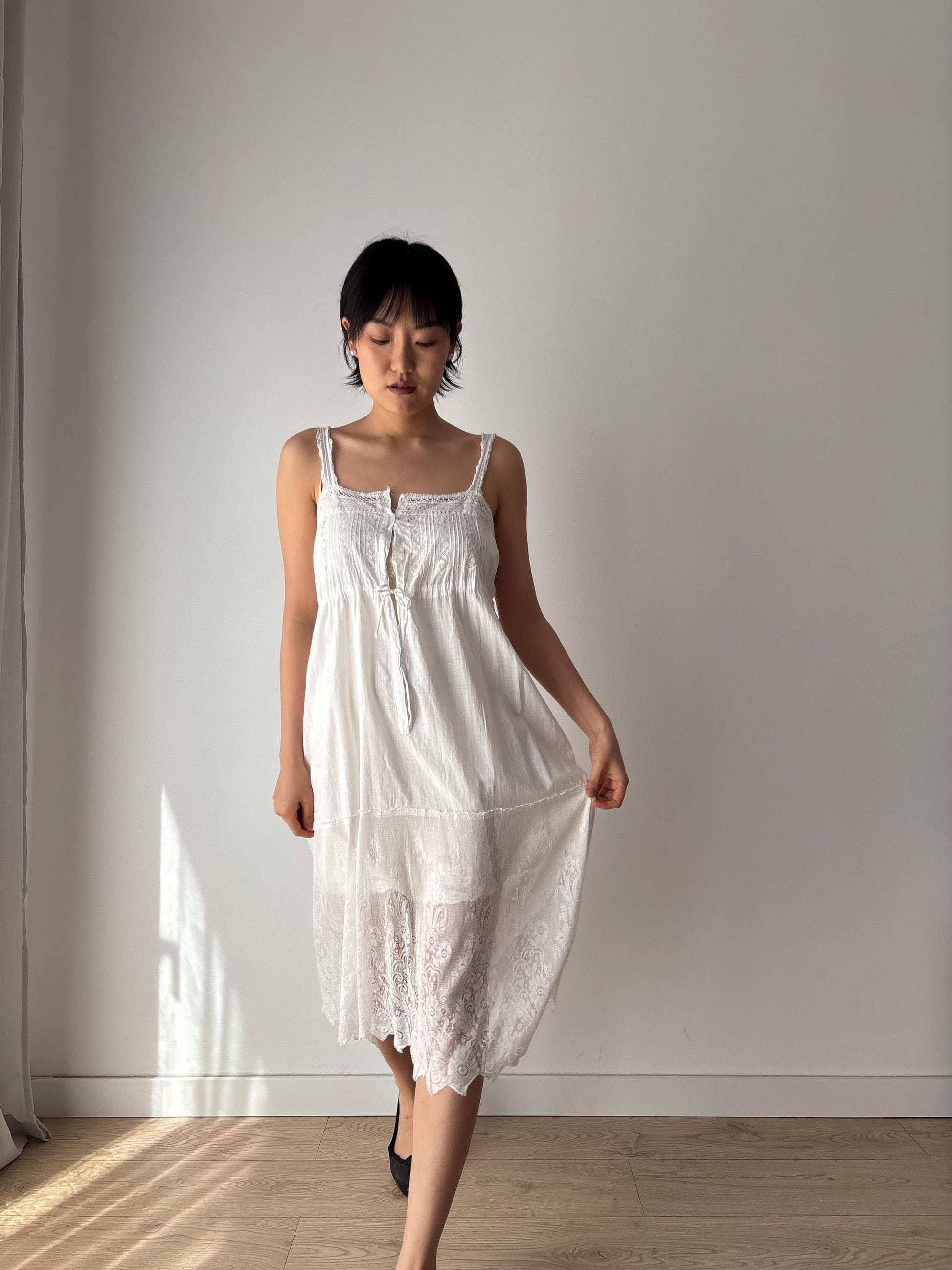 1910s 1900s Antique White Cotton Edwardian Victorian Lace Mini Slip Dress