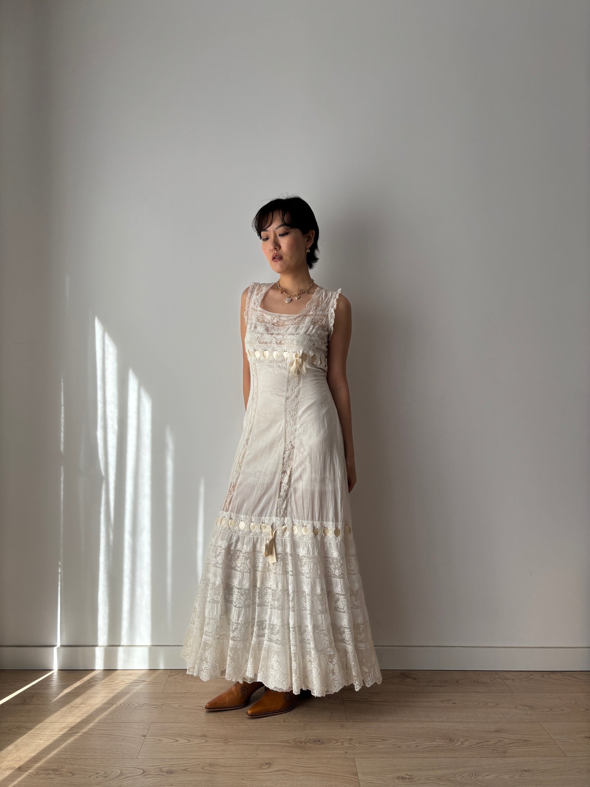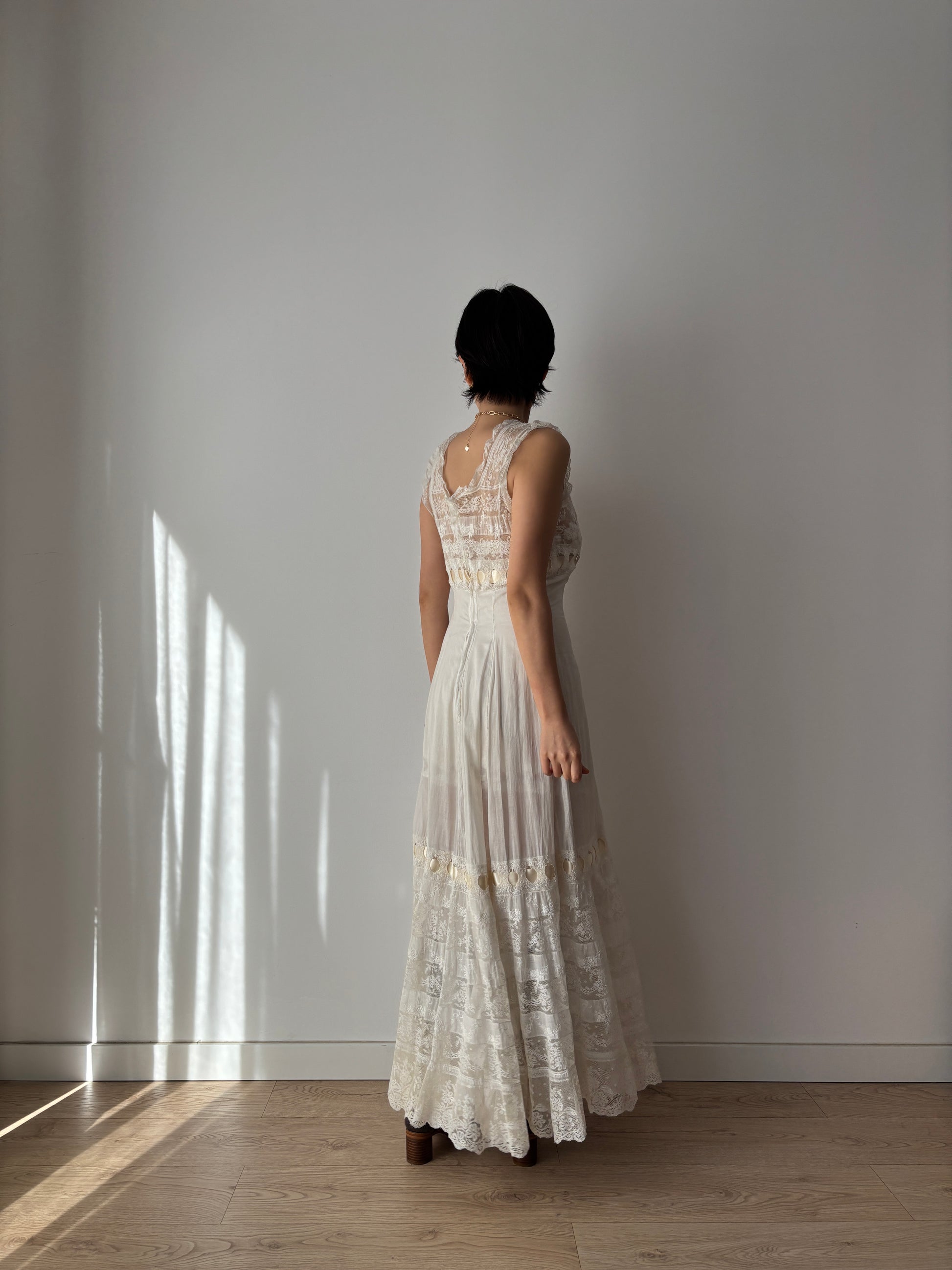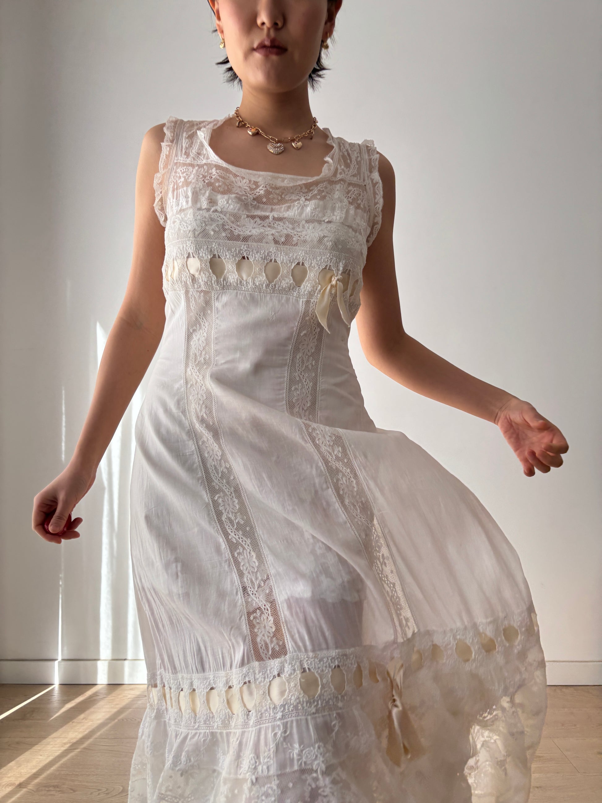 1910s Edwardian White Cotton Dress: French Handmade Lace & Floral Lawn Gown