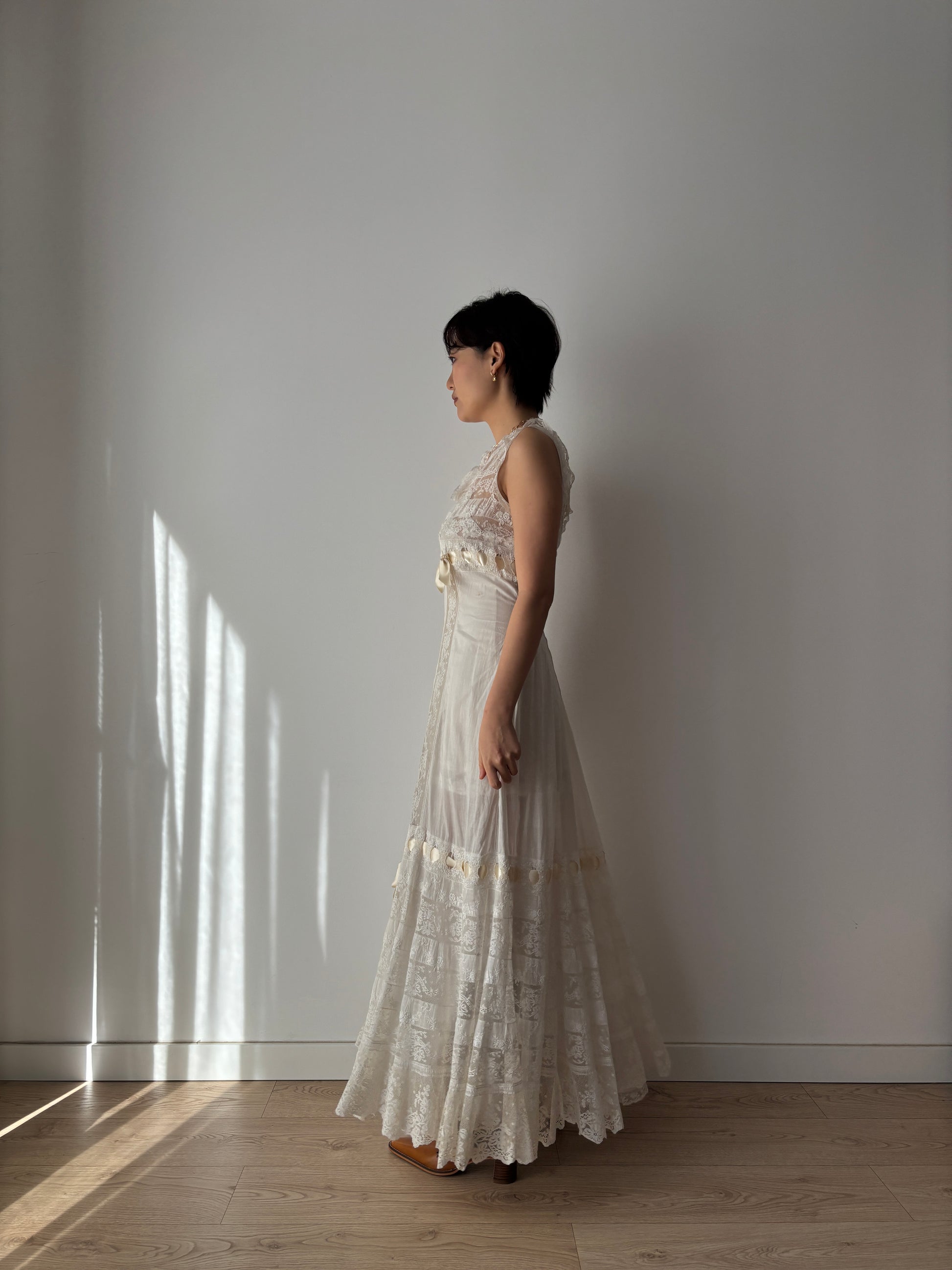 An exquisite and well-preserved Edwardian-era dress from the 1910s. Meticulously crafted from fine white cotton floral lawn and adorned with abundant French handmade lace and ruffled details. This rare find in a wearable size (modern S/M) is in excellent antique condition.