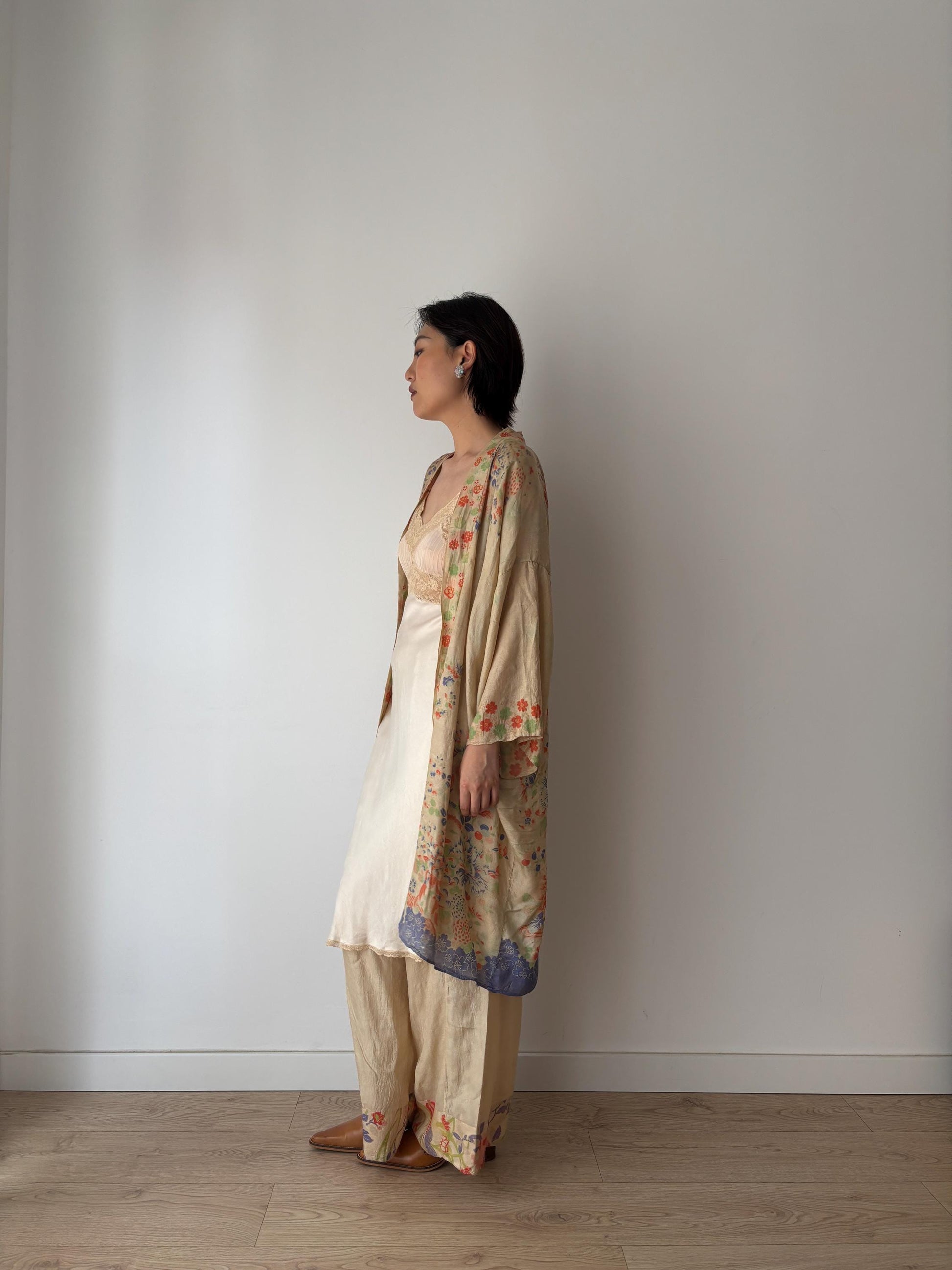 Dating from the 1930s and handmade in Japan for export, this is a rare and beautifully preserved matching kimono jacket and pants set. Crafted from fine thin silk, the fabric has been hand-painted and resist-dyed to create elegant floral motifs in soft yet vibrant tones, with detailed borders. It’s especially rare to find both the jacket and pants together as a complete set. The pants are unstructured and has an elastic band at the back of the waist, allowing them to fit a range of sizes. The kimono jacket has a relaxed, open fit. be noted the inner slip is not included for sale
