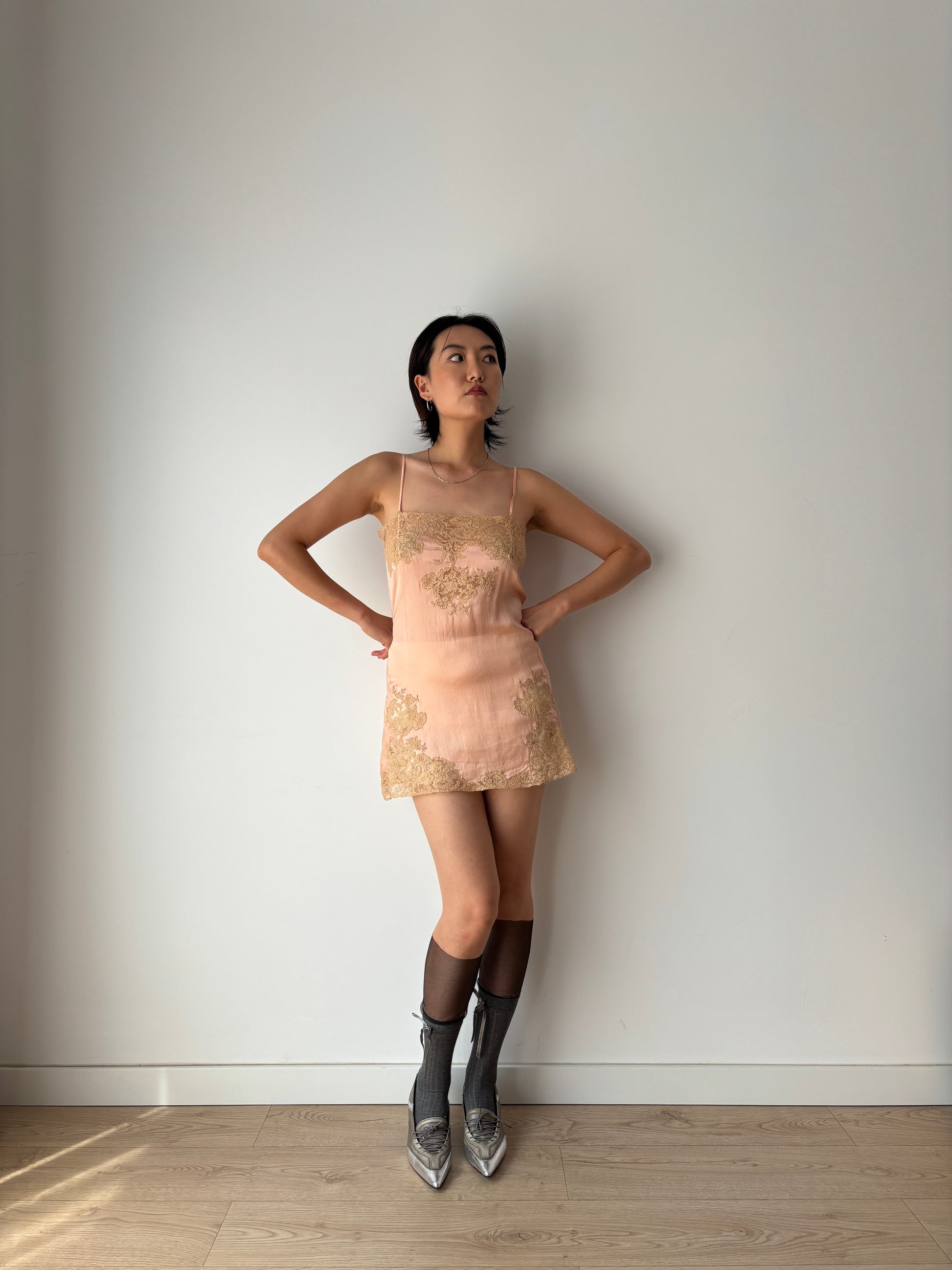 1920s Antique Peach Pink Flower Lace Embroidered Silk Satin mini dress / top