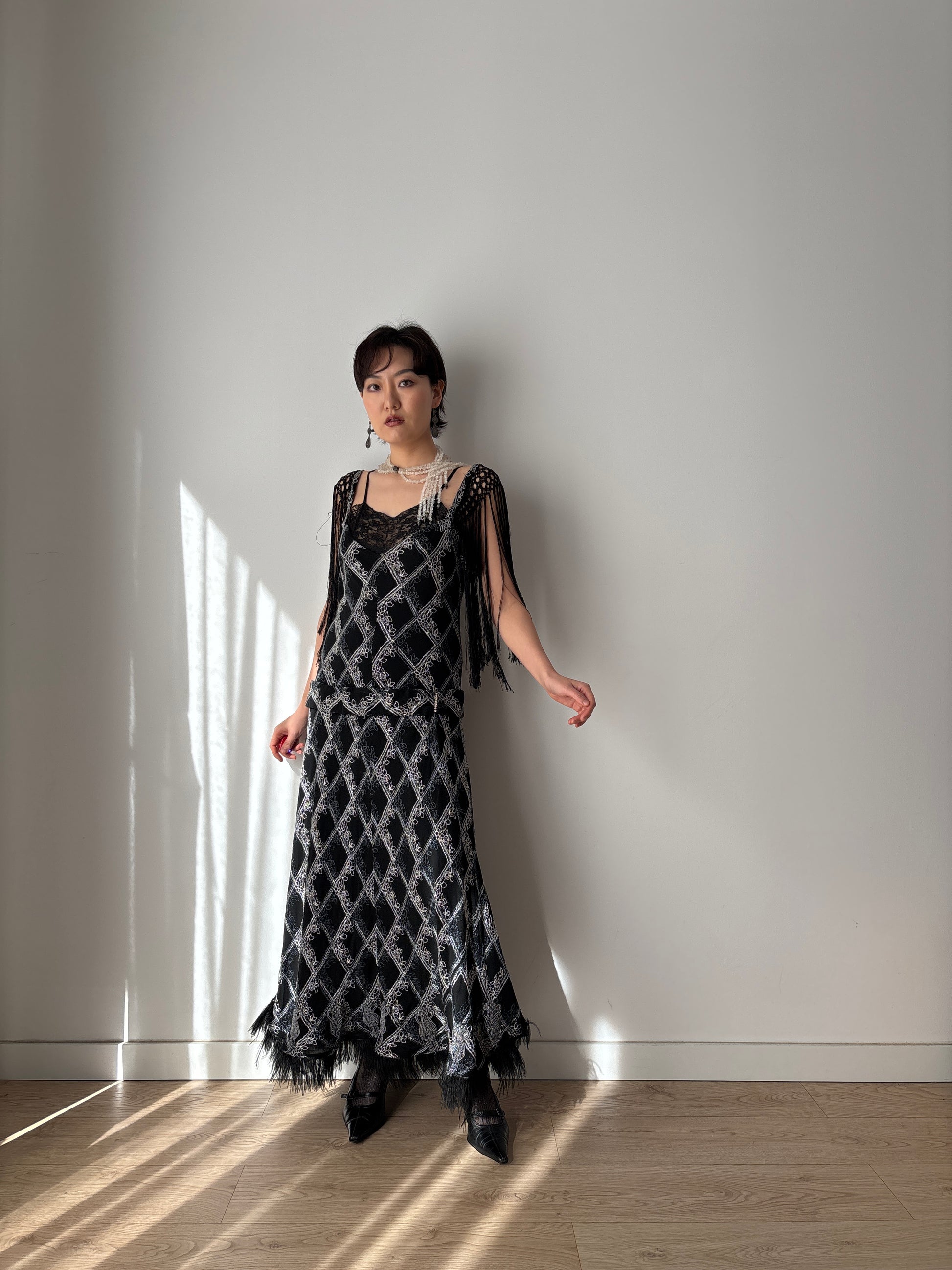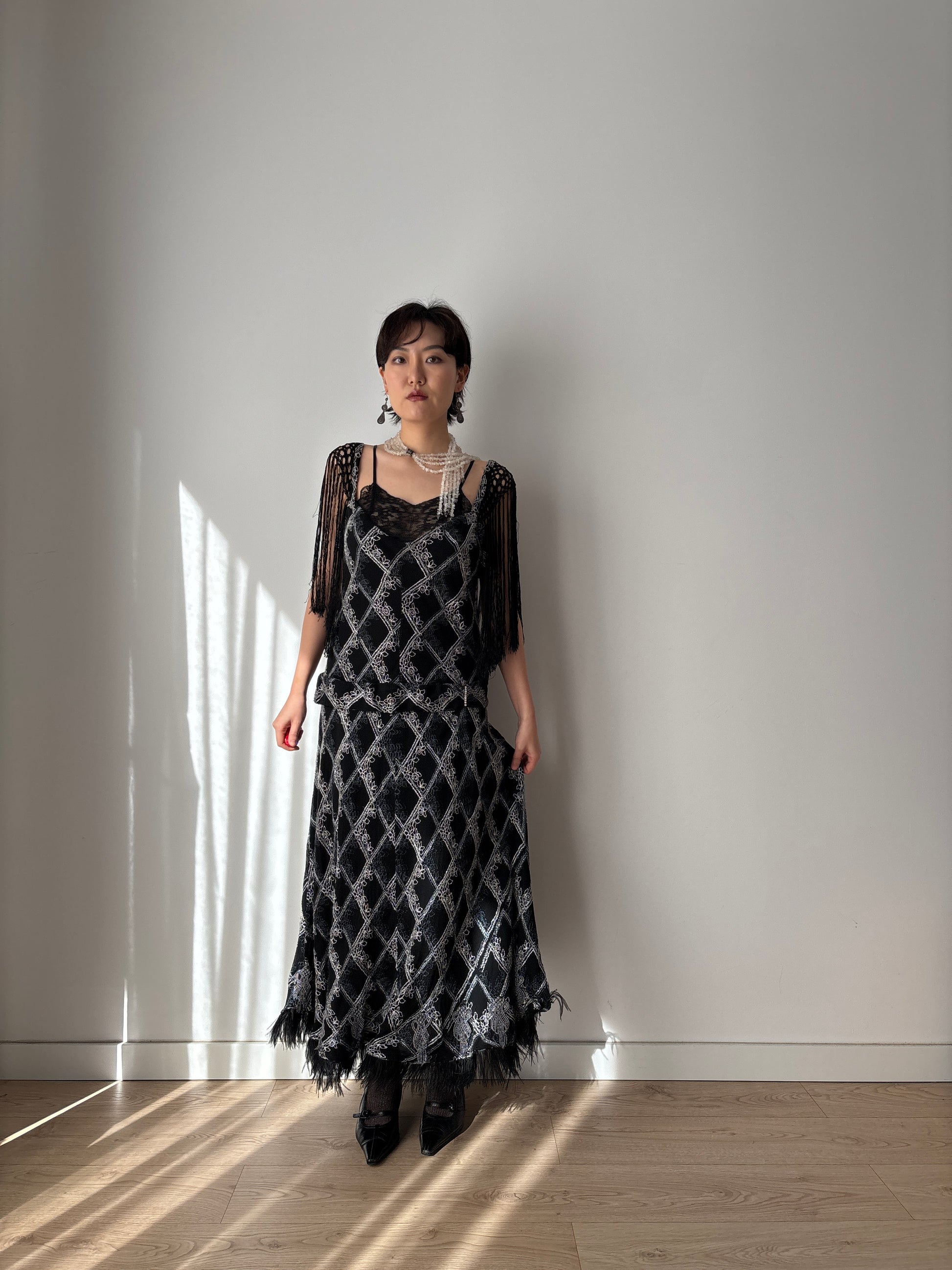 1920s Black Silk Crepe Evening Dress: Fringed Shoulder & Feather Hem