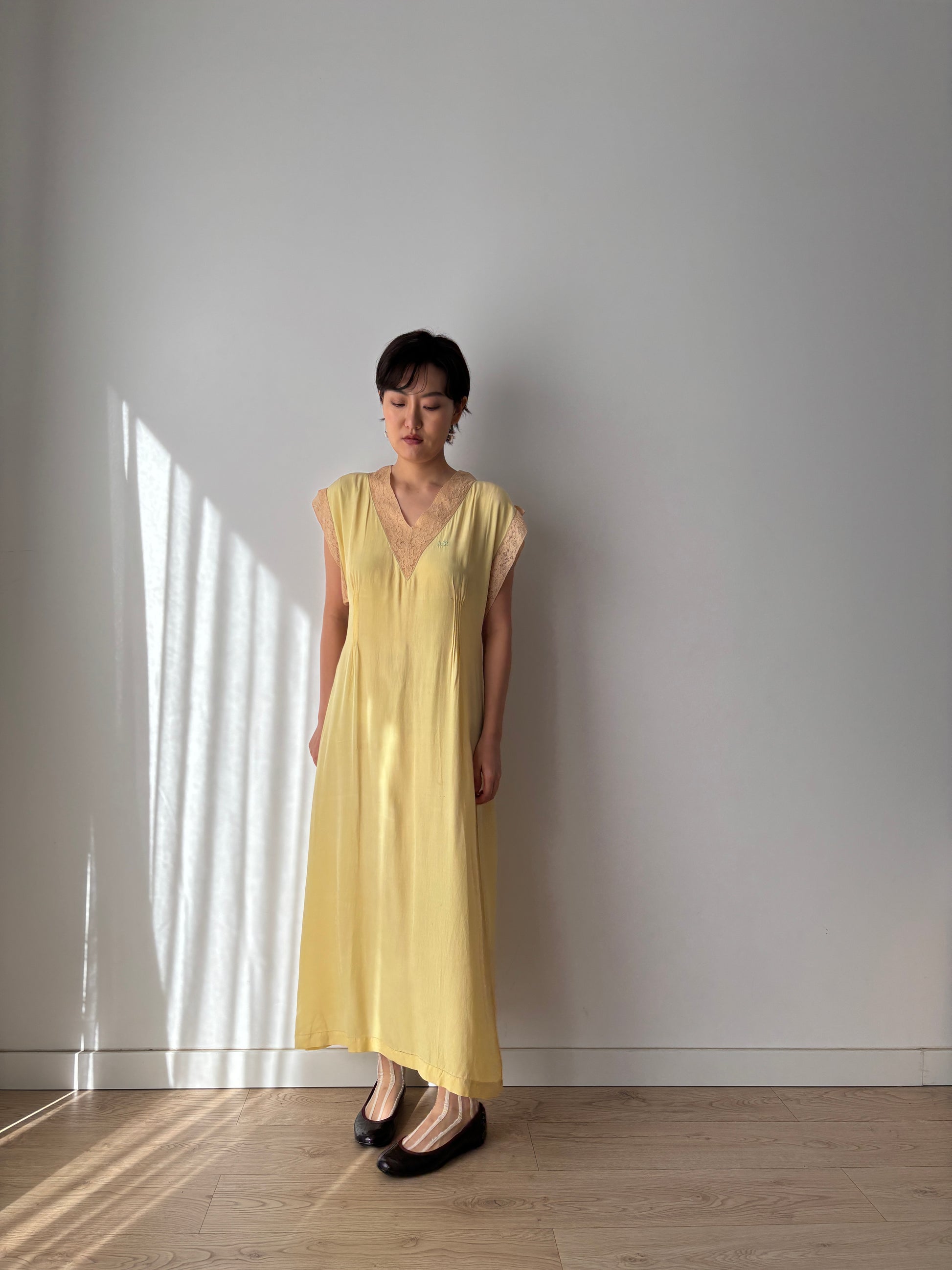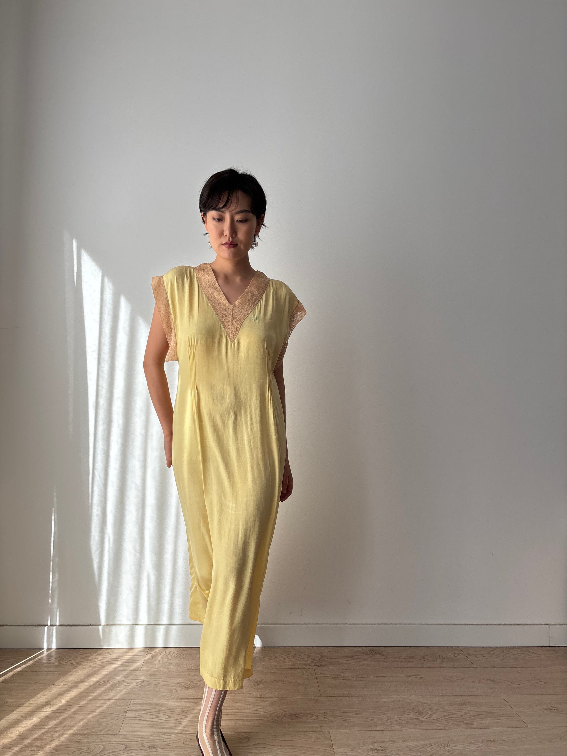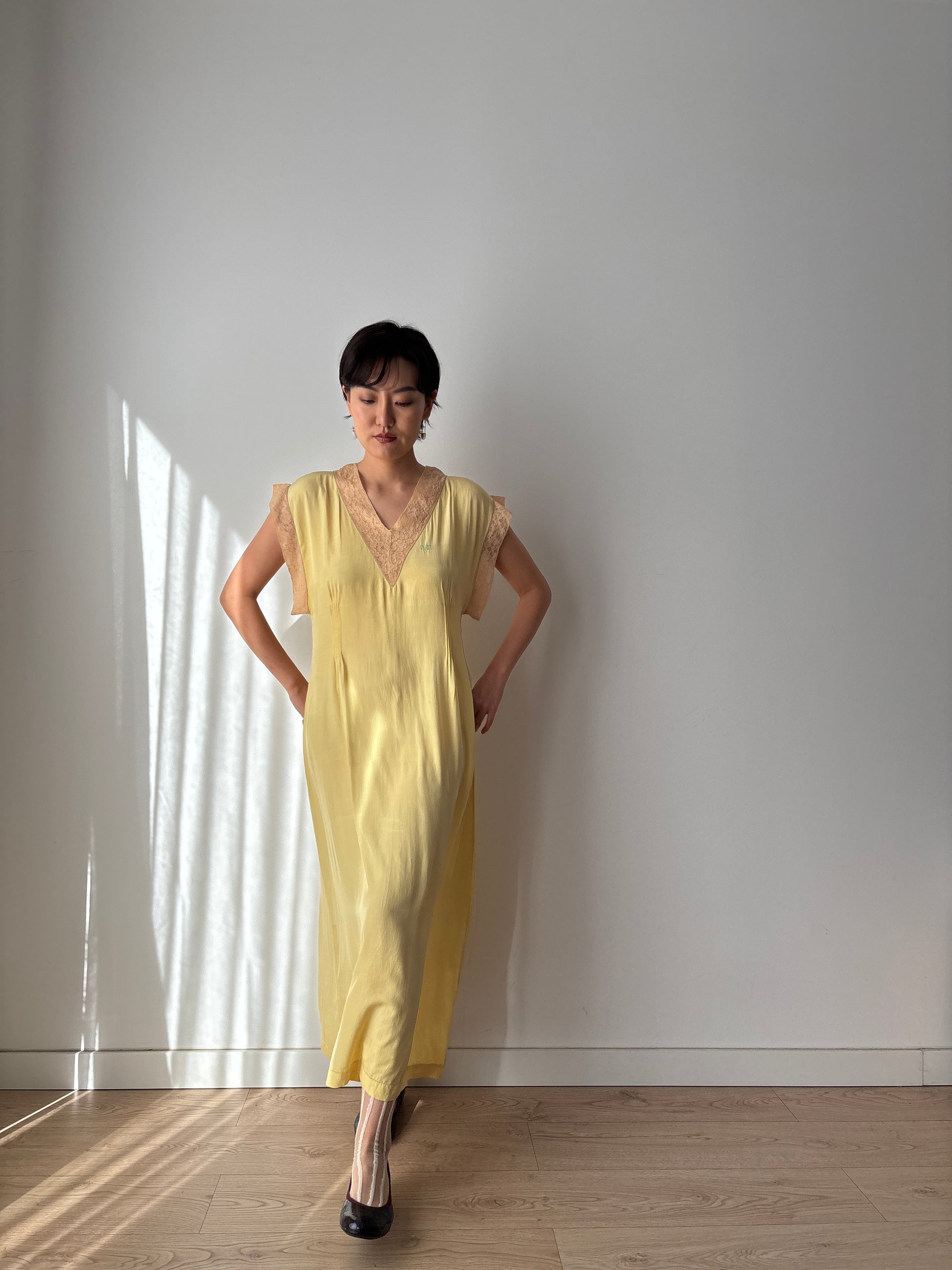 1920s Embroidered Silk Nightgown in Yellow: Long Slip Dress