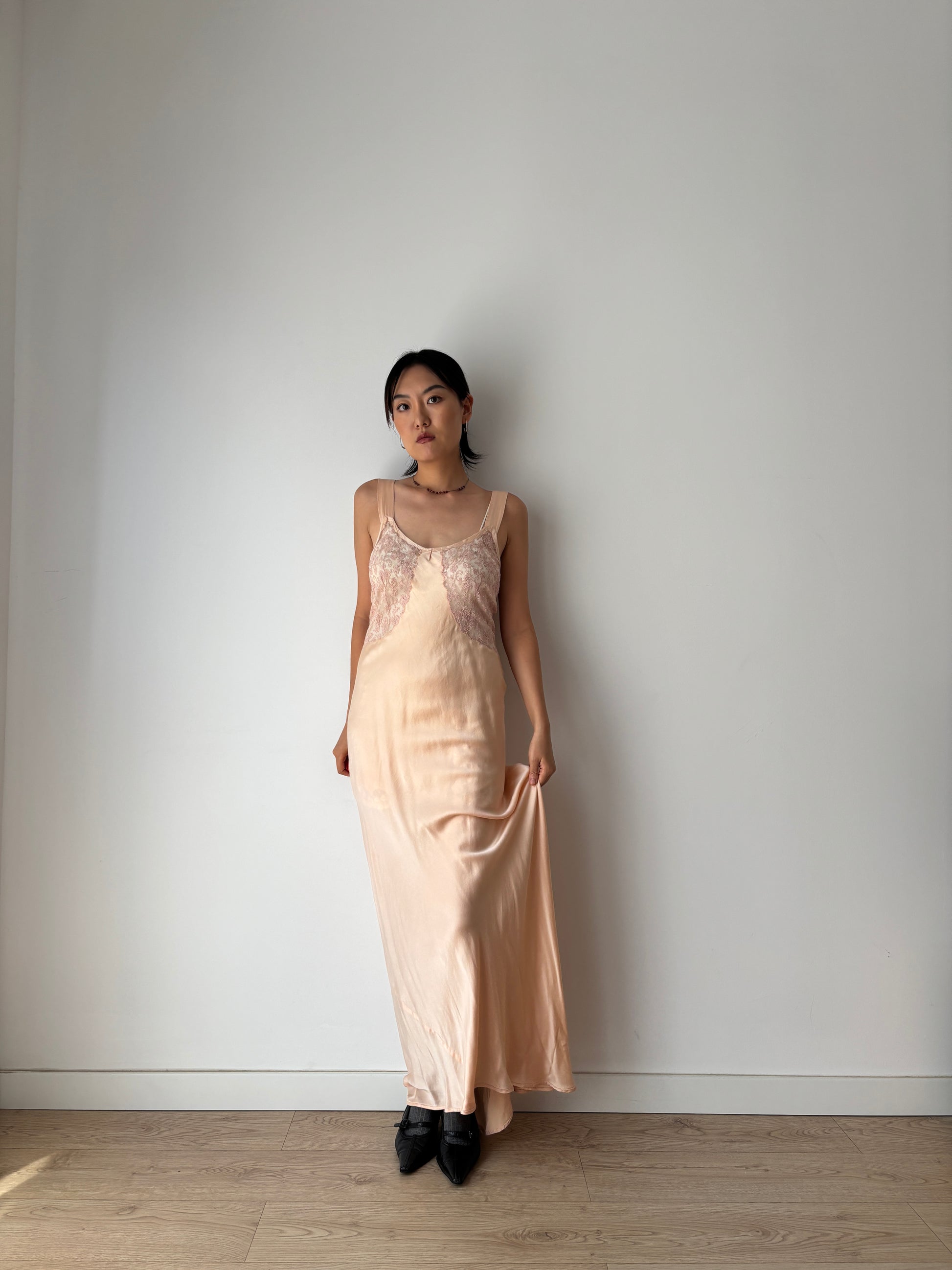 Vintage retro 1930s 1920s lace peach pink bias cut silk dress