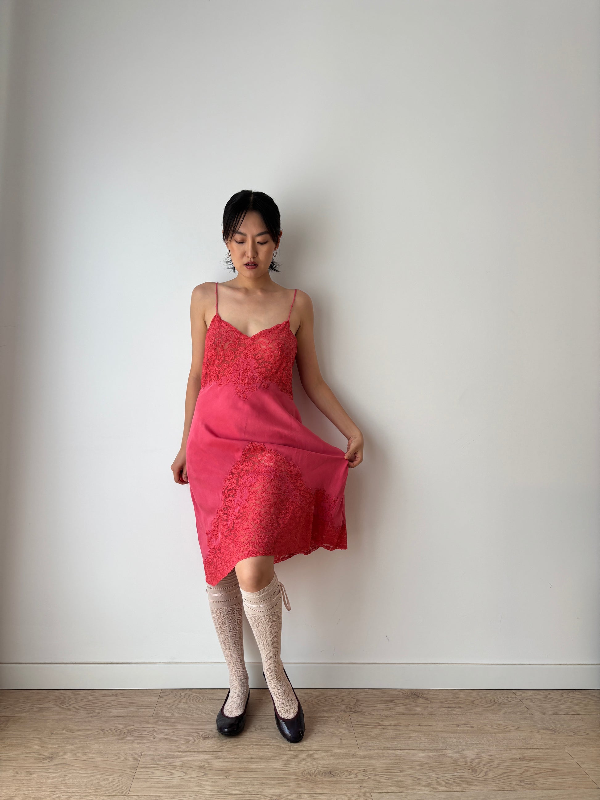 1930s 1920s Antique rare red rich lace liquid pure silk satin bridal slip dress