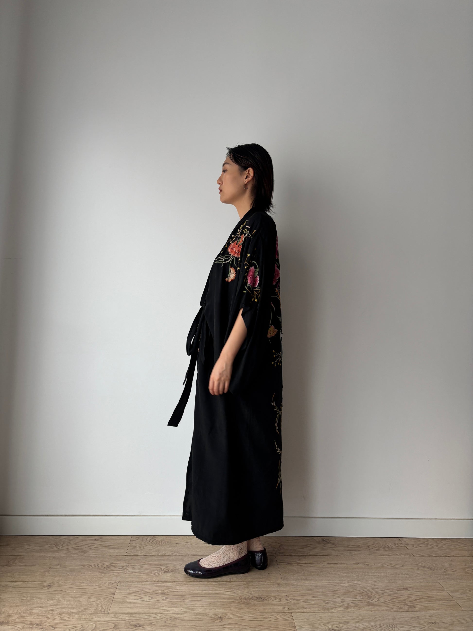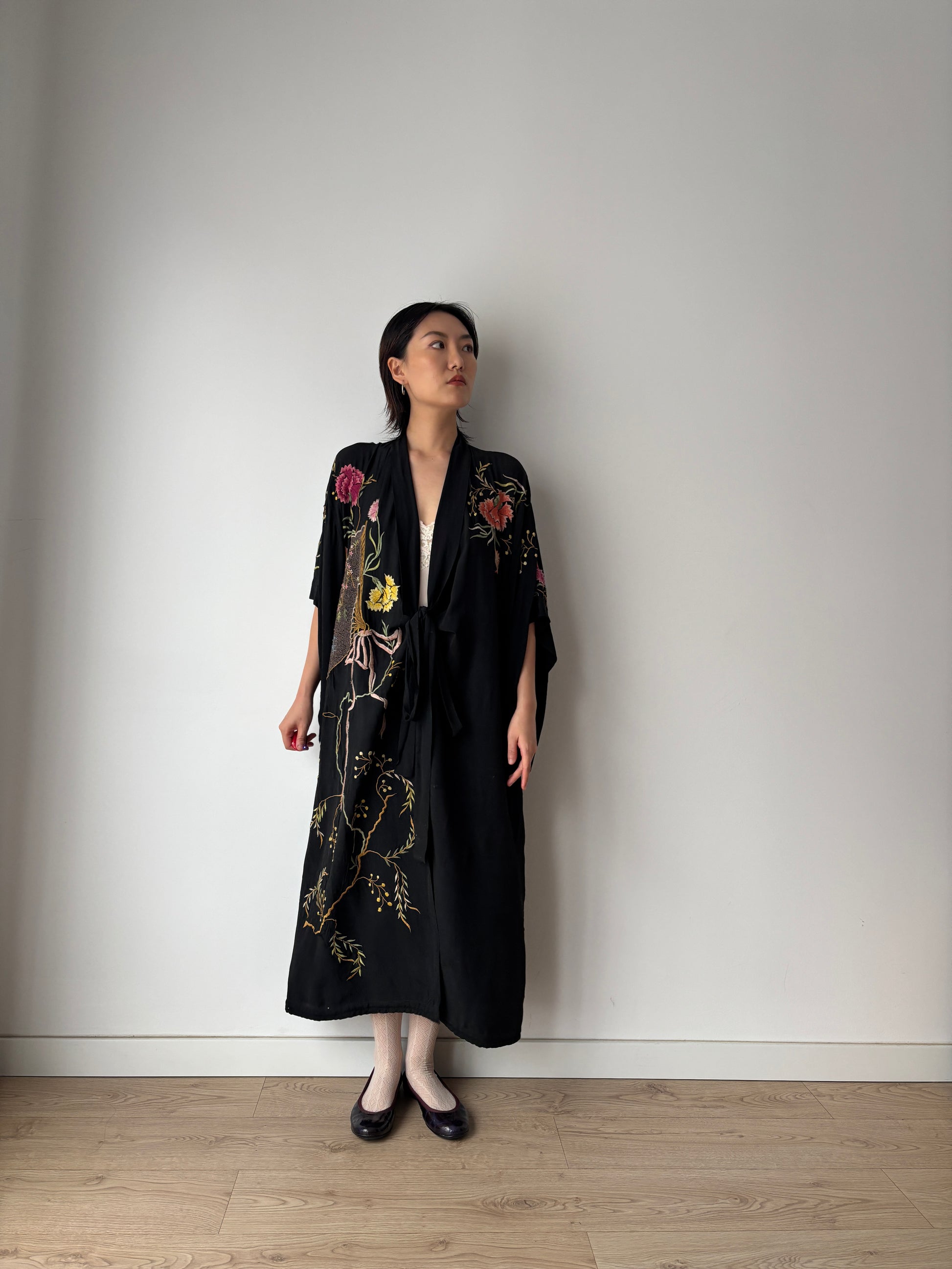 An original Japanese kimono robe with vivid, hand embroidery dating to the late 1920s, early 1930s.