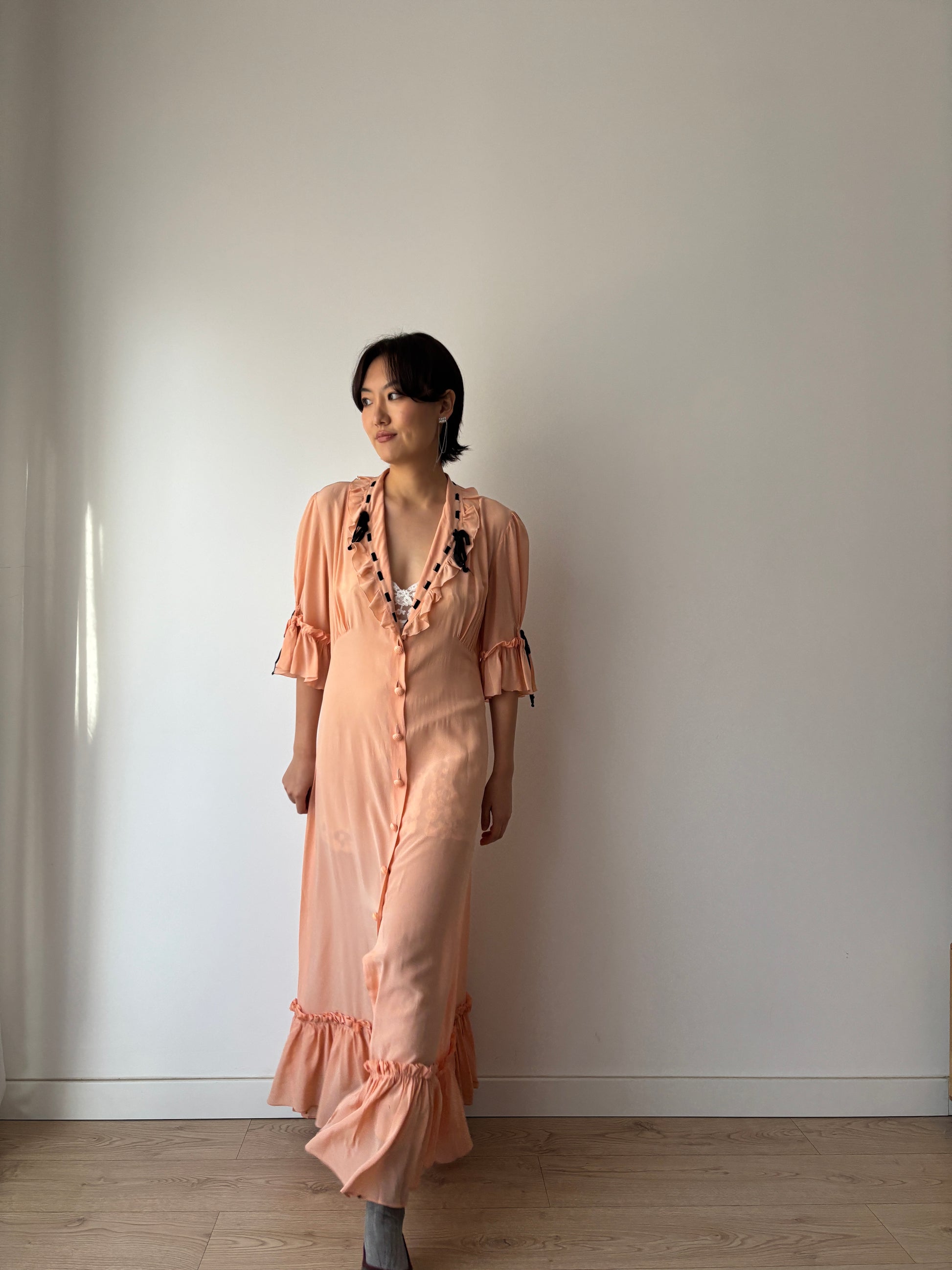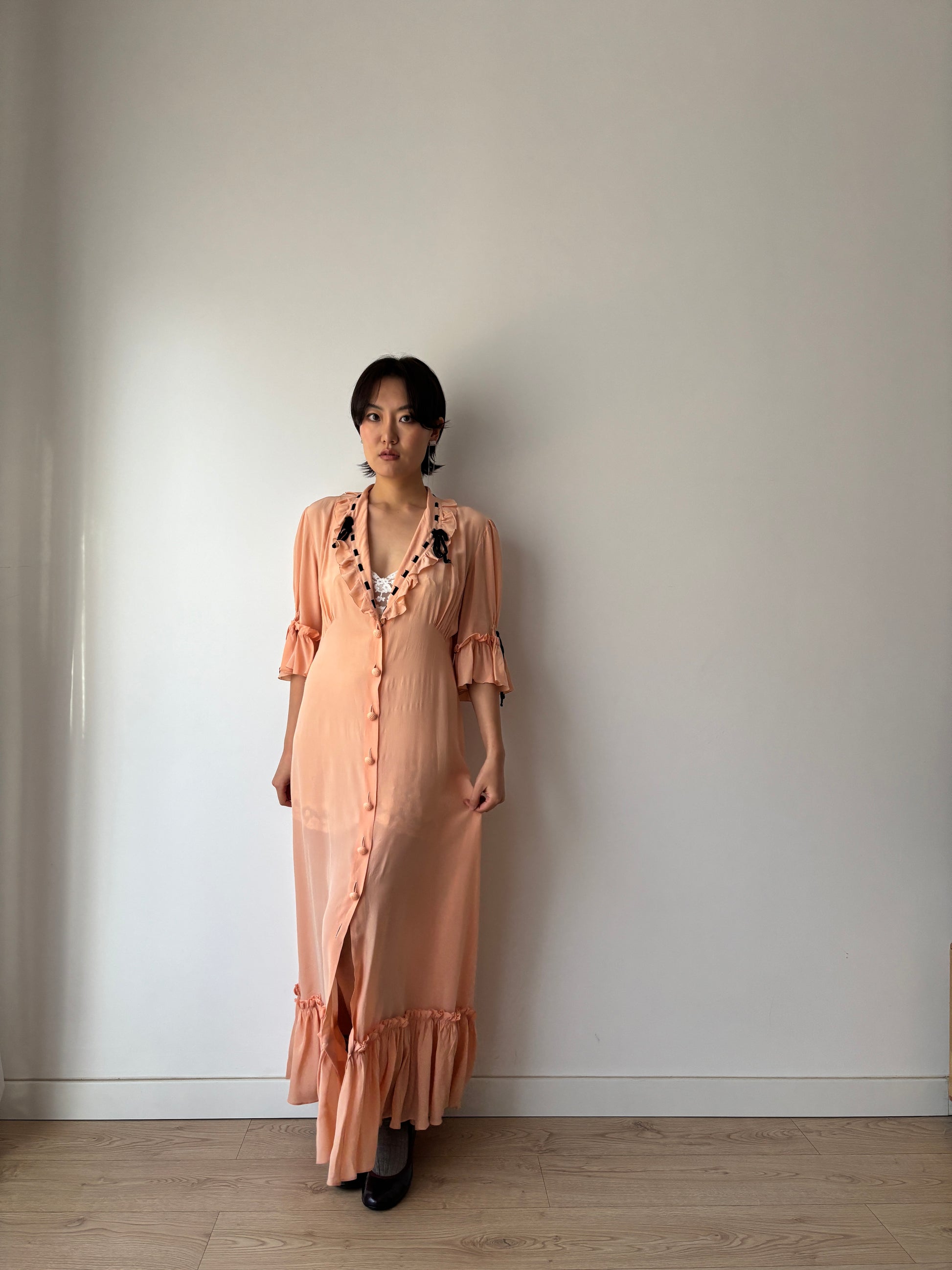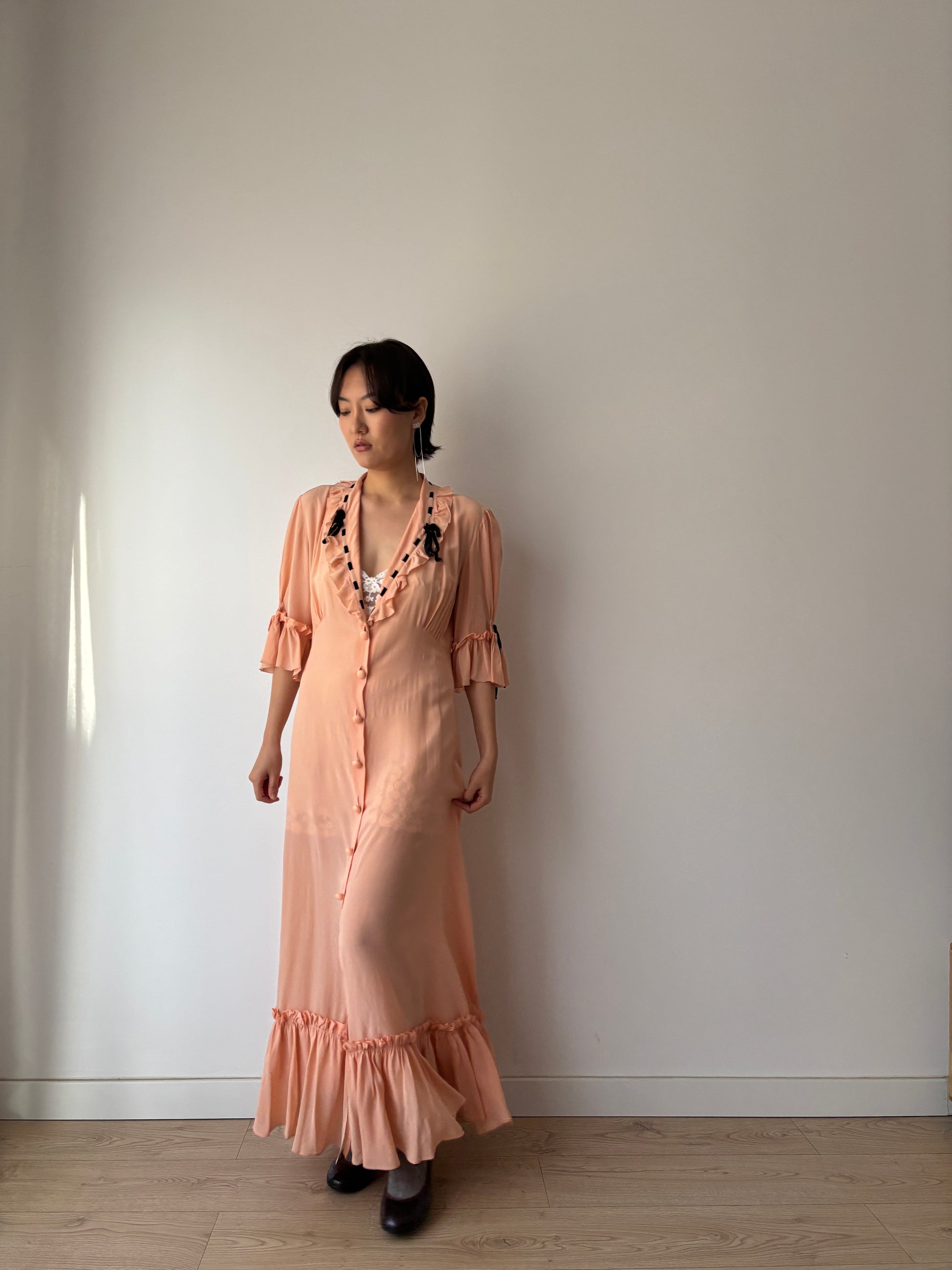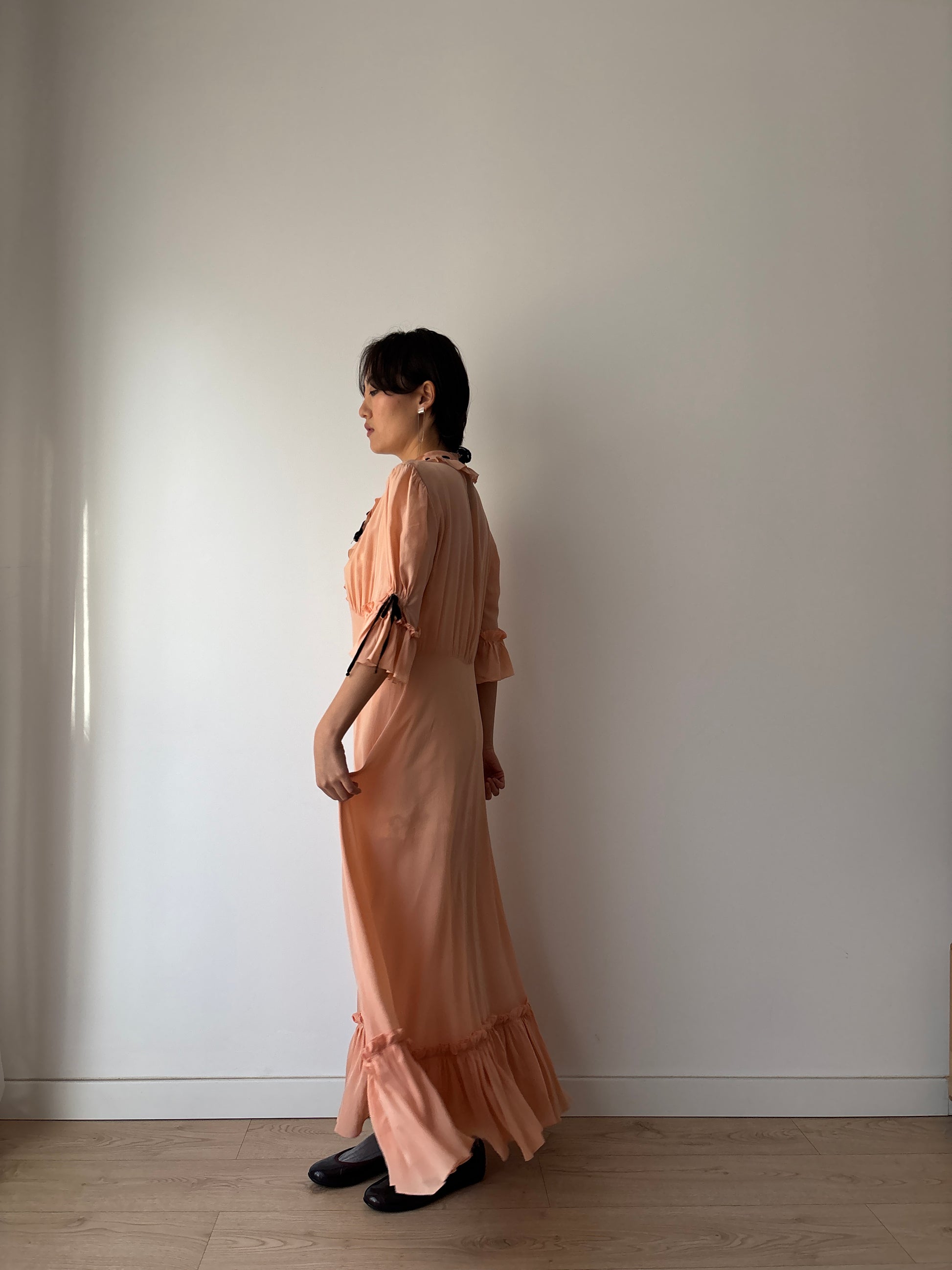 Antique rare pale pink pure silk bow lace dress with black ribbon and ruffled bottom