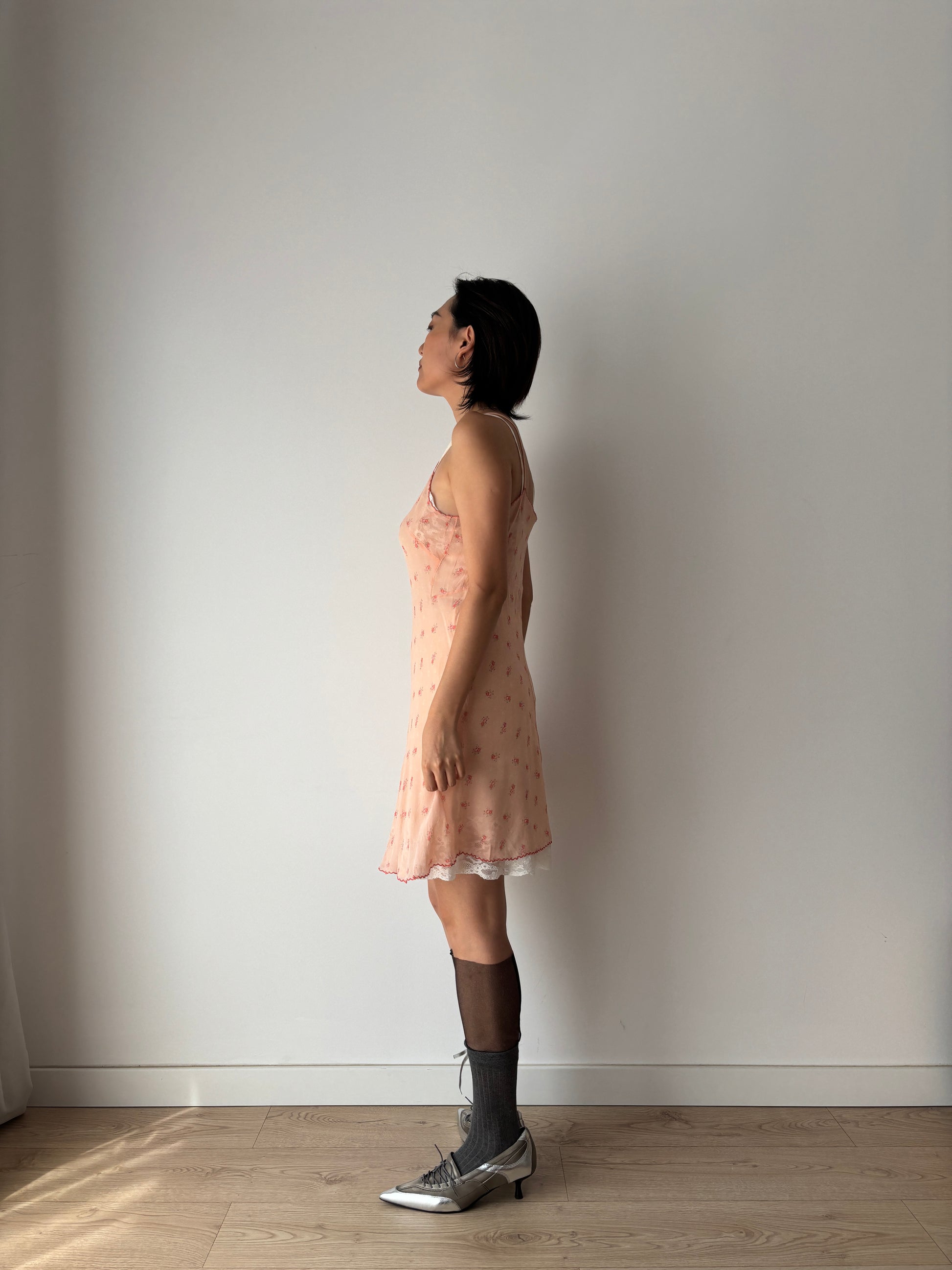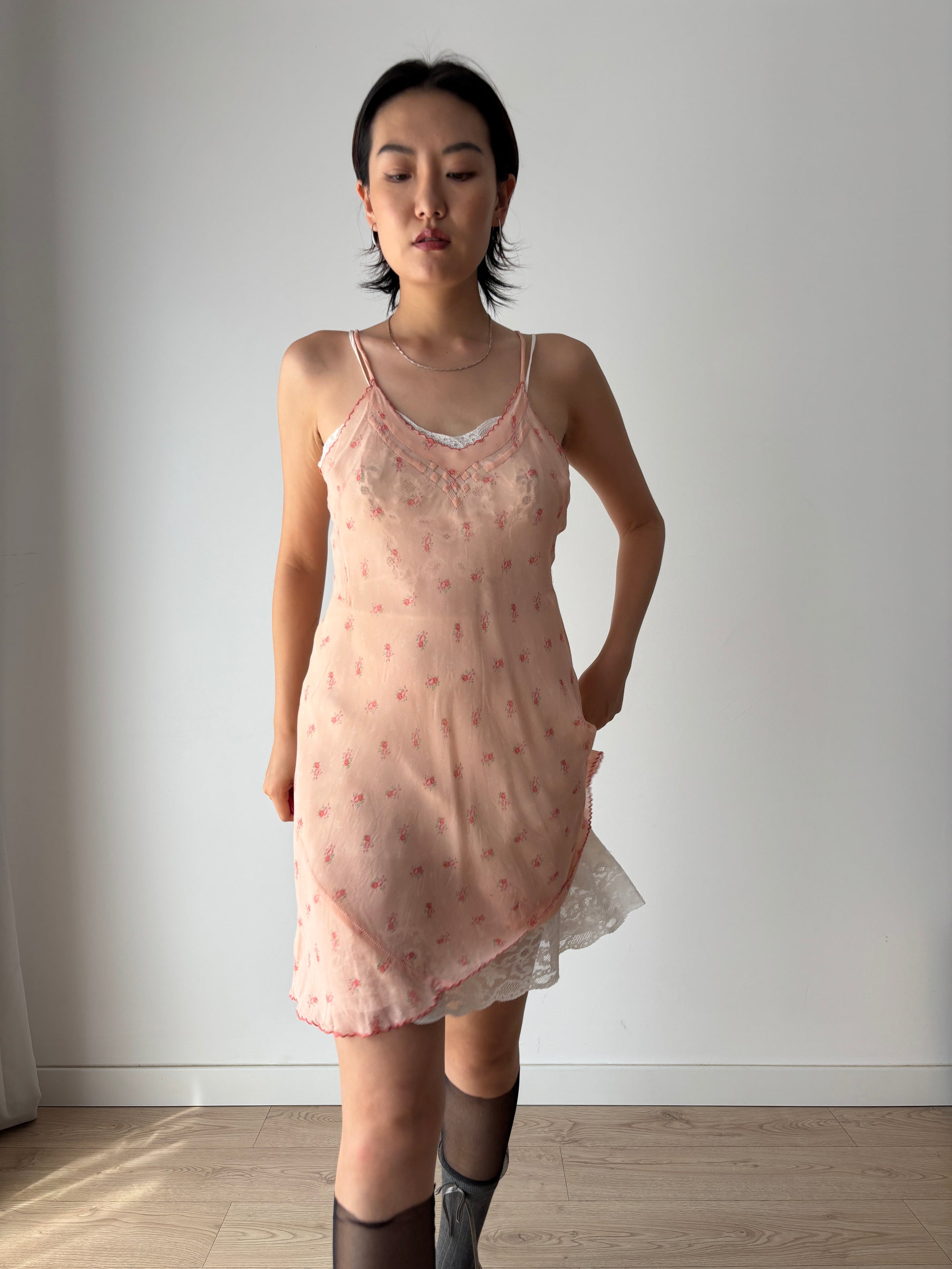 Vintage 1930s pink floral print translucent slip dress made of pure silk chiffon
