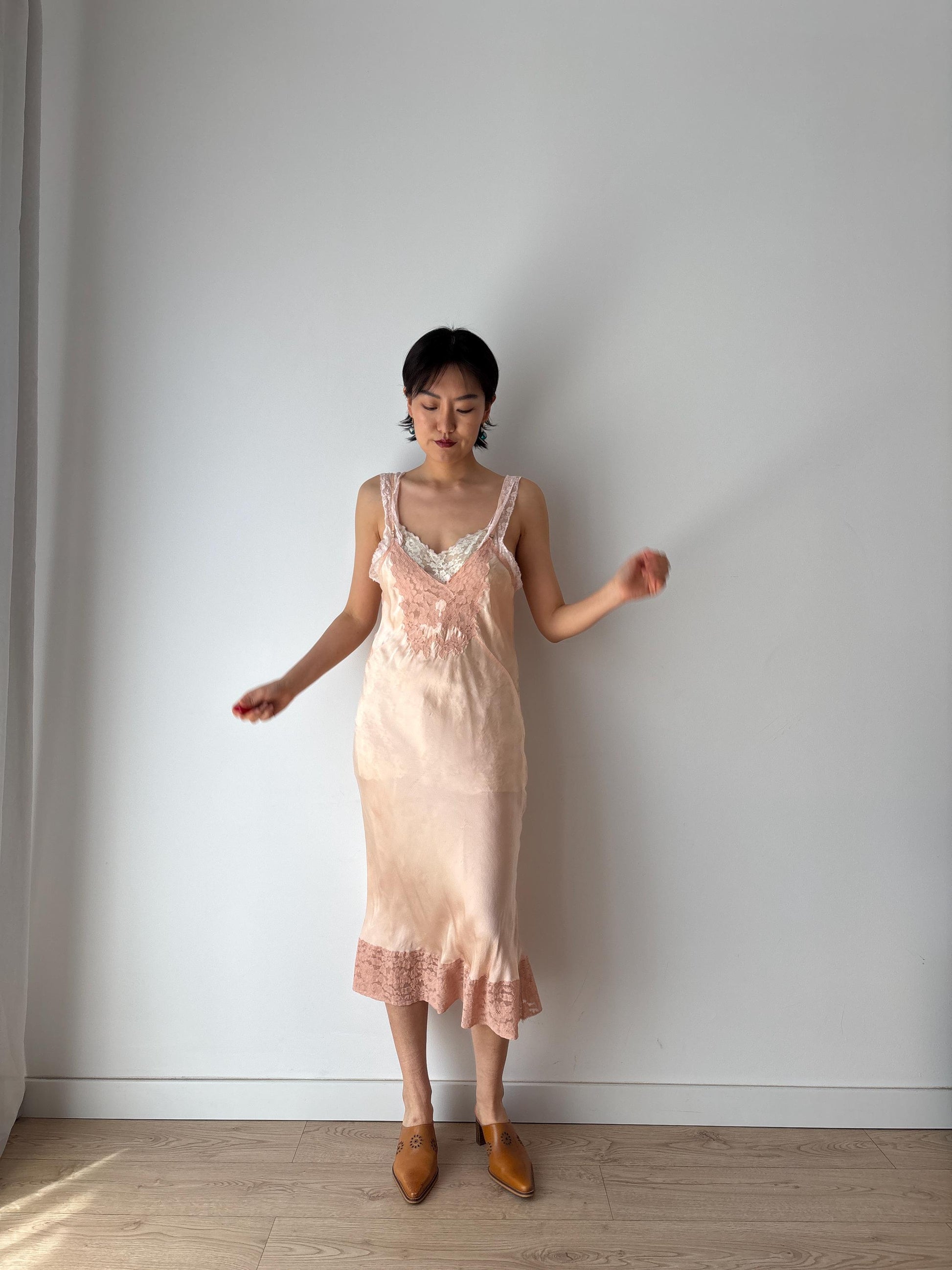 1930s 1940s Antique Pink Lace Liquid Silk Slip Romantic dress, Vintage lace mini dress