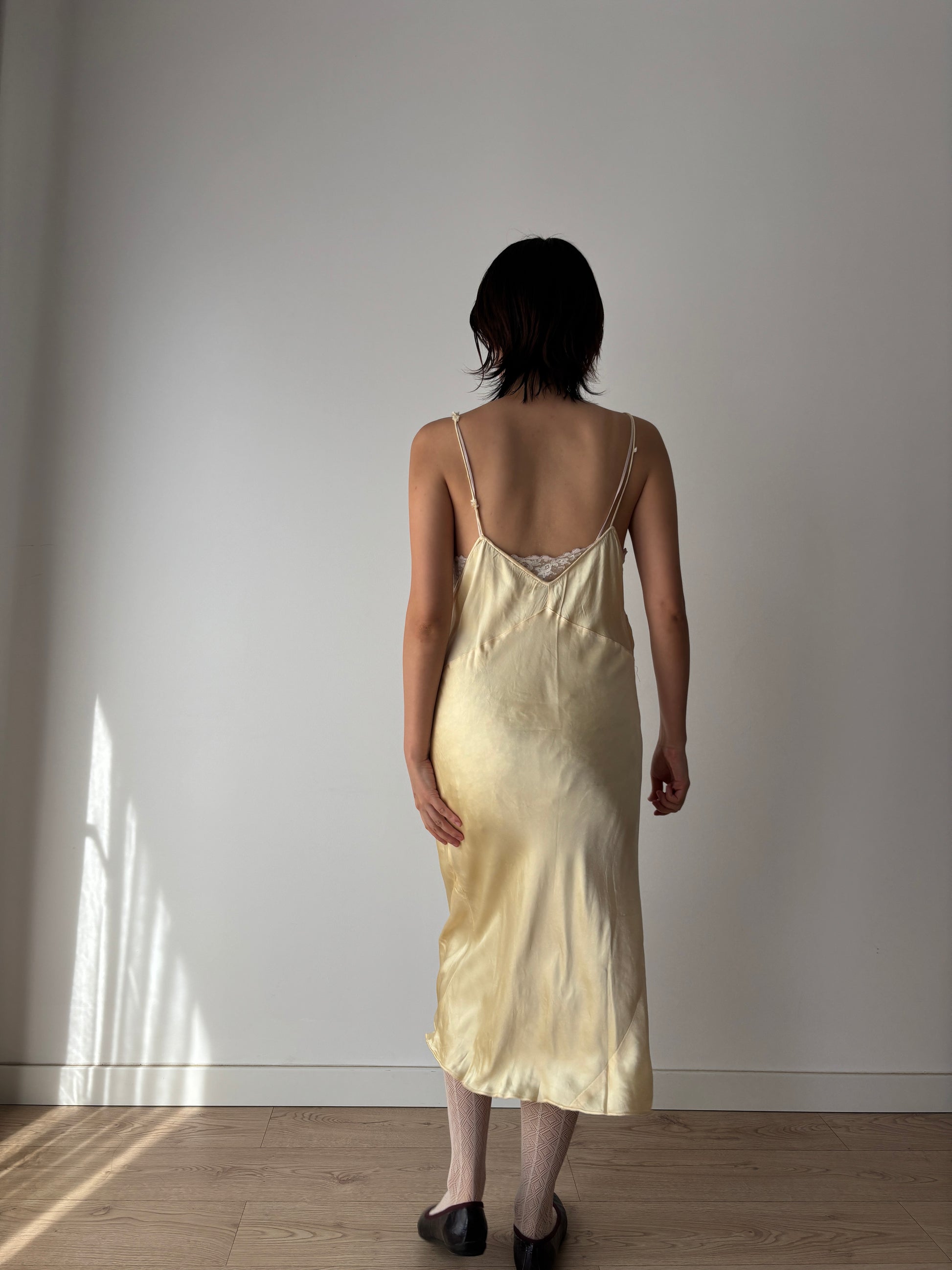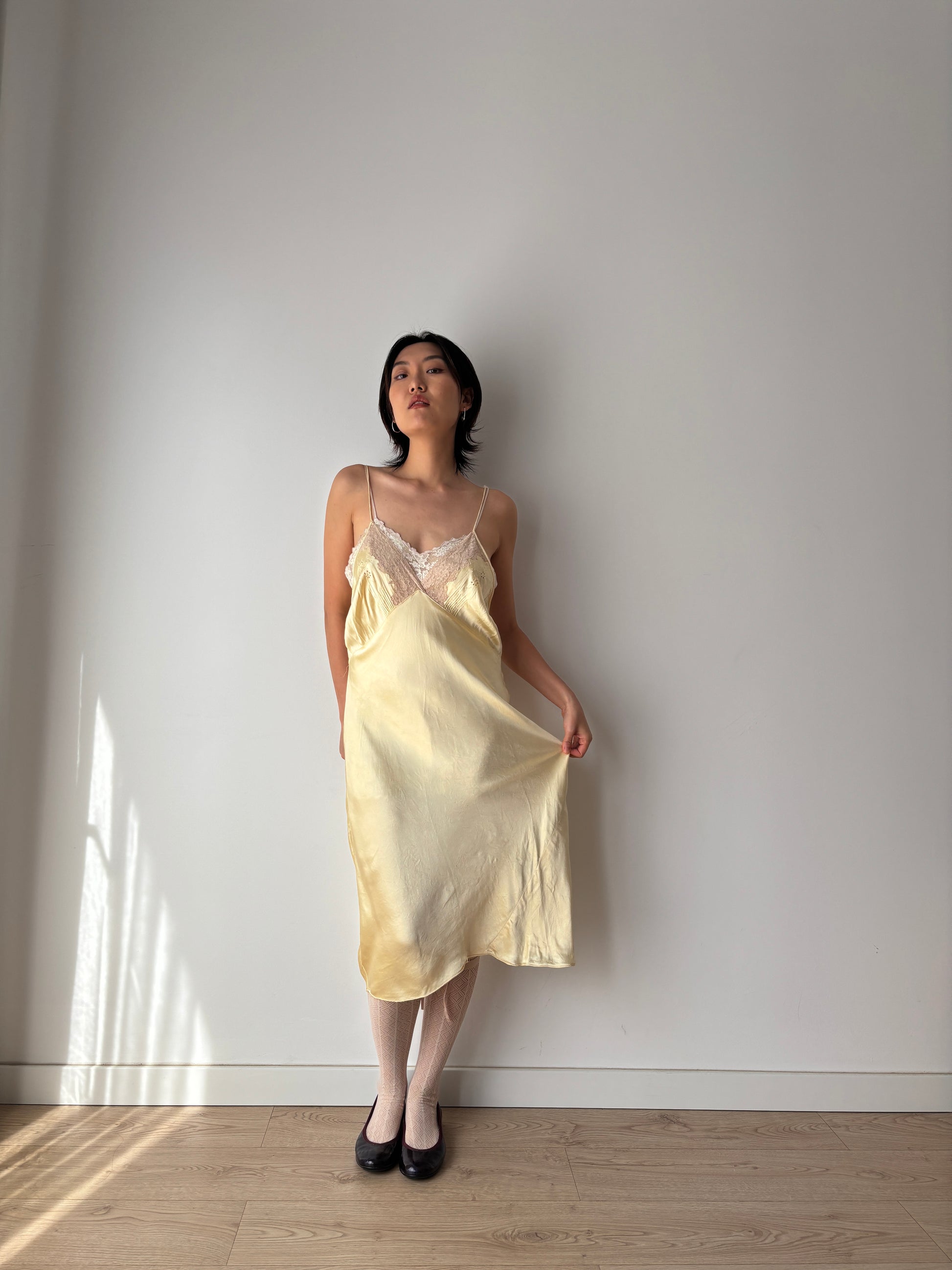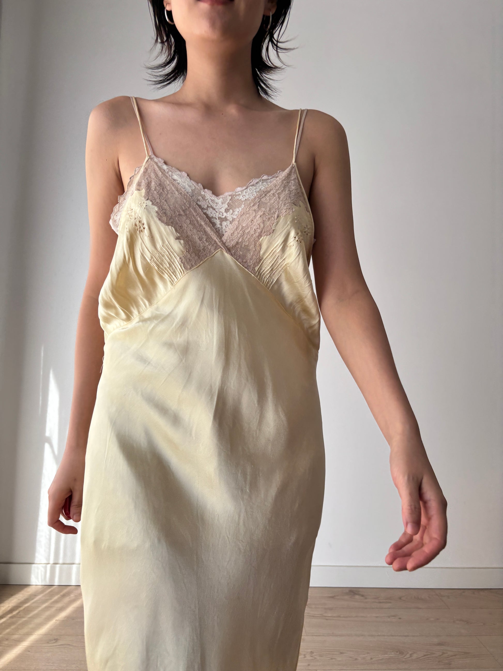 1930s–1940s Antique Yellow Silk Slip Dress – Liquid Silk Mini with Lace