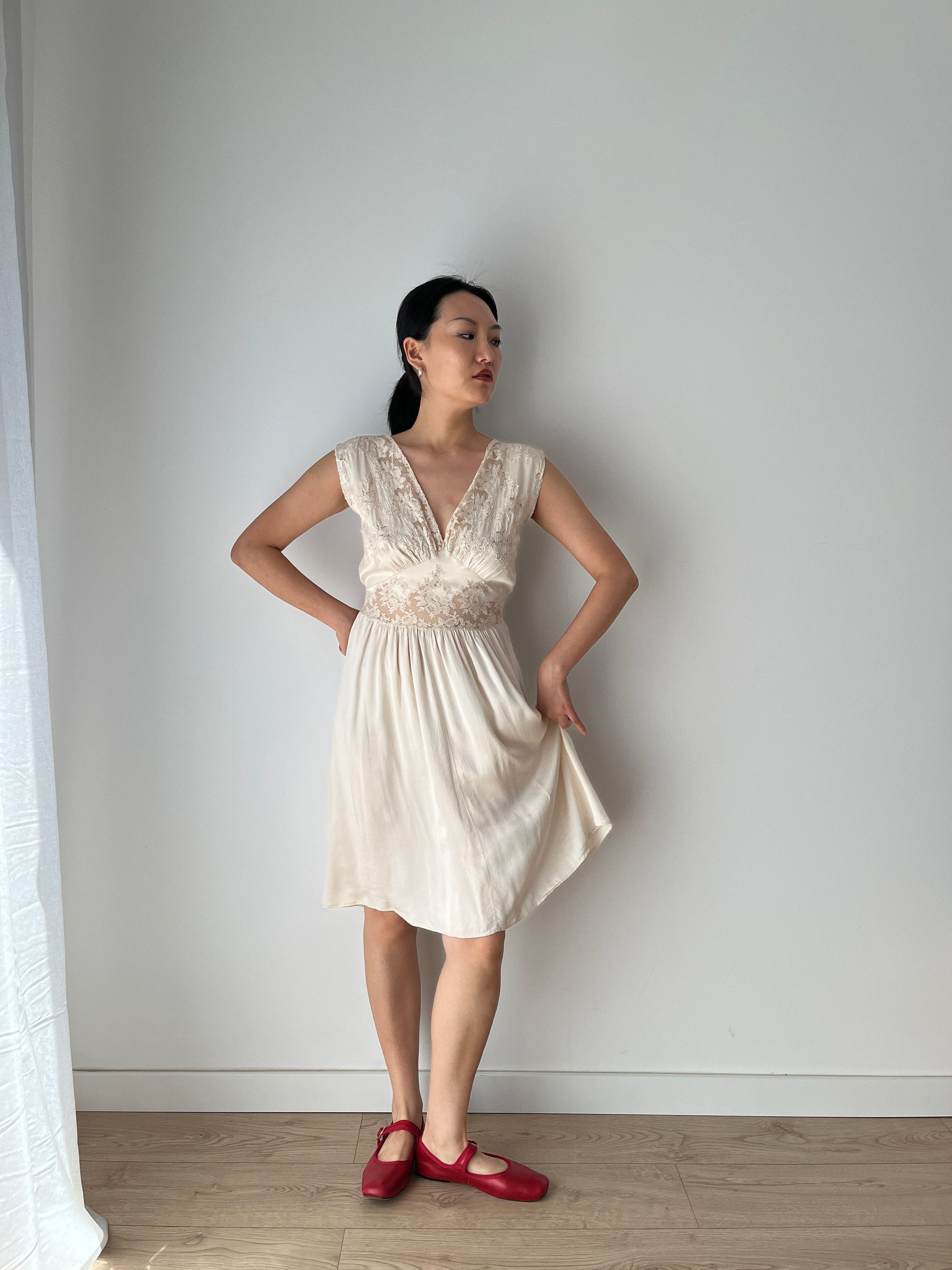 1930s Antique Beige White Lace Liquid Silk Satin Slip dress