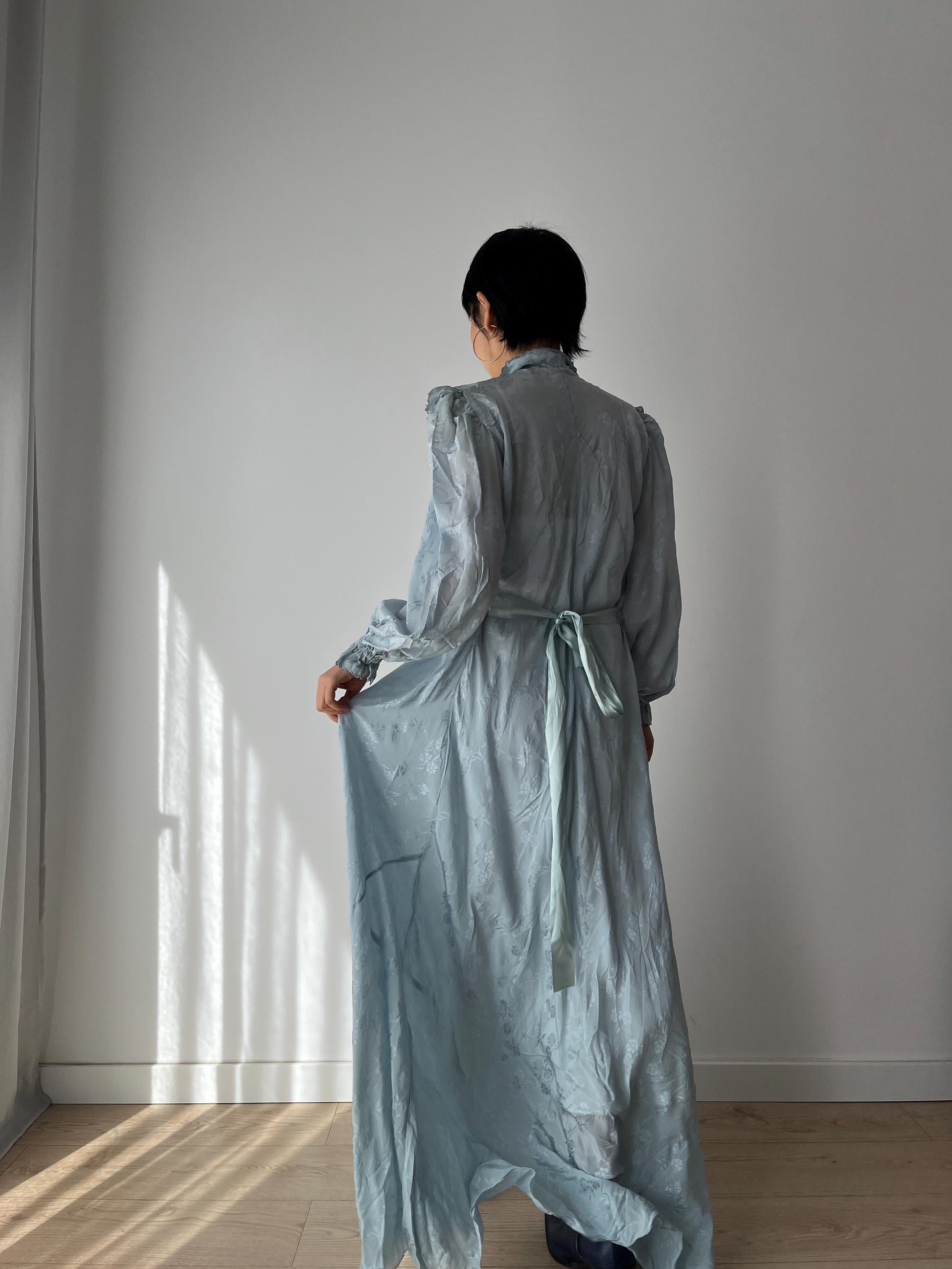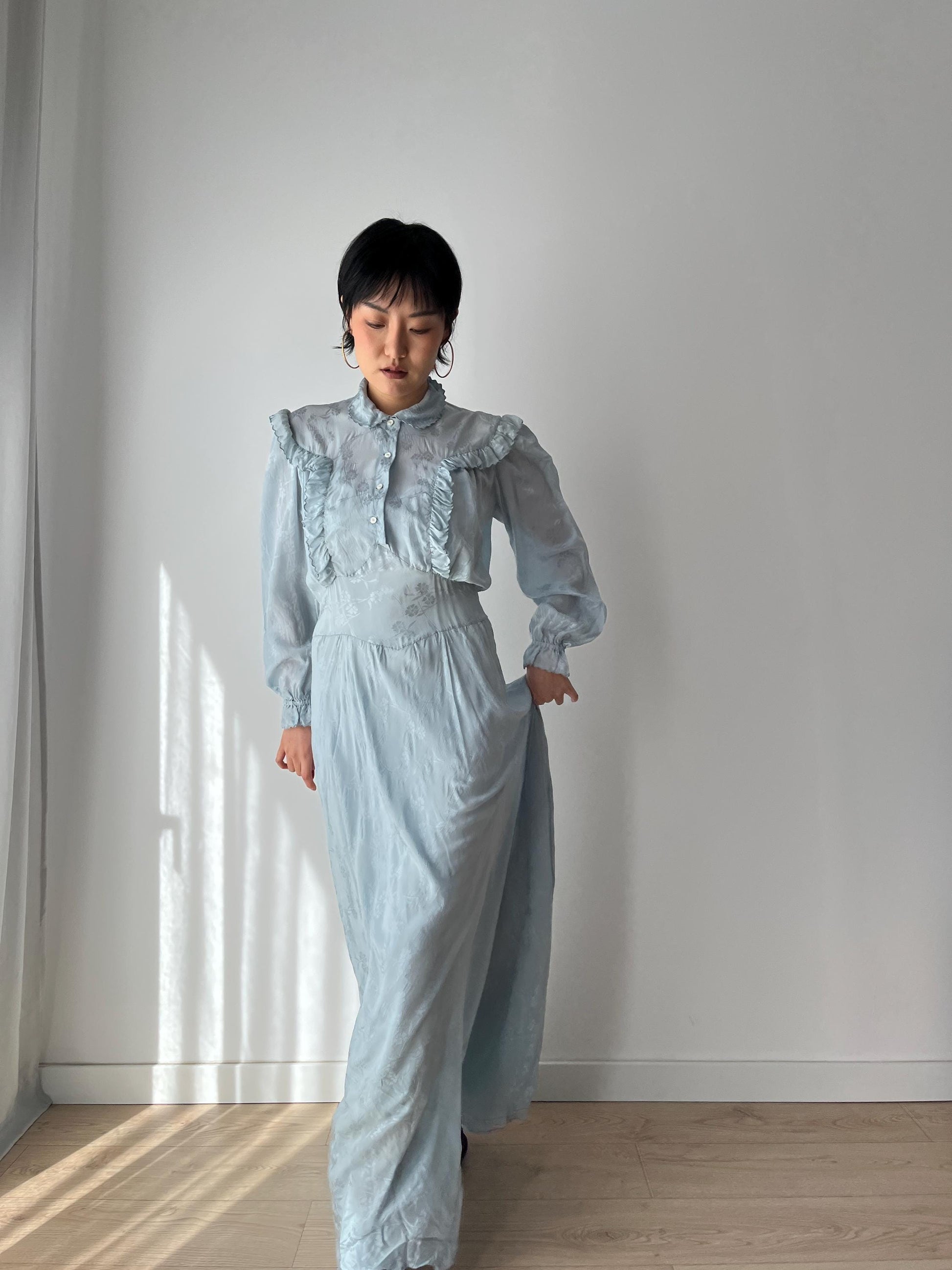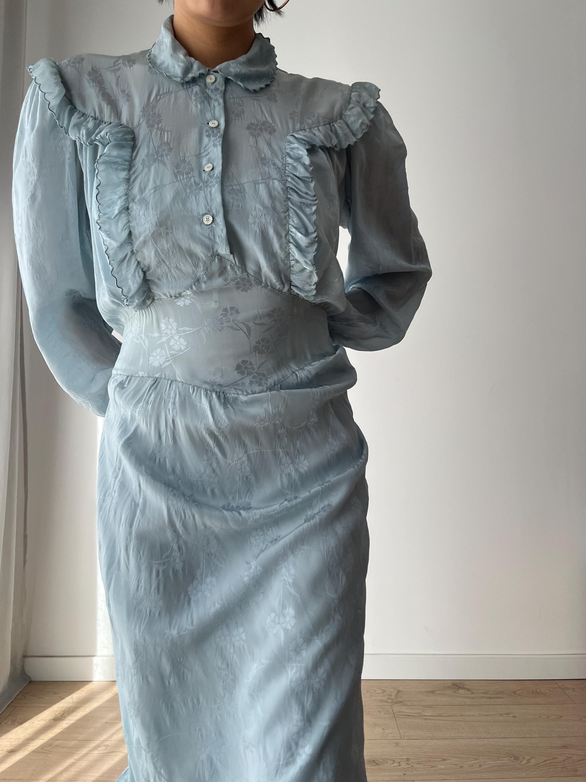 Vintage retro blue 1930s 1940s lace bias cut silk dress
