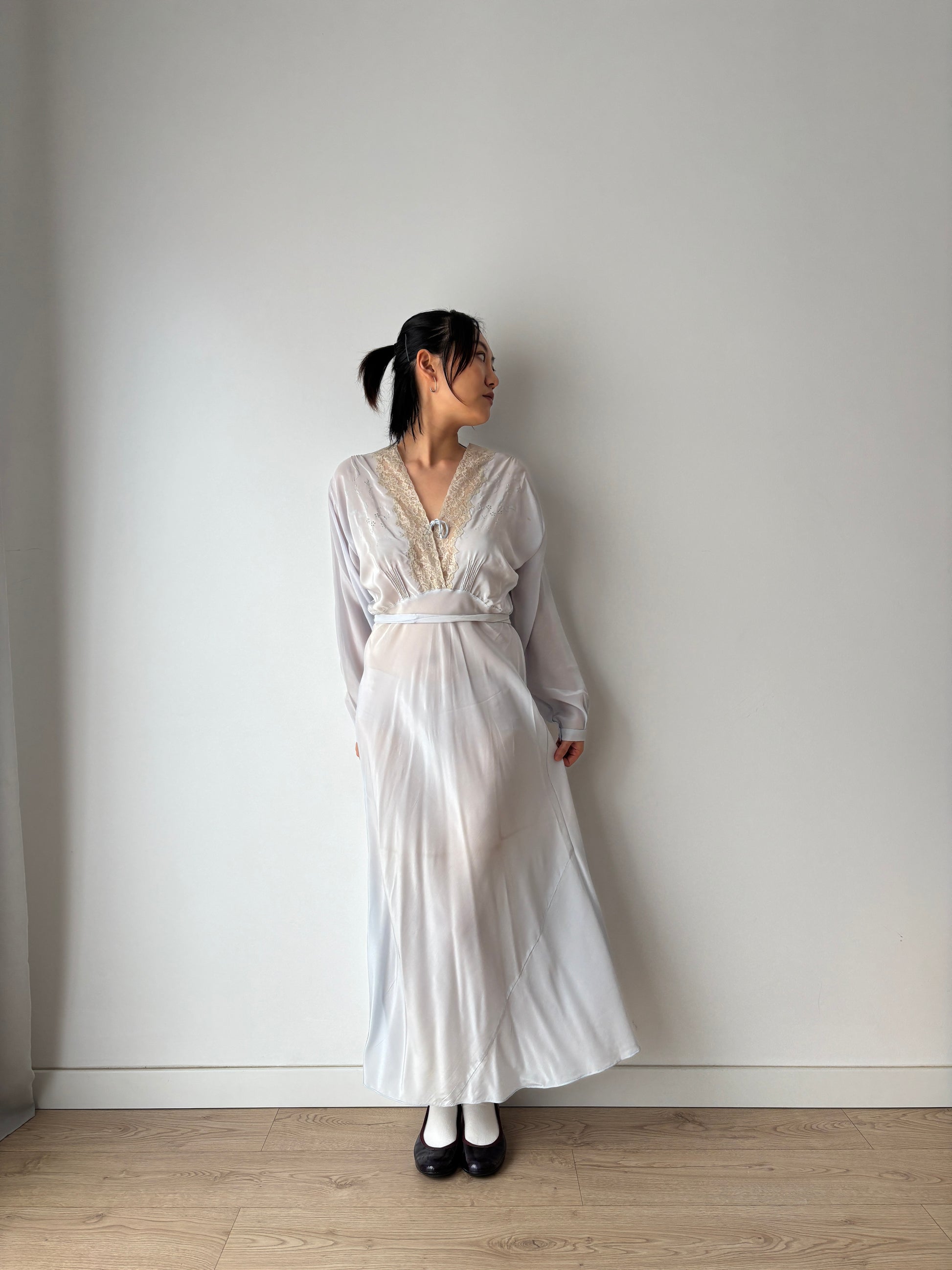 1930s Antique Blue Bias Cut Negligee Embroidery Nightgown