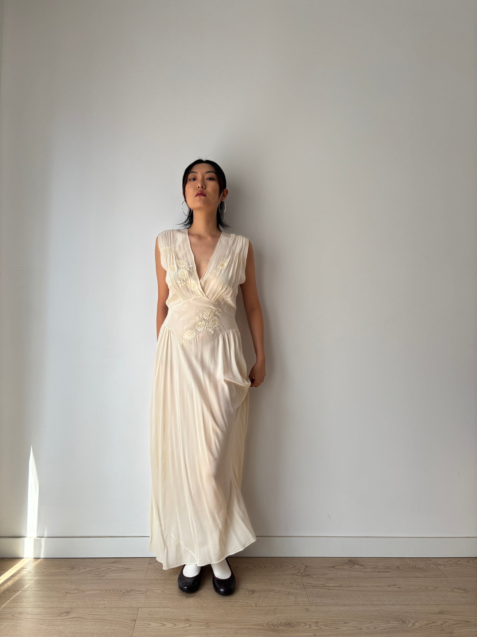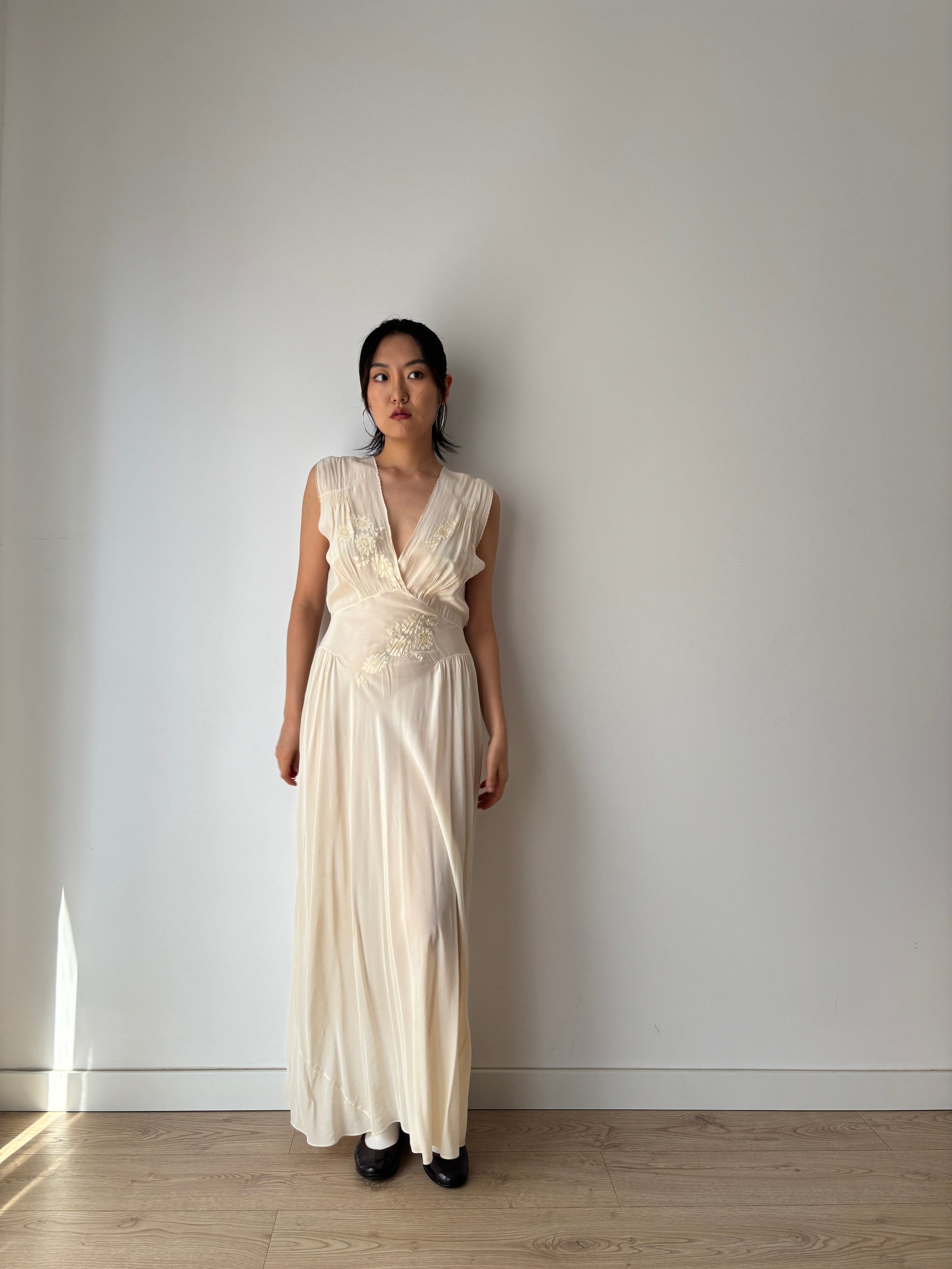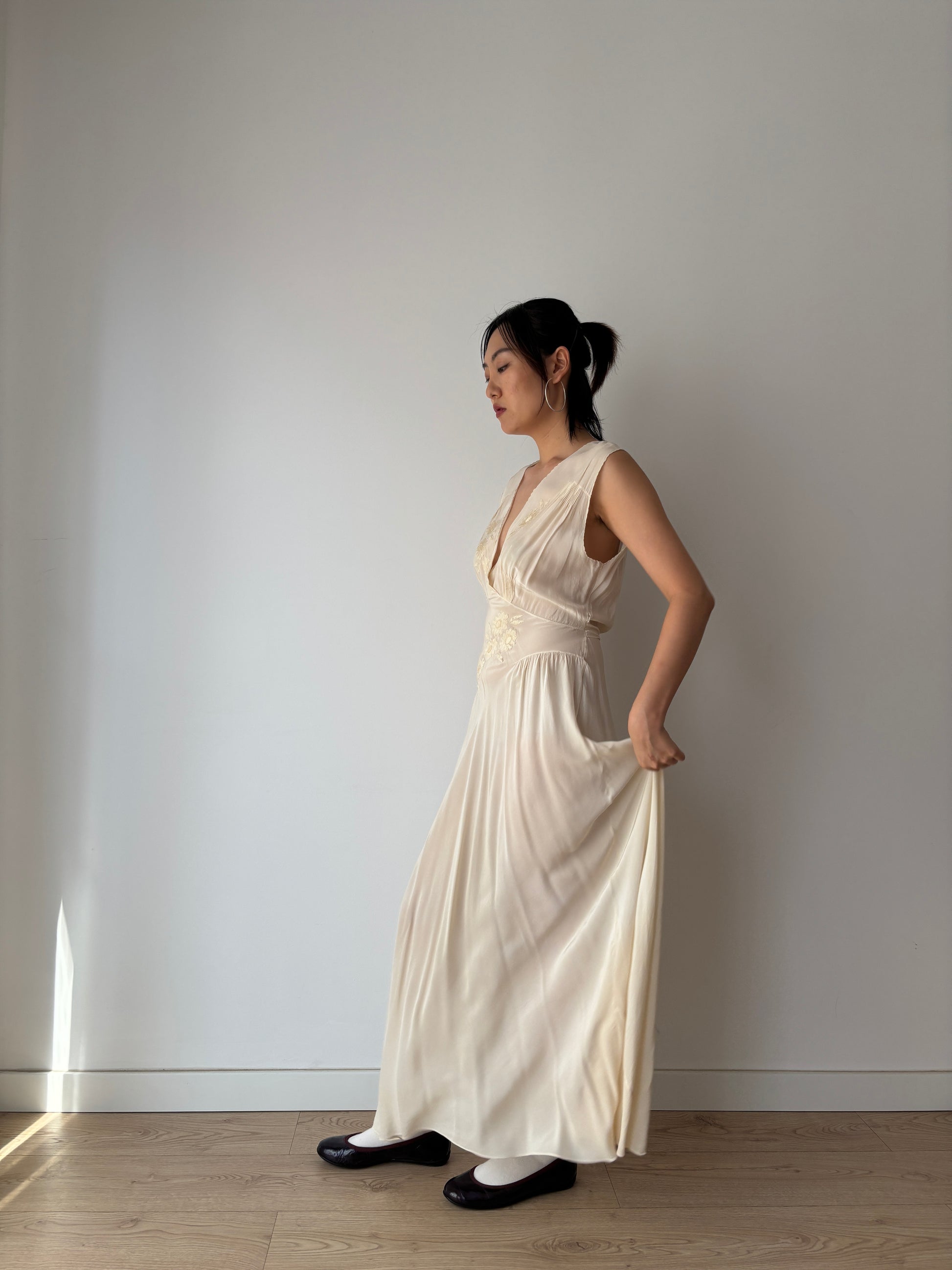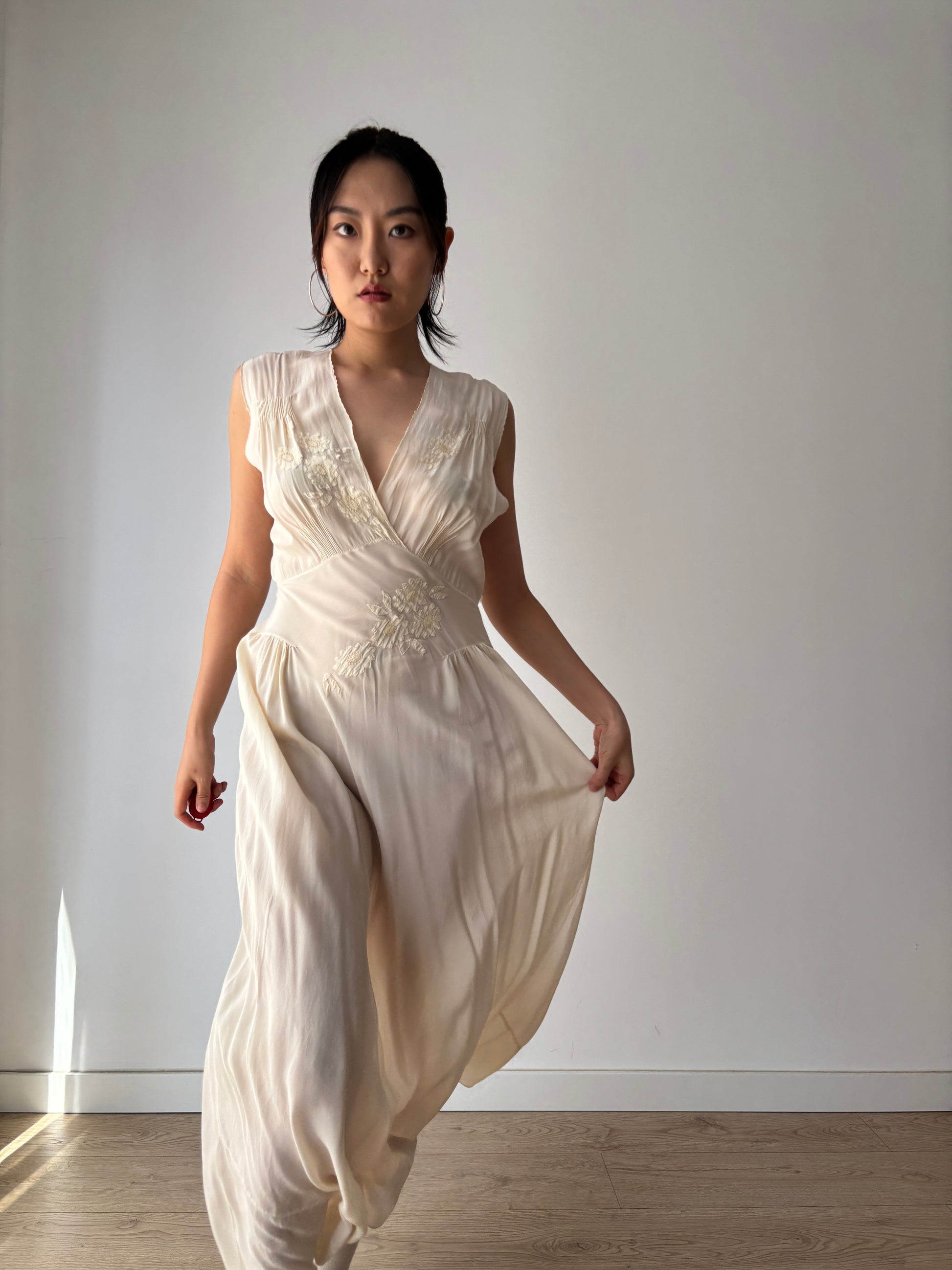 1930s Antique Bridal Lace Bias Cut Negligee Silk Floral Appliqué Dress