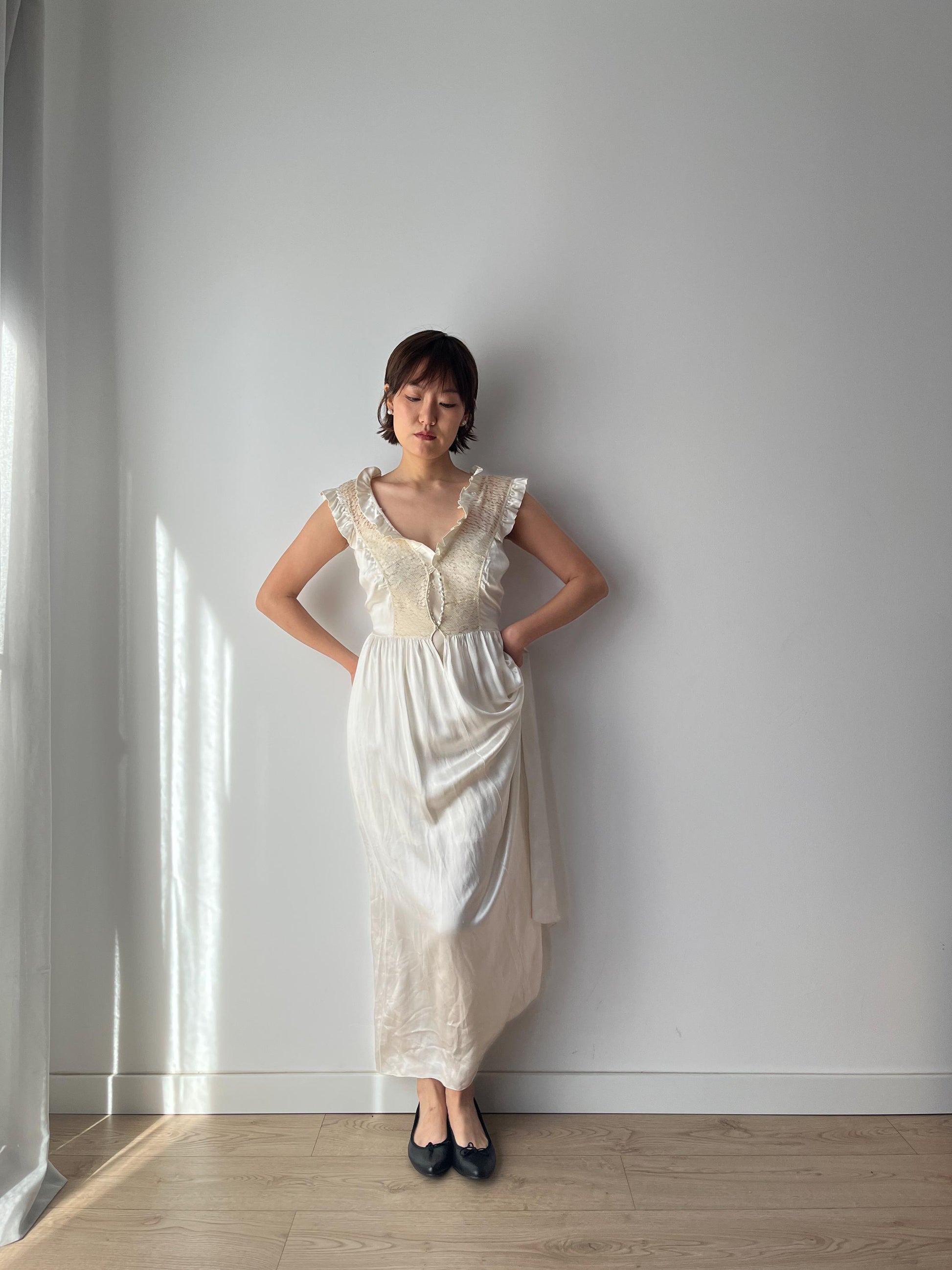 Rare Antique retro 1930s lace silk satin hand embroidered bias cut bridal dress
