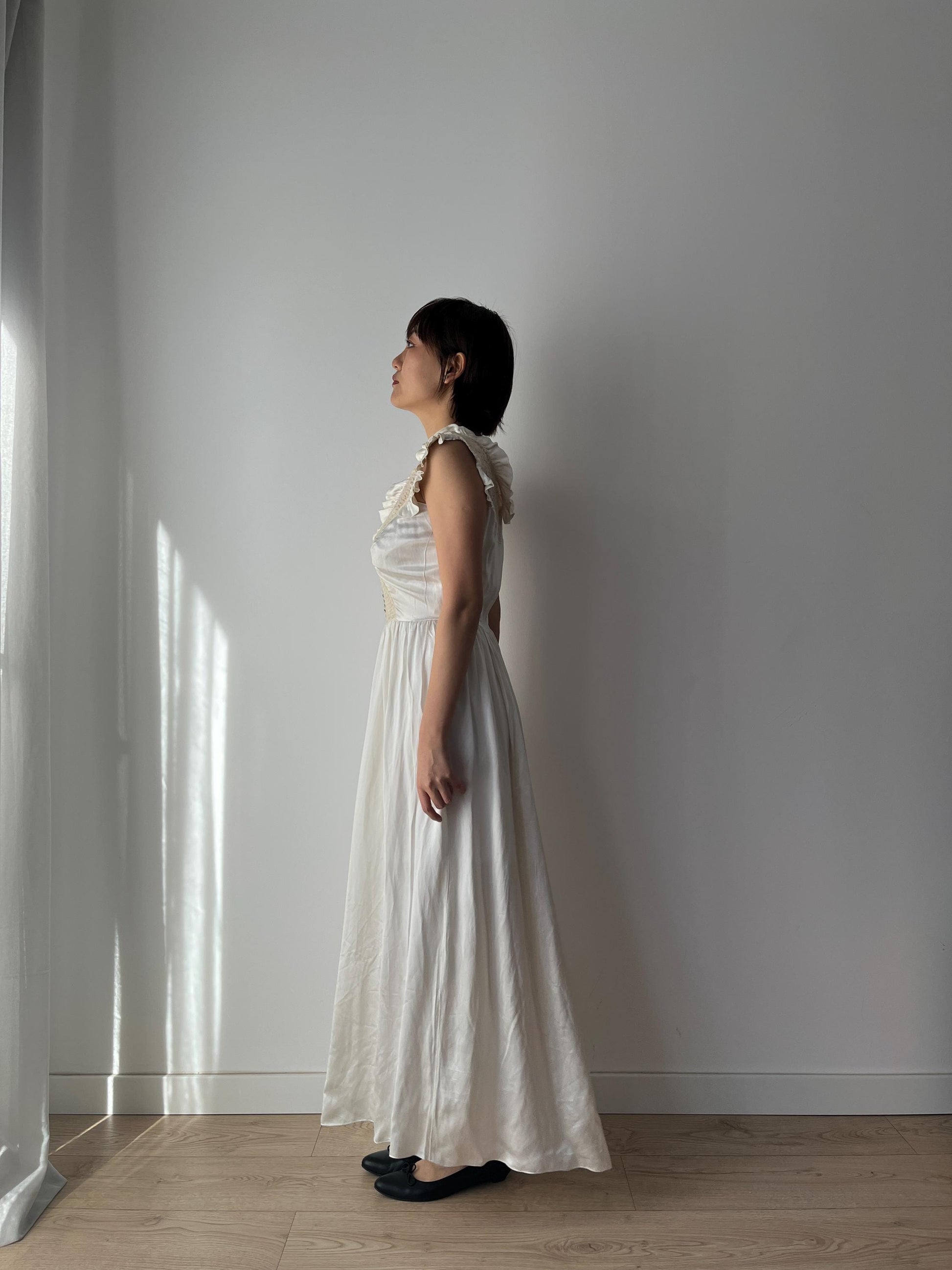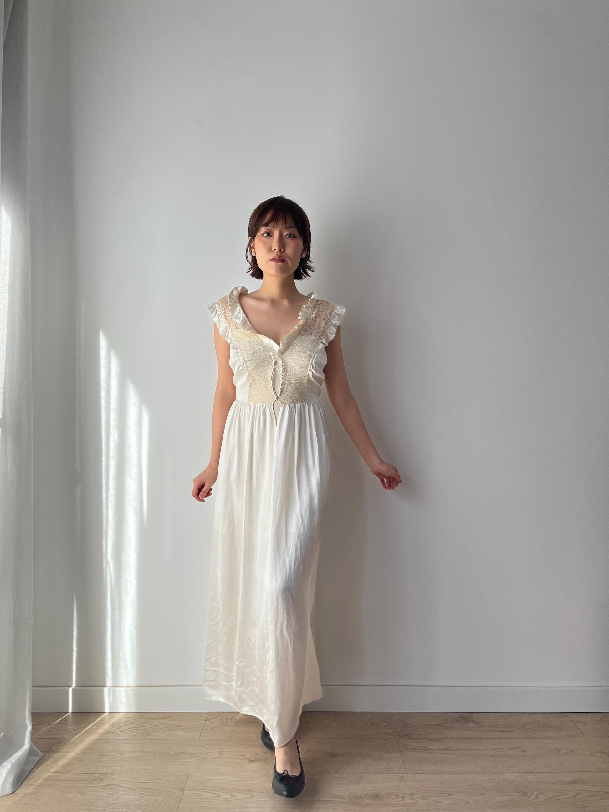 1930s Antique Bridal Lace Bias Cut Negligee Silk Satin Embroidered Nightgown