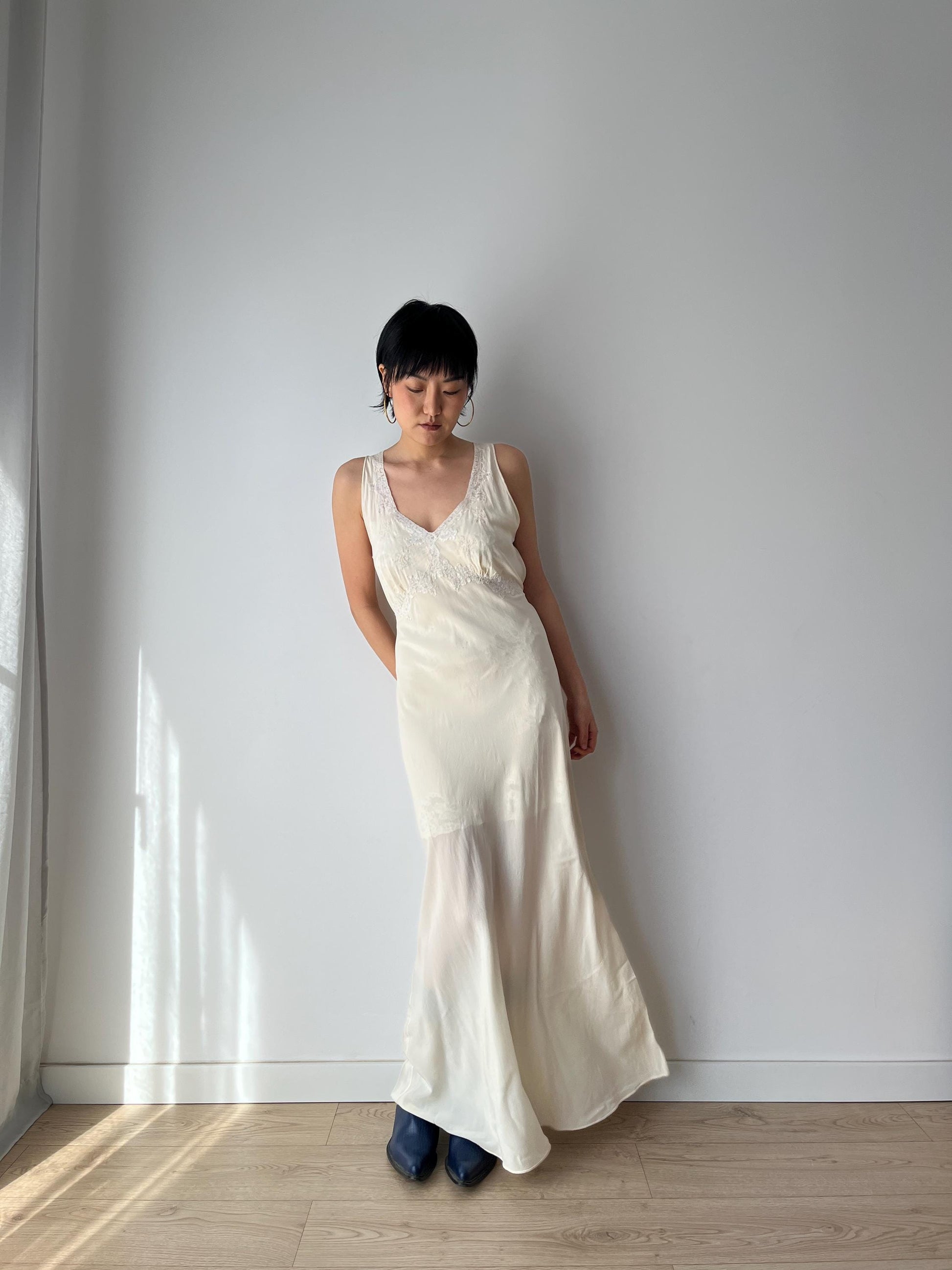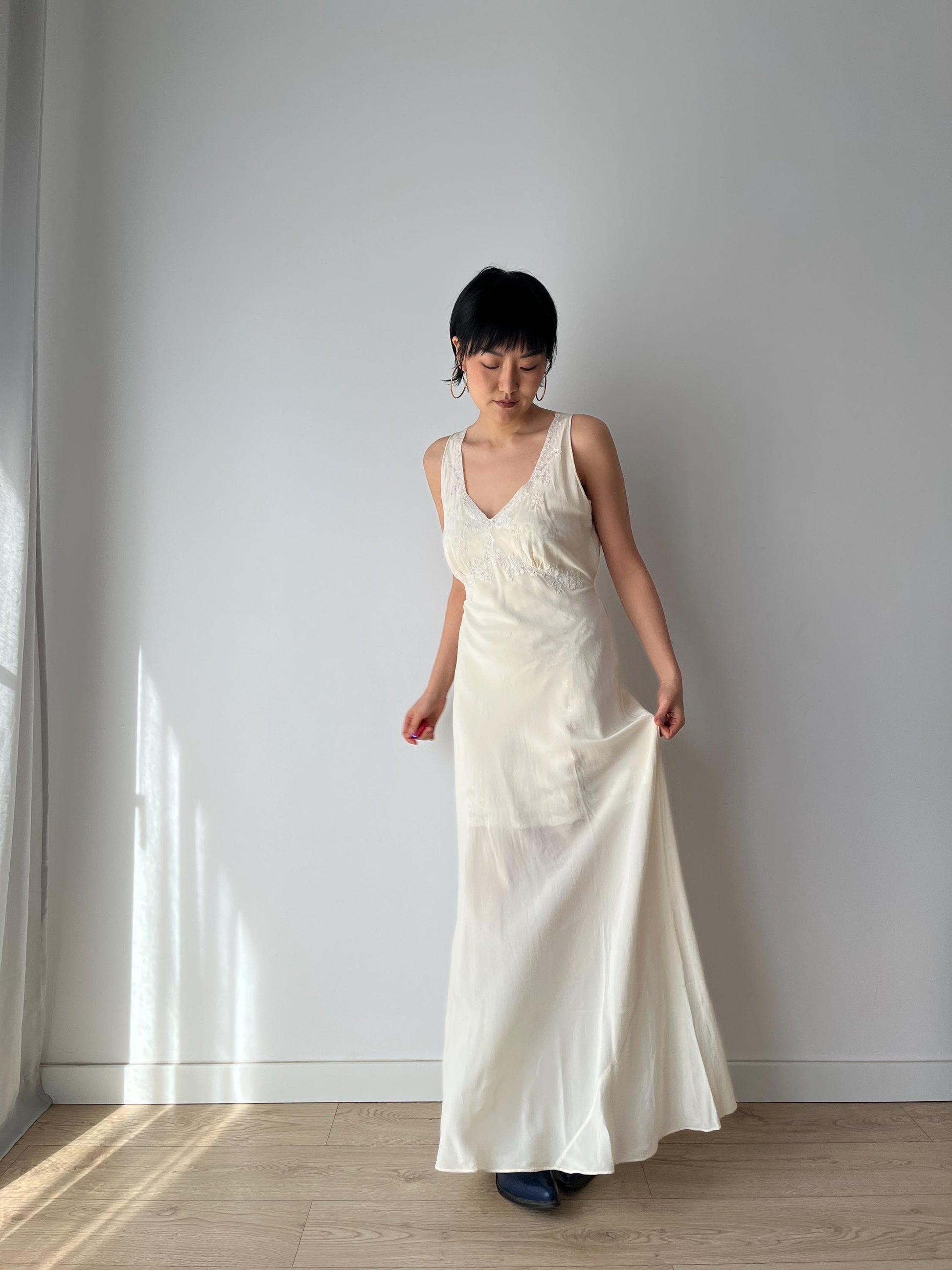 Vintage retro 1930s lace silk satin hand floral embroidered bias cut bridal summer dress