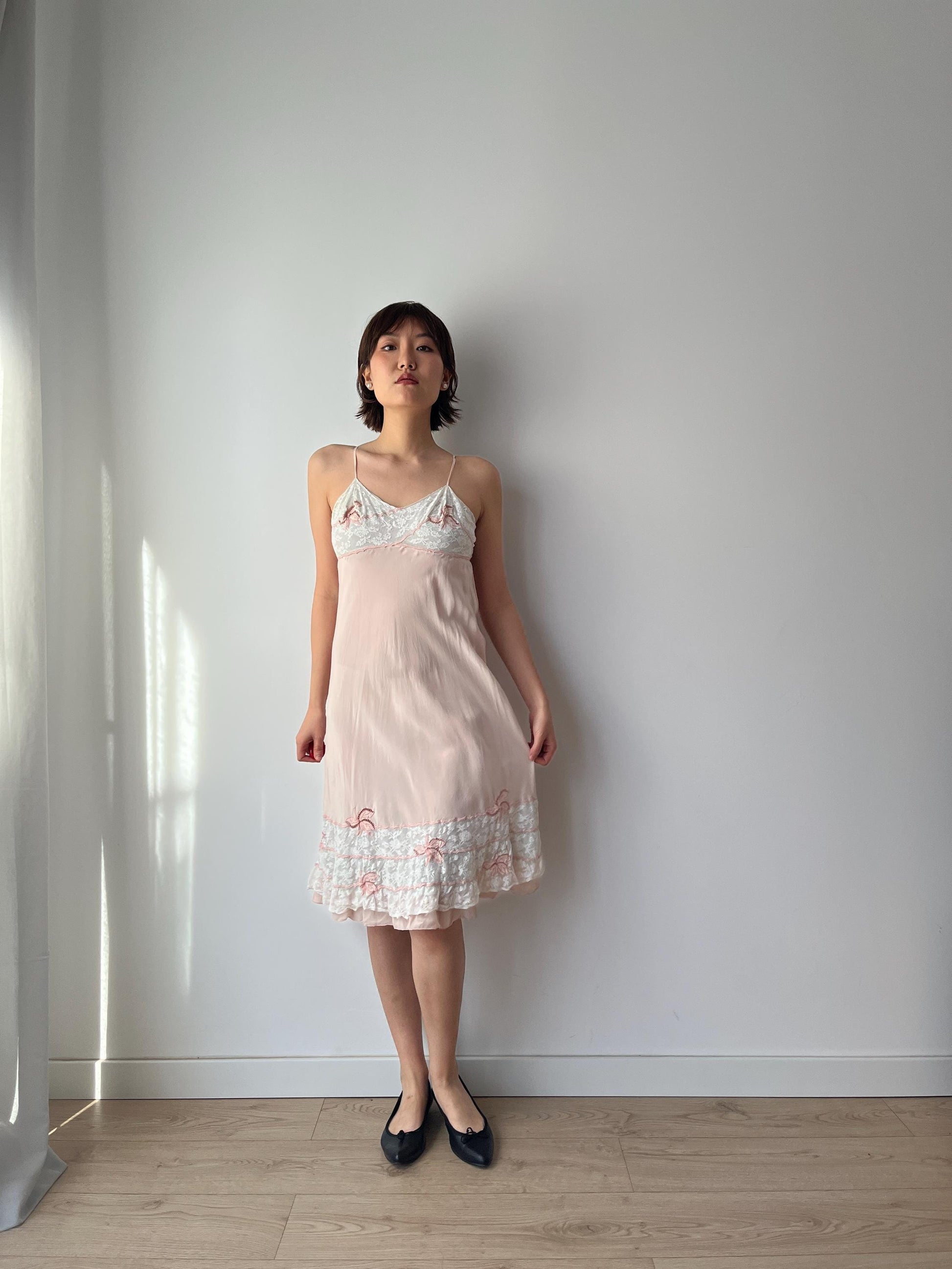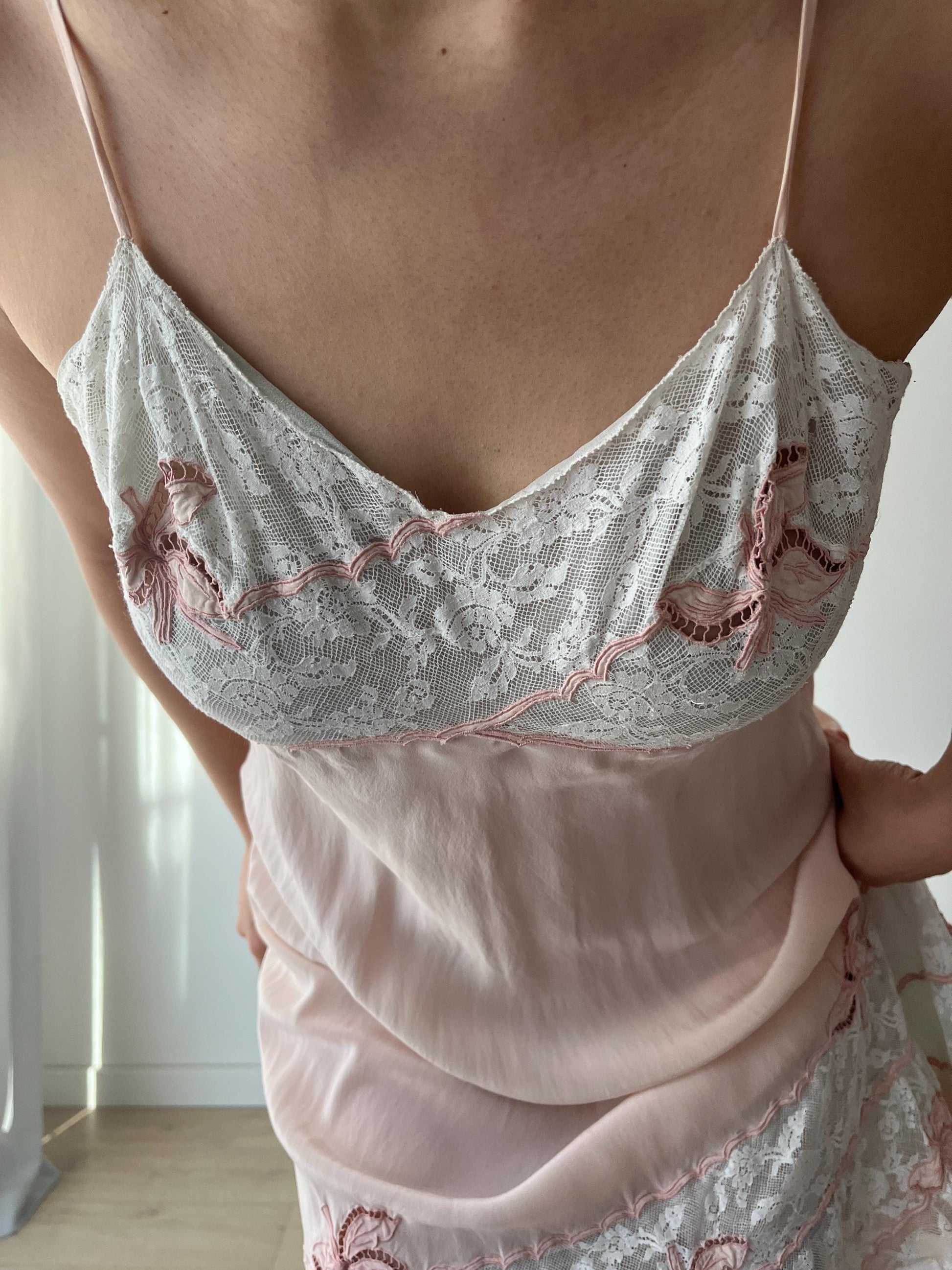 1930s Antique Pastel Pink Lace Liquid Crepe Silk Slip dress, Vintage lace mini dress