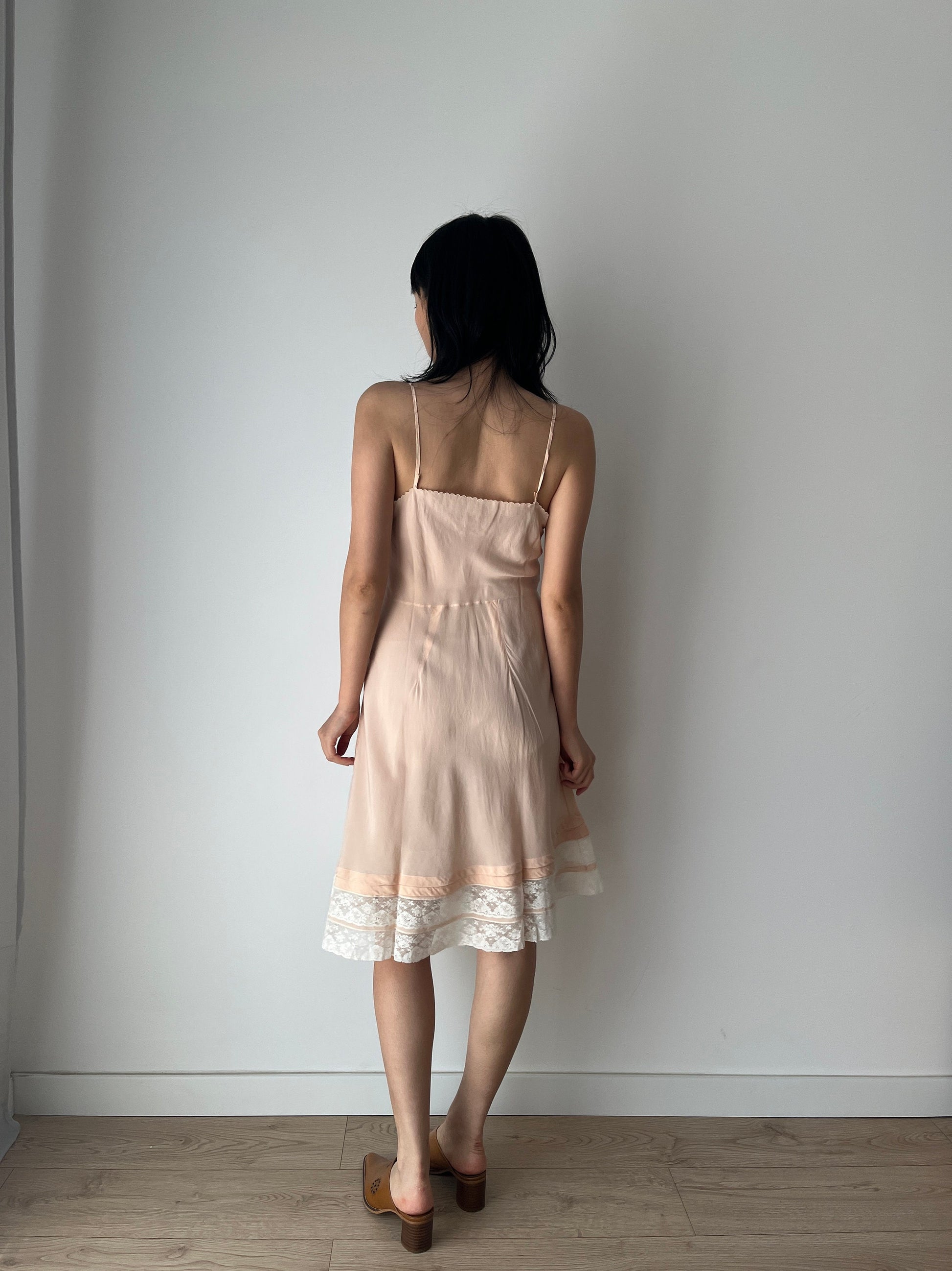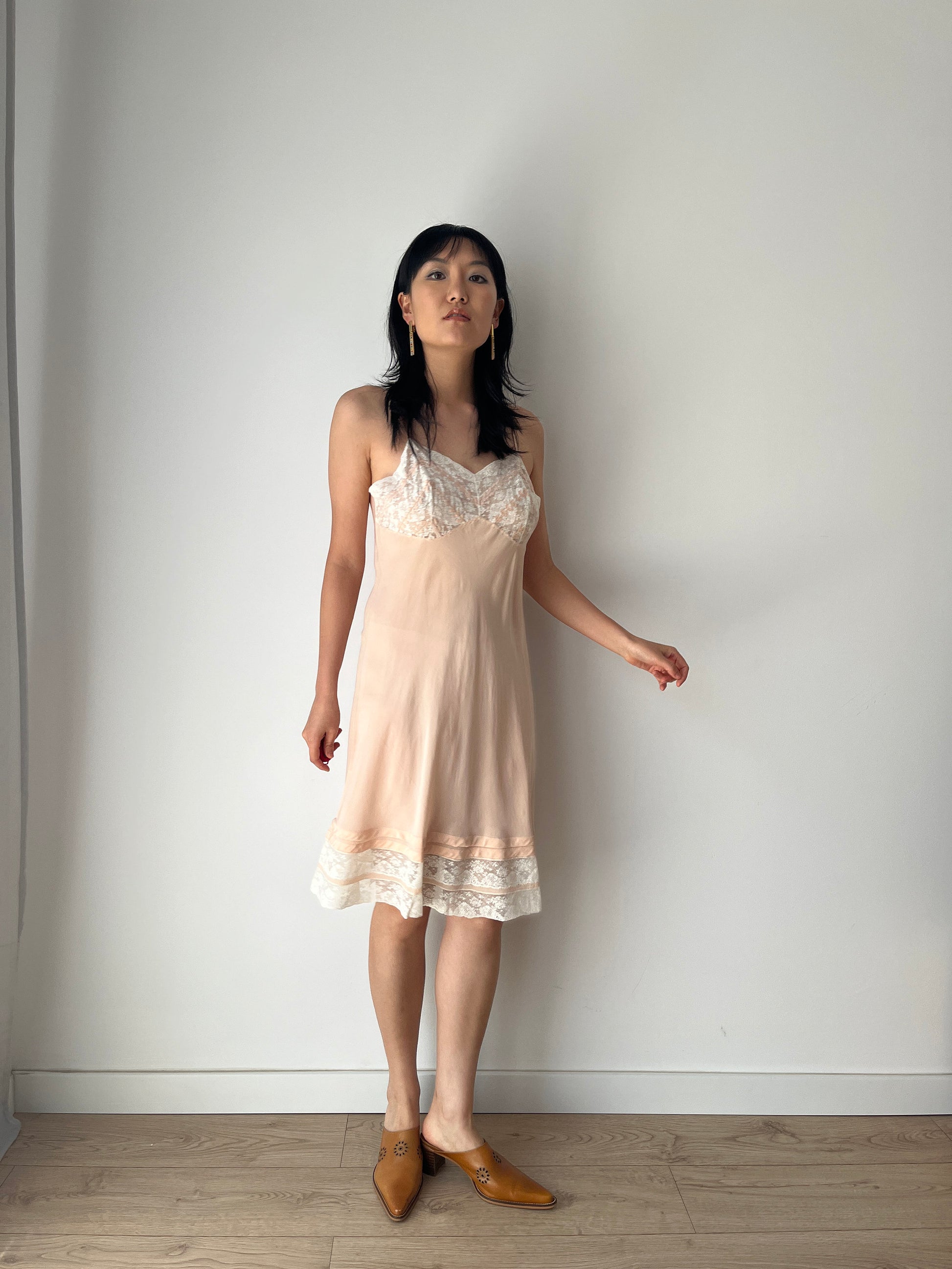Vintage 1930s soft pastel pink lace slip dress made of pure silk crepe