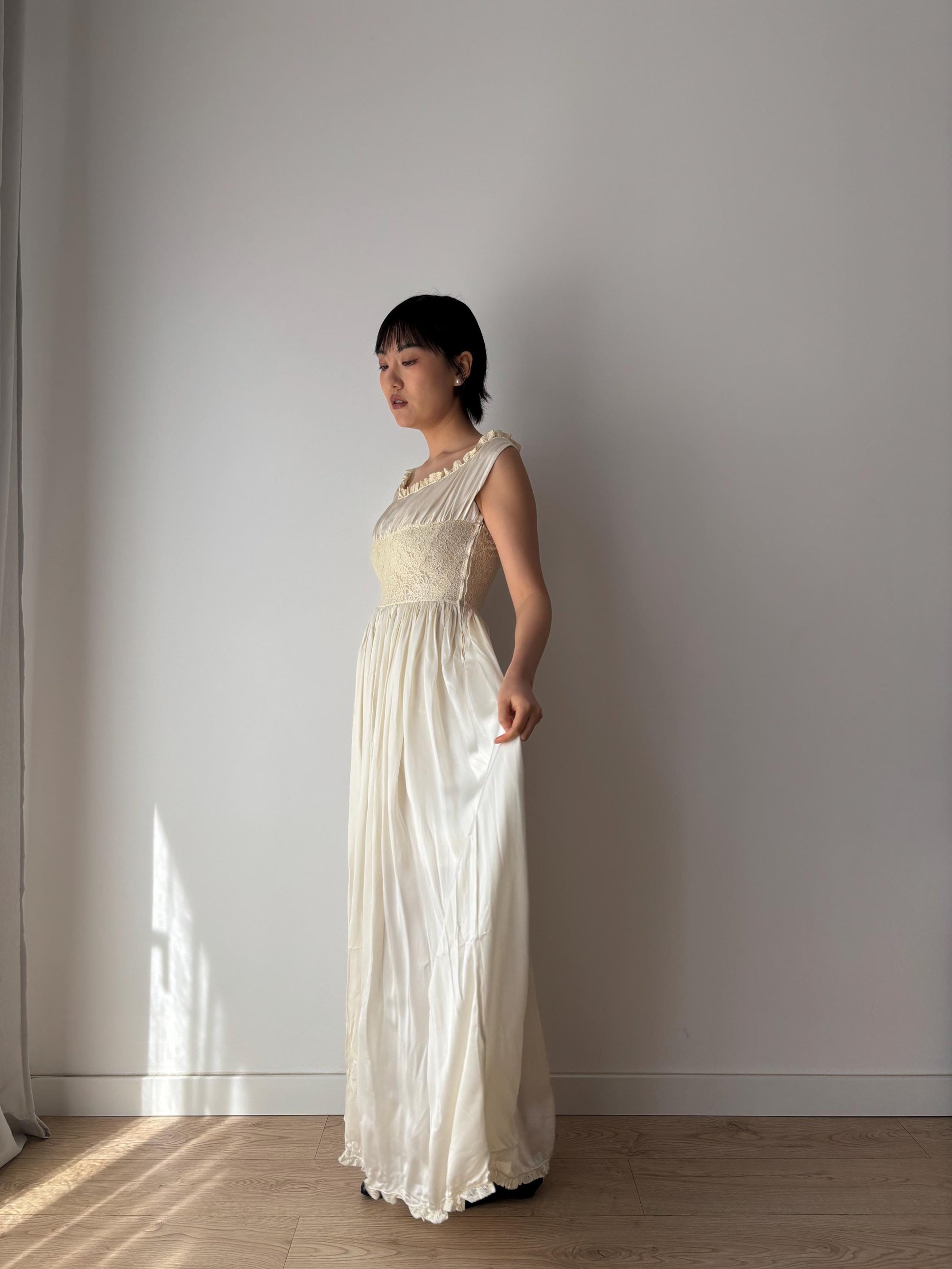 1930s Antique Satin Silk Heavy Lace Bridal Wedding Dress, Liquid Art deco Nightdress