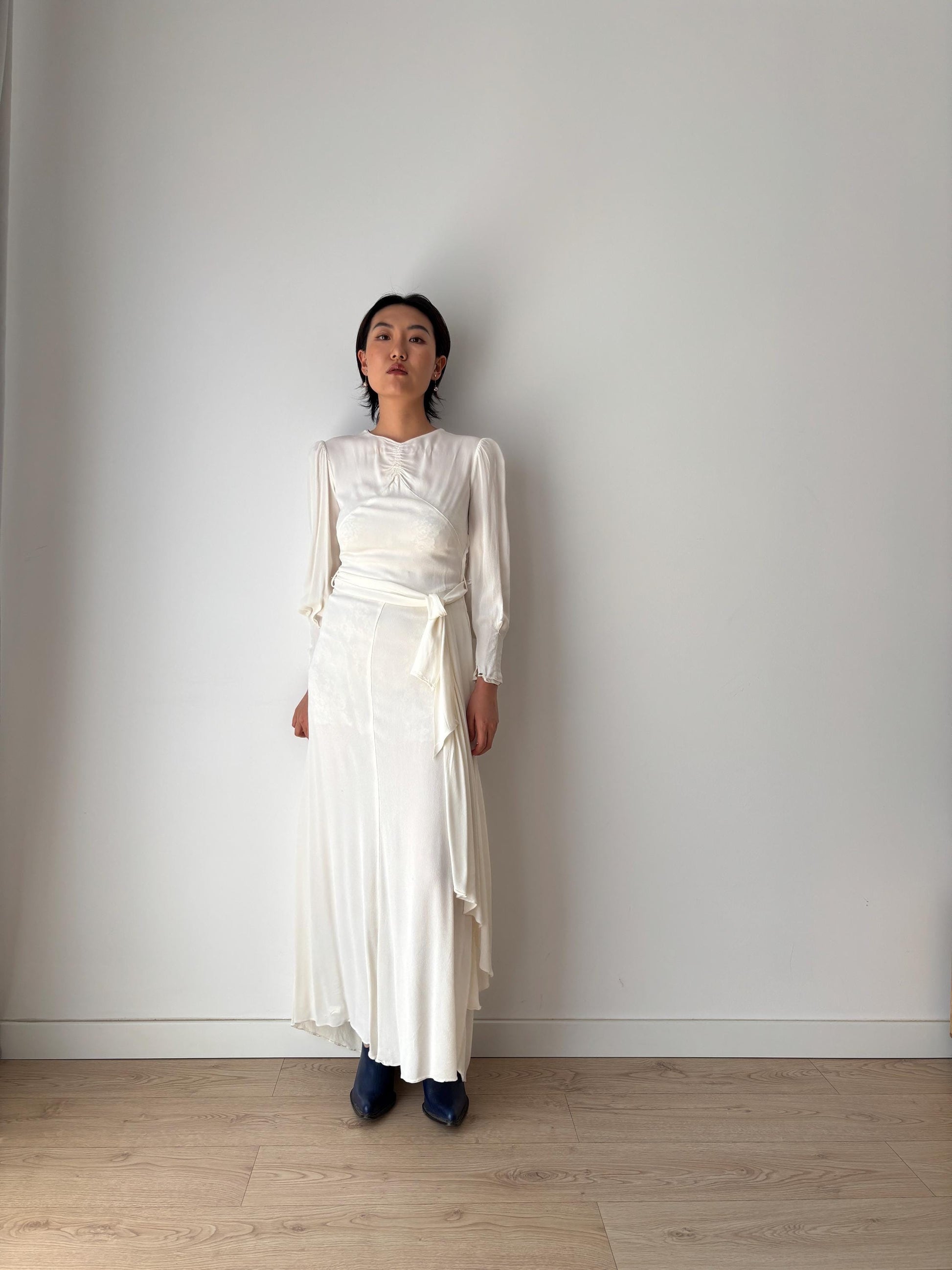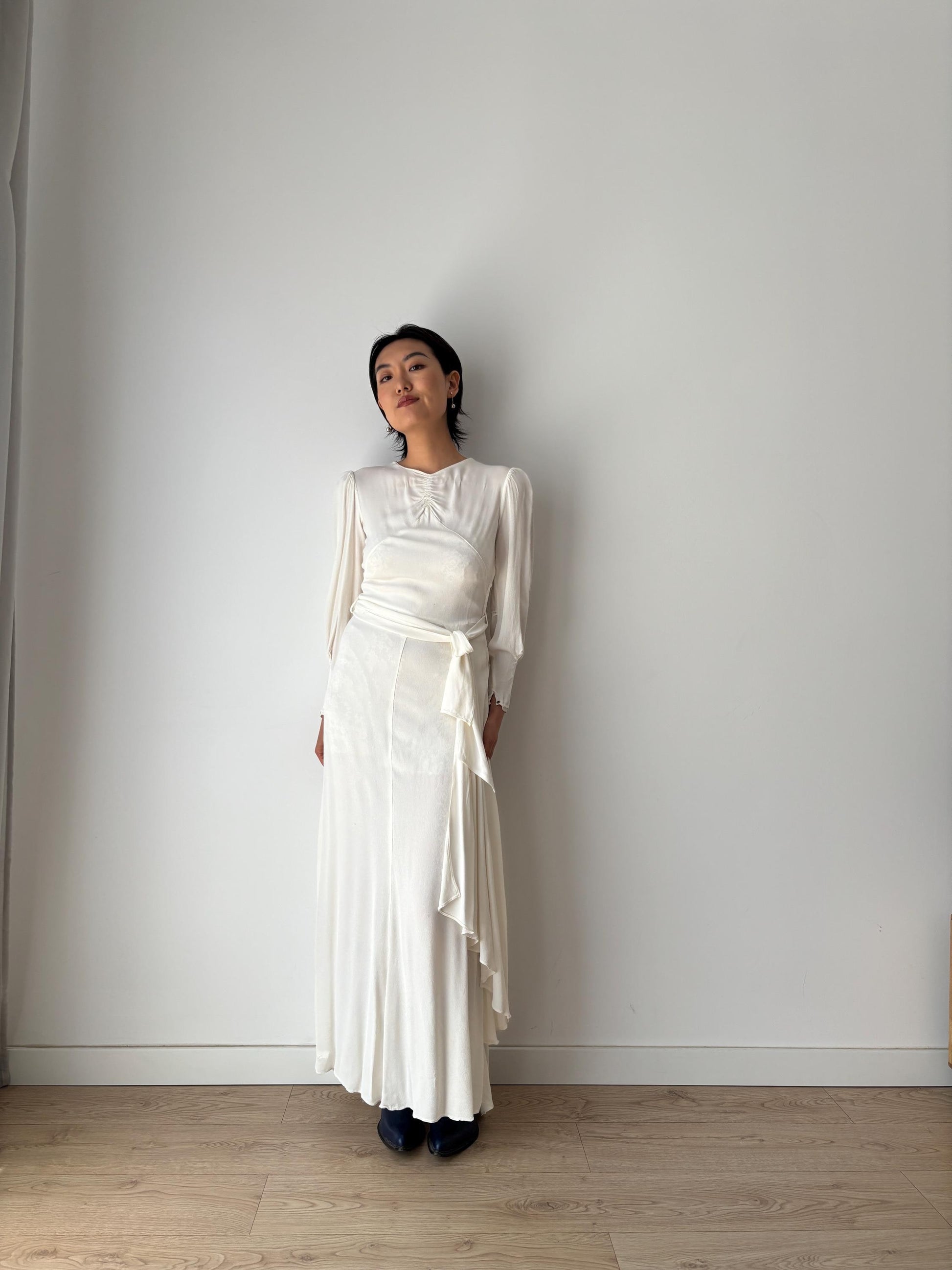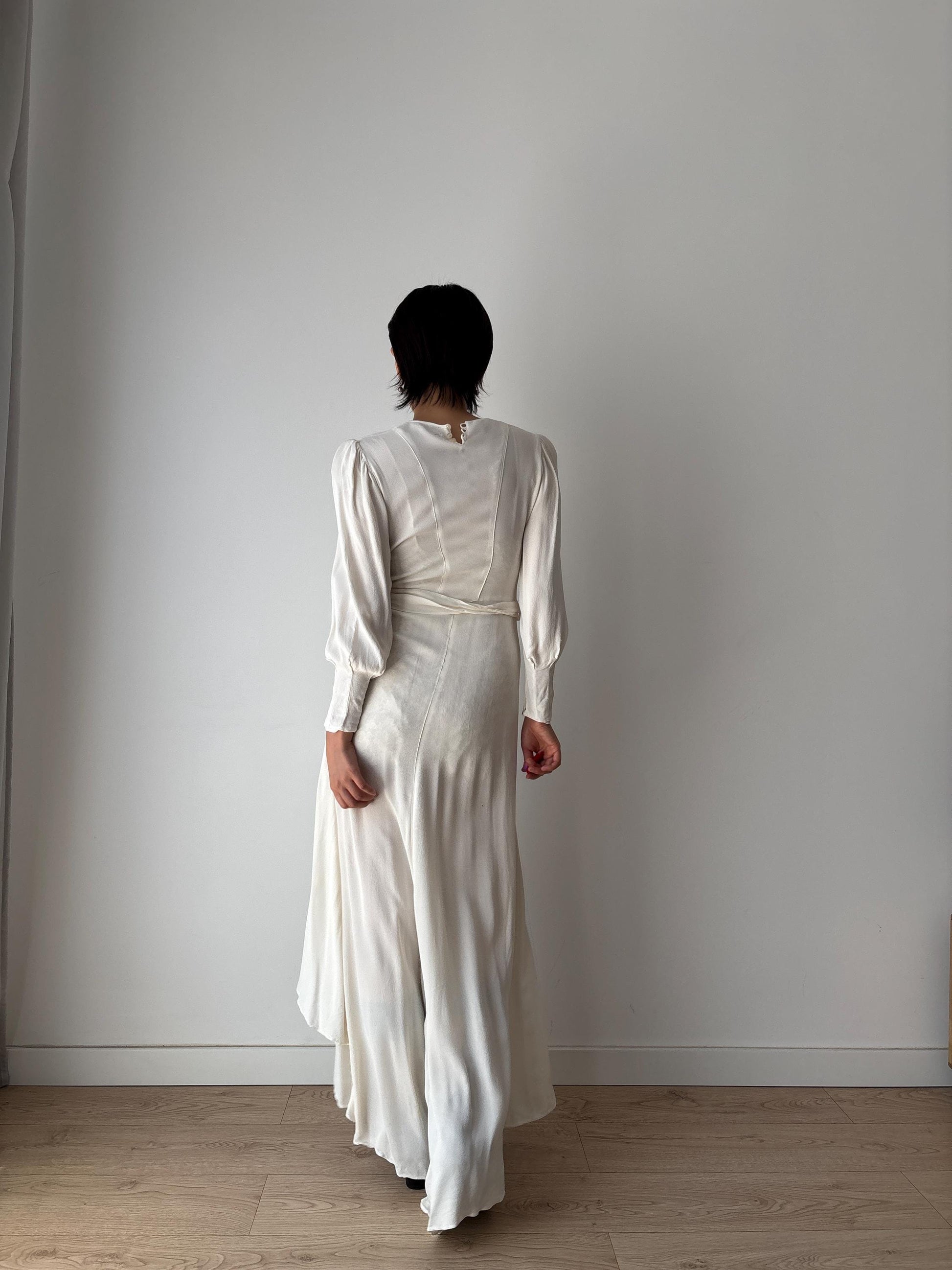 1930s Antique White 100% Silk Crepe Long Maxi Bridal dress, Vintage lace wedding dress