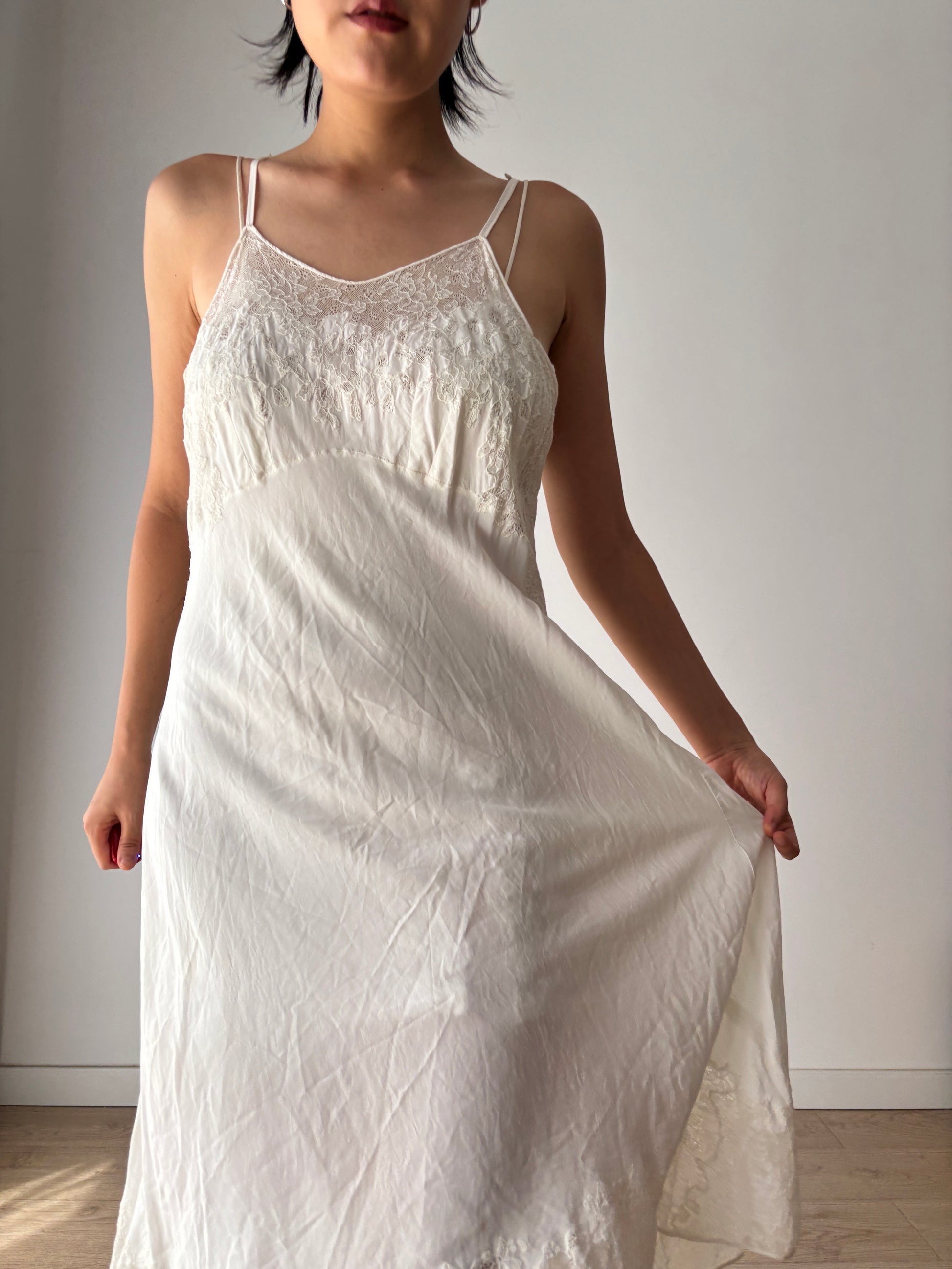 Vintage romantic bridal 1930s lace slip bias cut dress in white made of pure silk satin