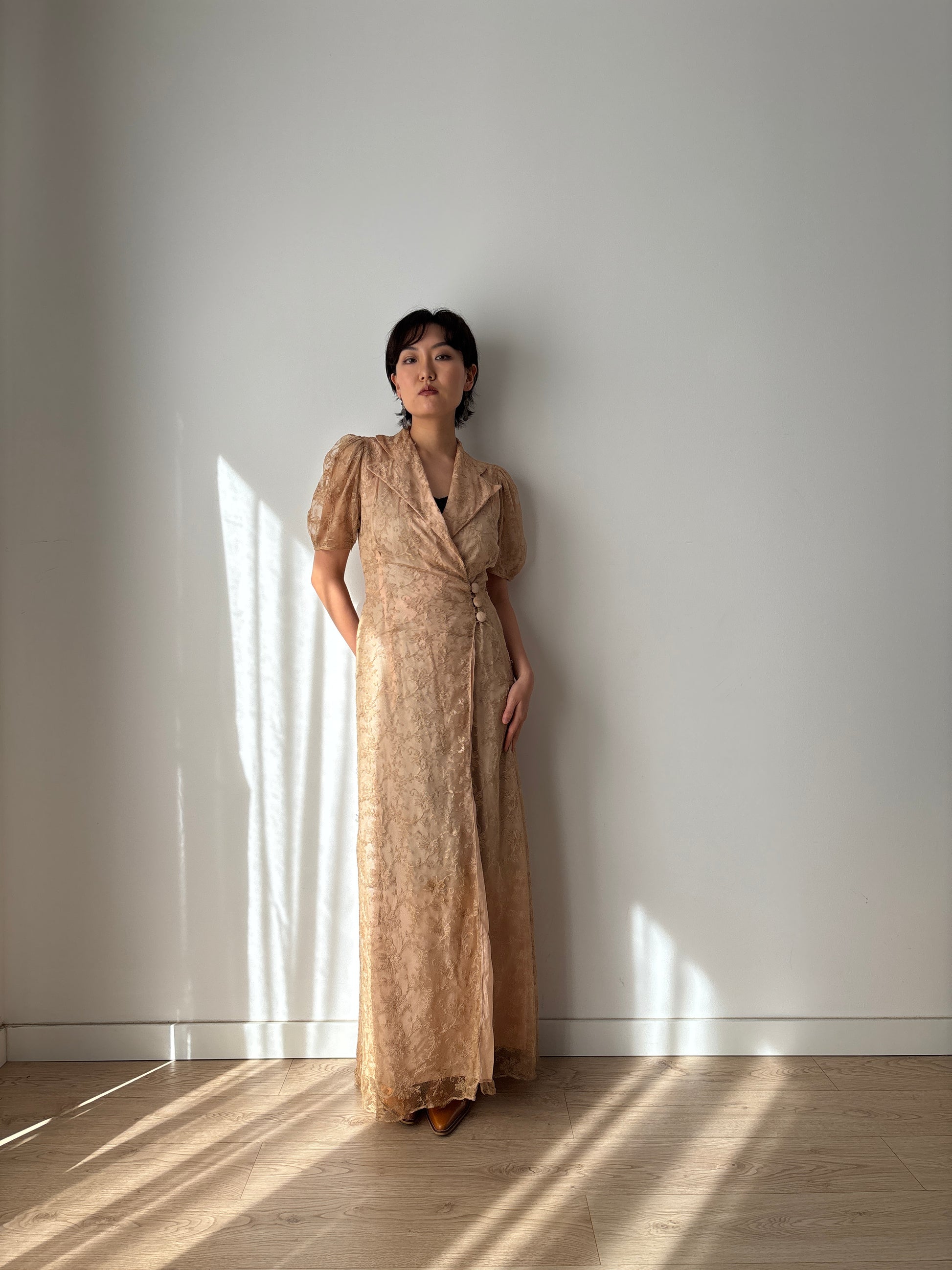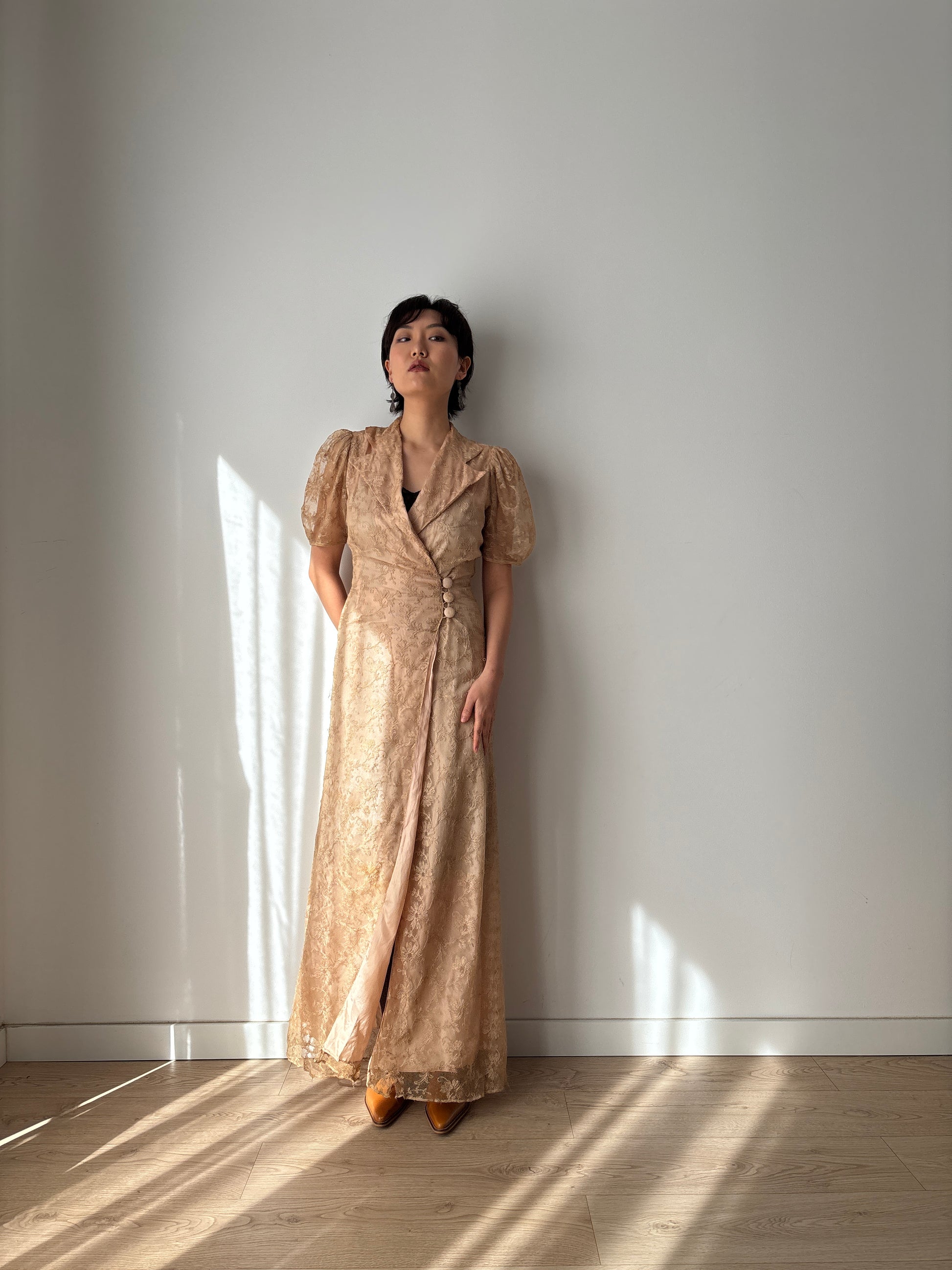 1930s Beige Lace Wrap Dress Lined: Front Button Closure & Puff Sleeves