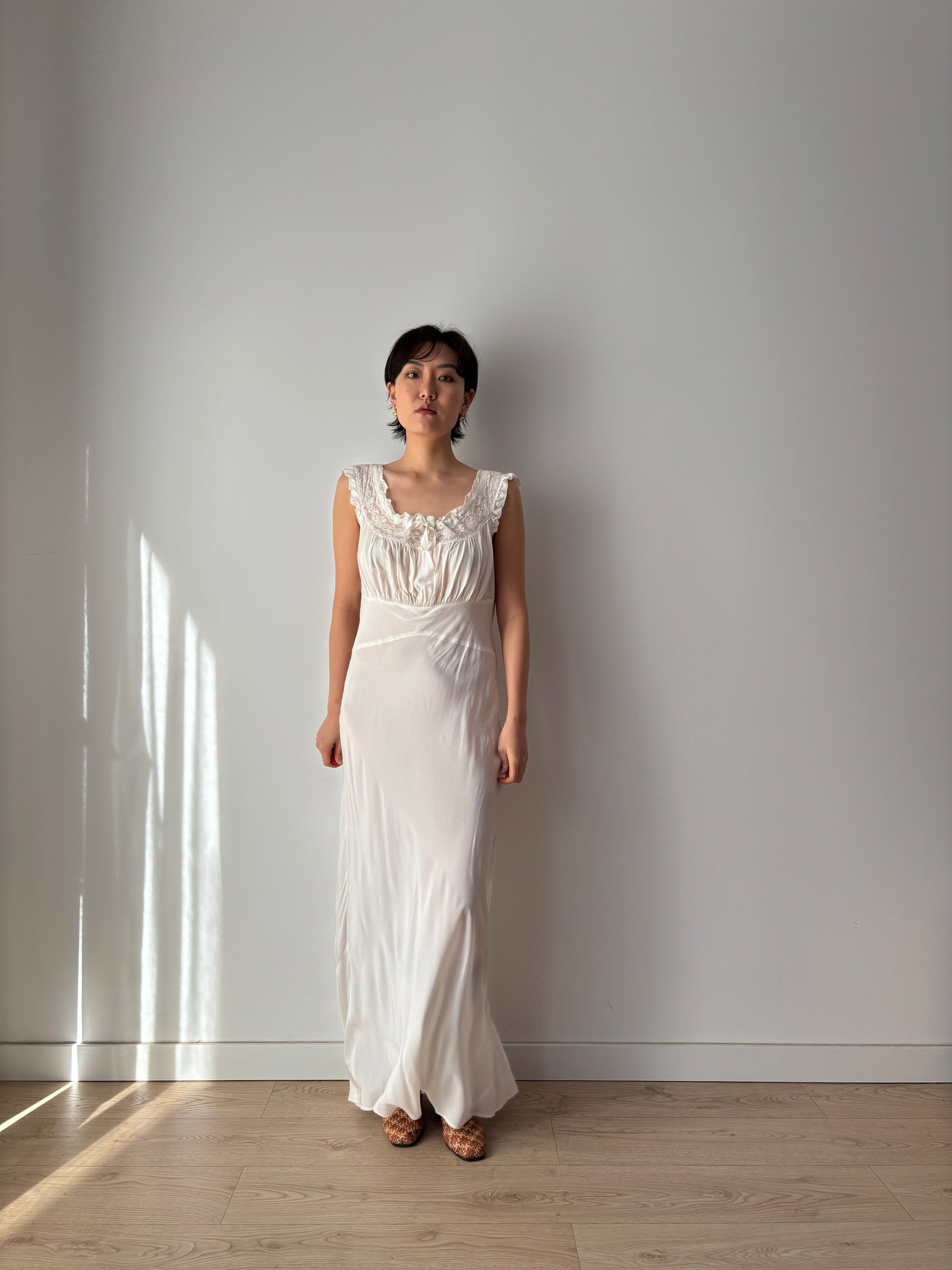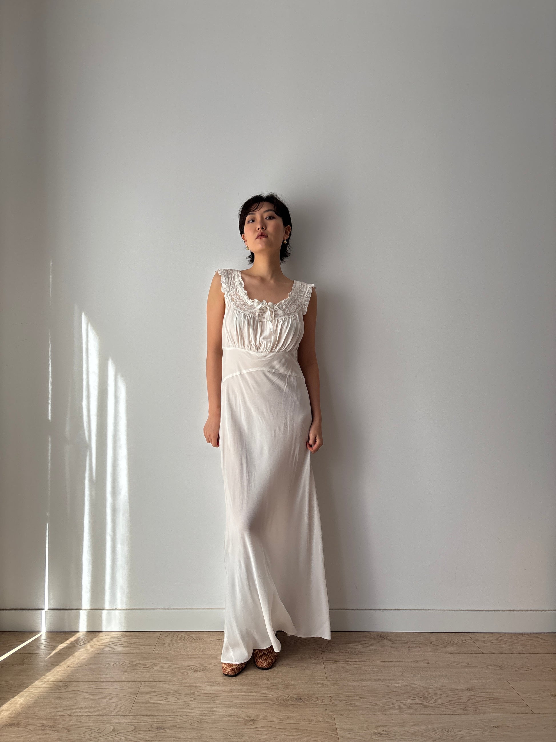 1930s bridal gown embodies timeless romance. Crafted from silk in a flattering bias cut, it is adorned with delicate lace and a graceful bow detail, capturing the essence of vintage bridal elegance.