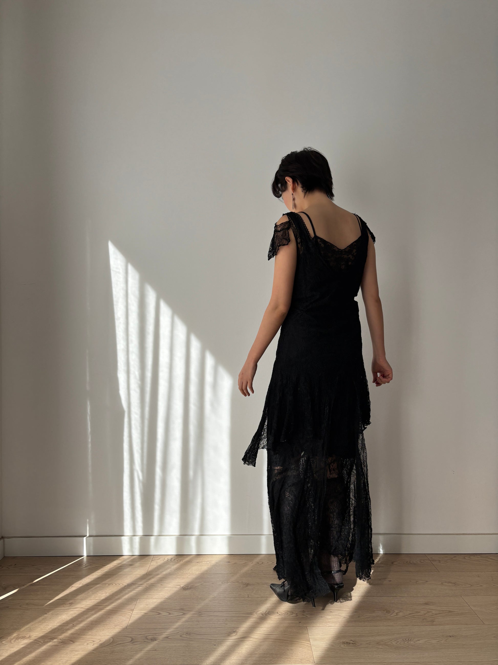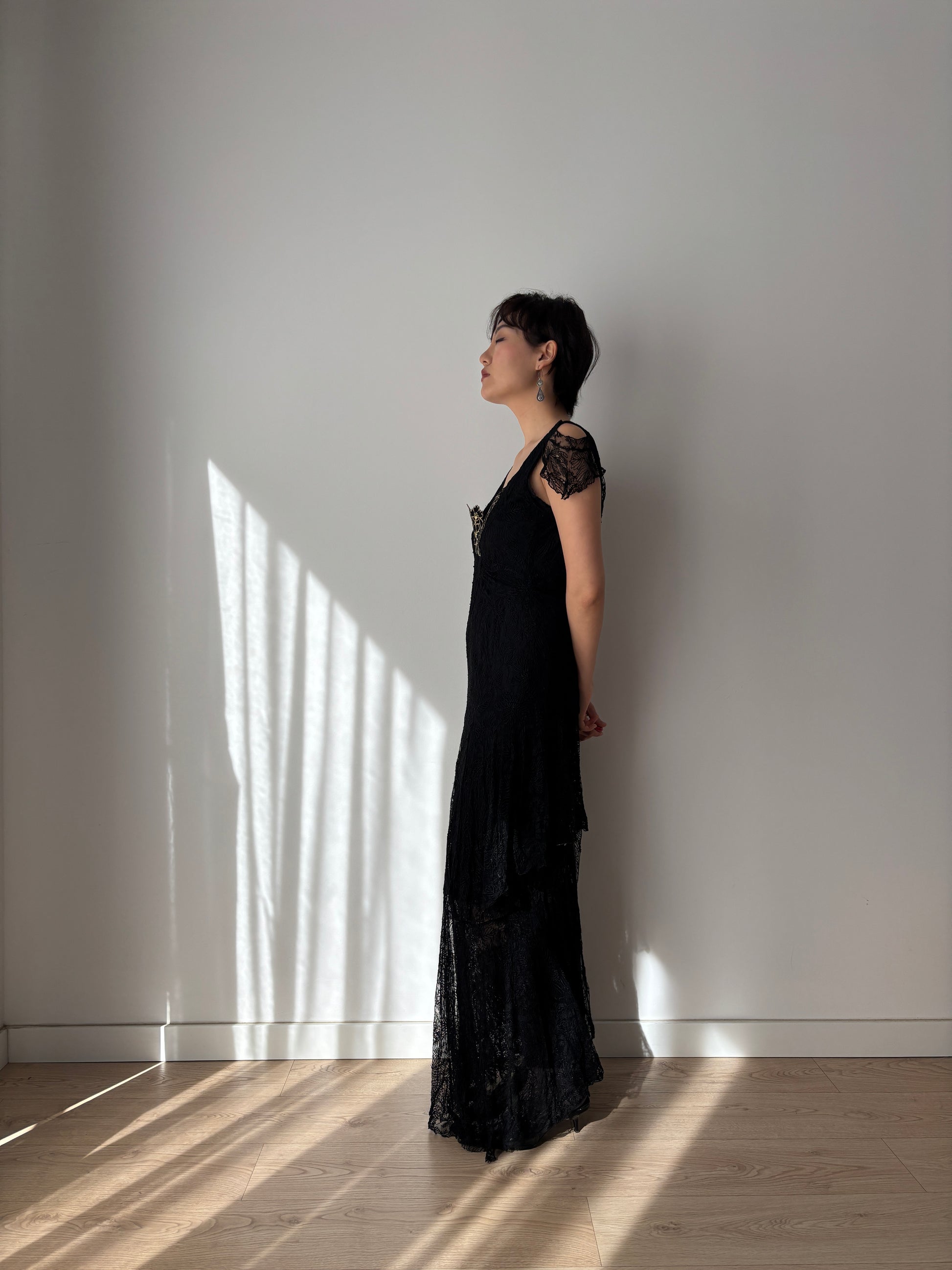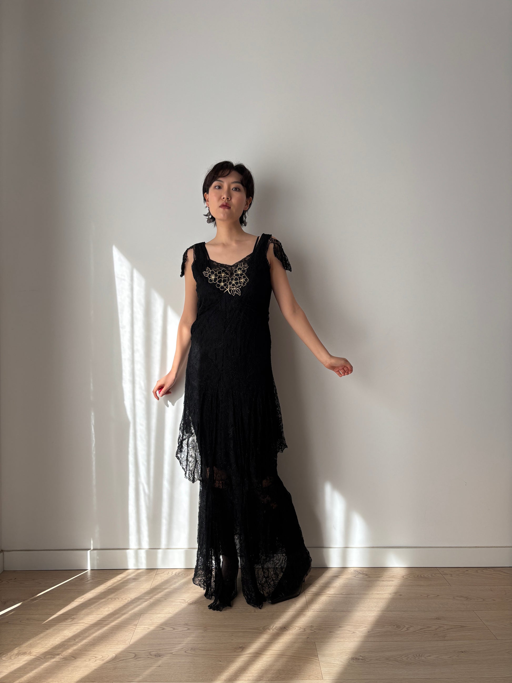 A sophisticated 1930s black lace long dress with exceptional detail. The garment is lined, the bodice is with delicate floral appliqué work