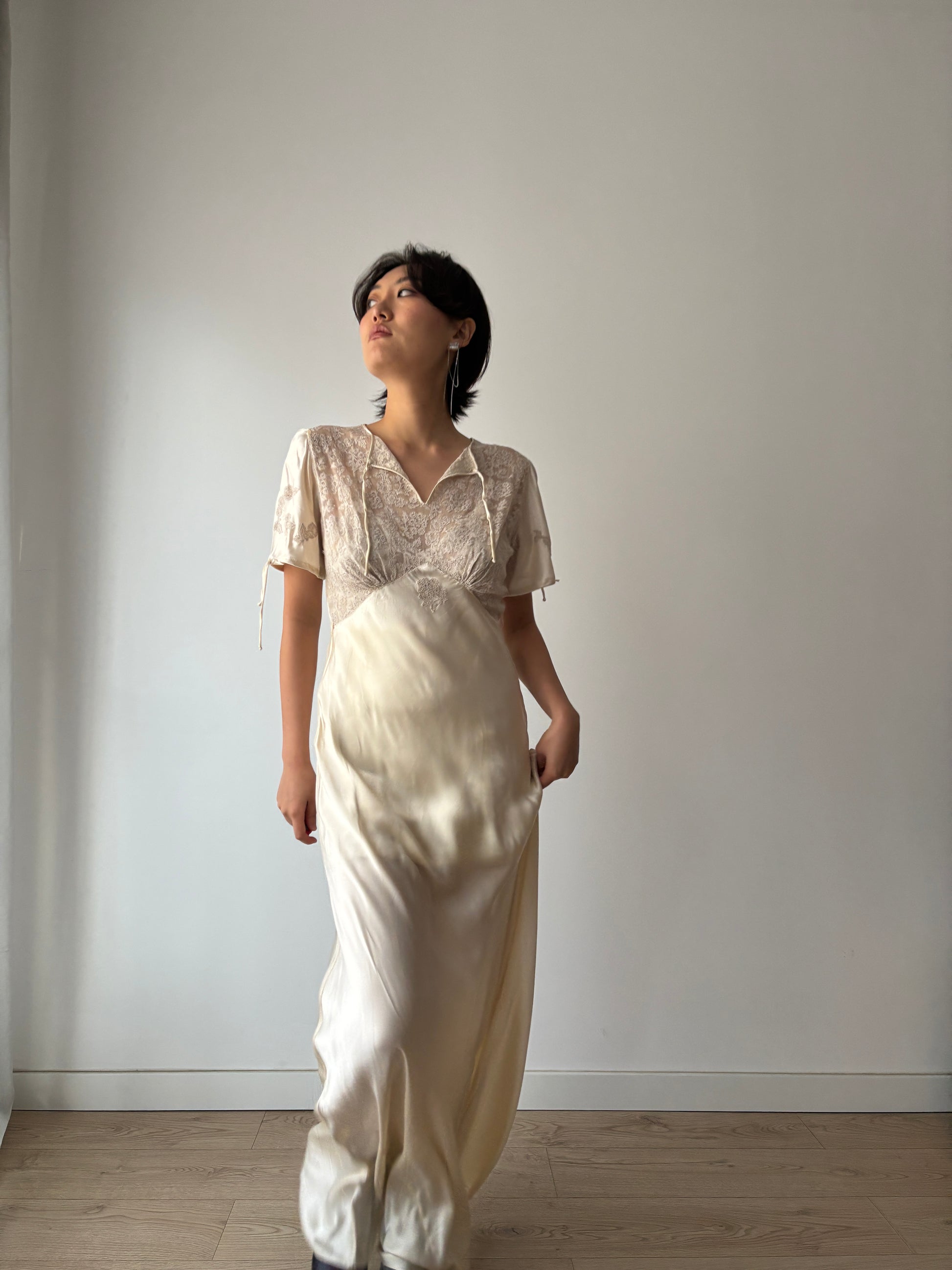 1930s Vintage Silk Satin Lace Wedding Dress, Antique Bias Cut Bridal Gown