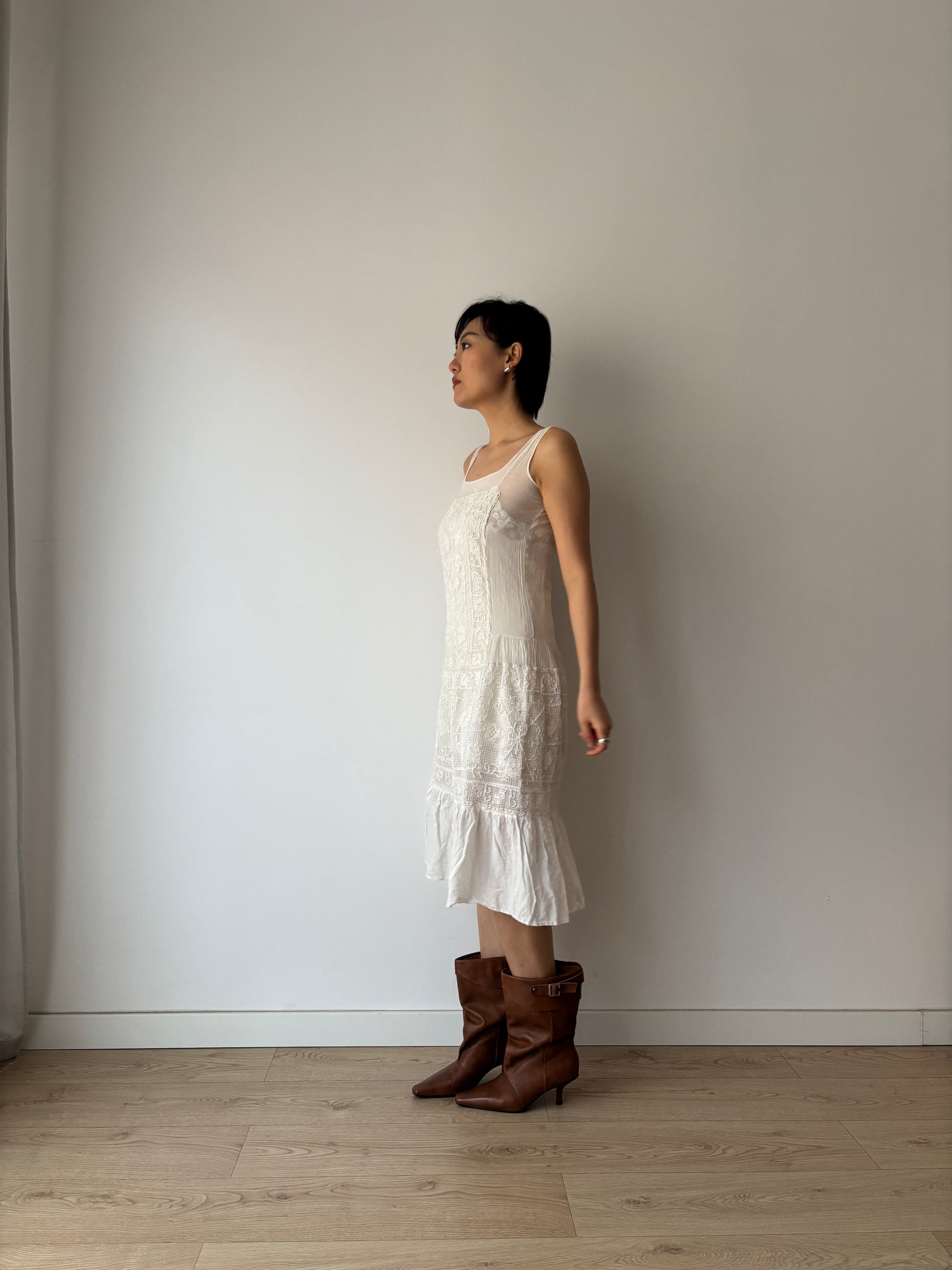 This delicate vintage 1930s dress is crafted from fine white cotton and features exquisite handmade lace with embroidered and knitted details. The lightweight, breathable fabric and romantic lacework evoke the elegance.