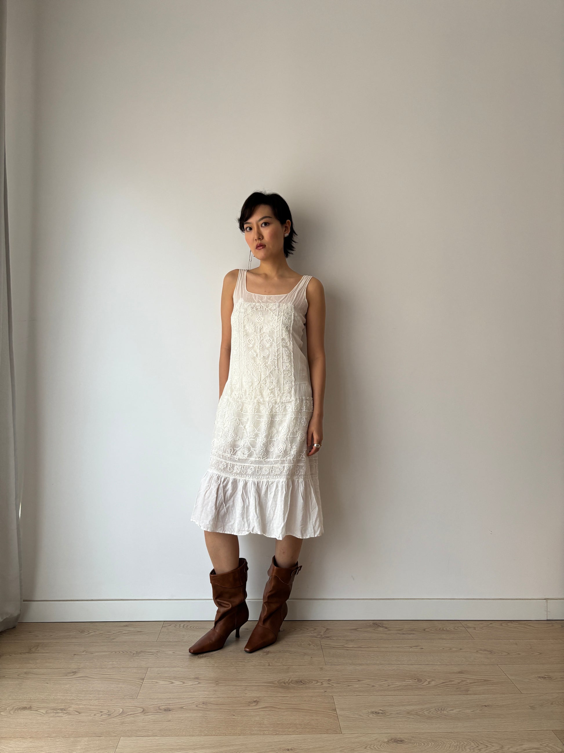 1930s White Cotton Lace NightDress: Handmade Embroidered & Knitted Details in Fine Cotton
