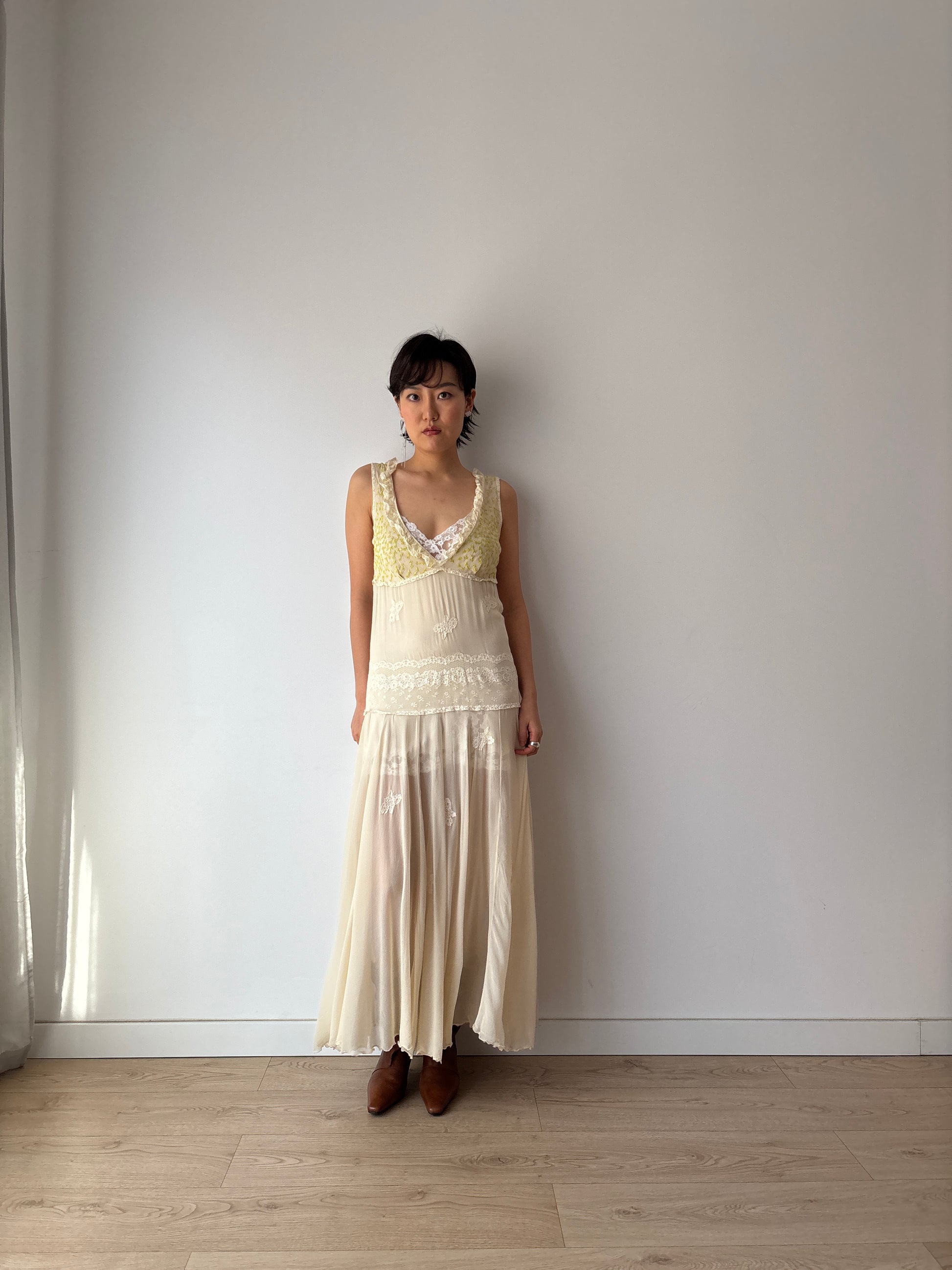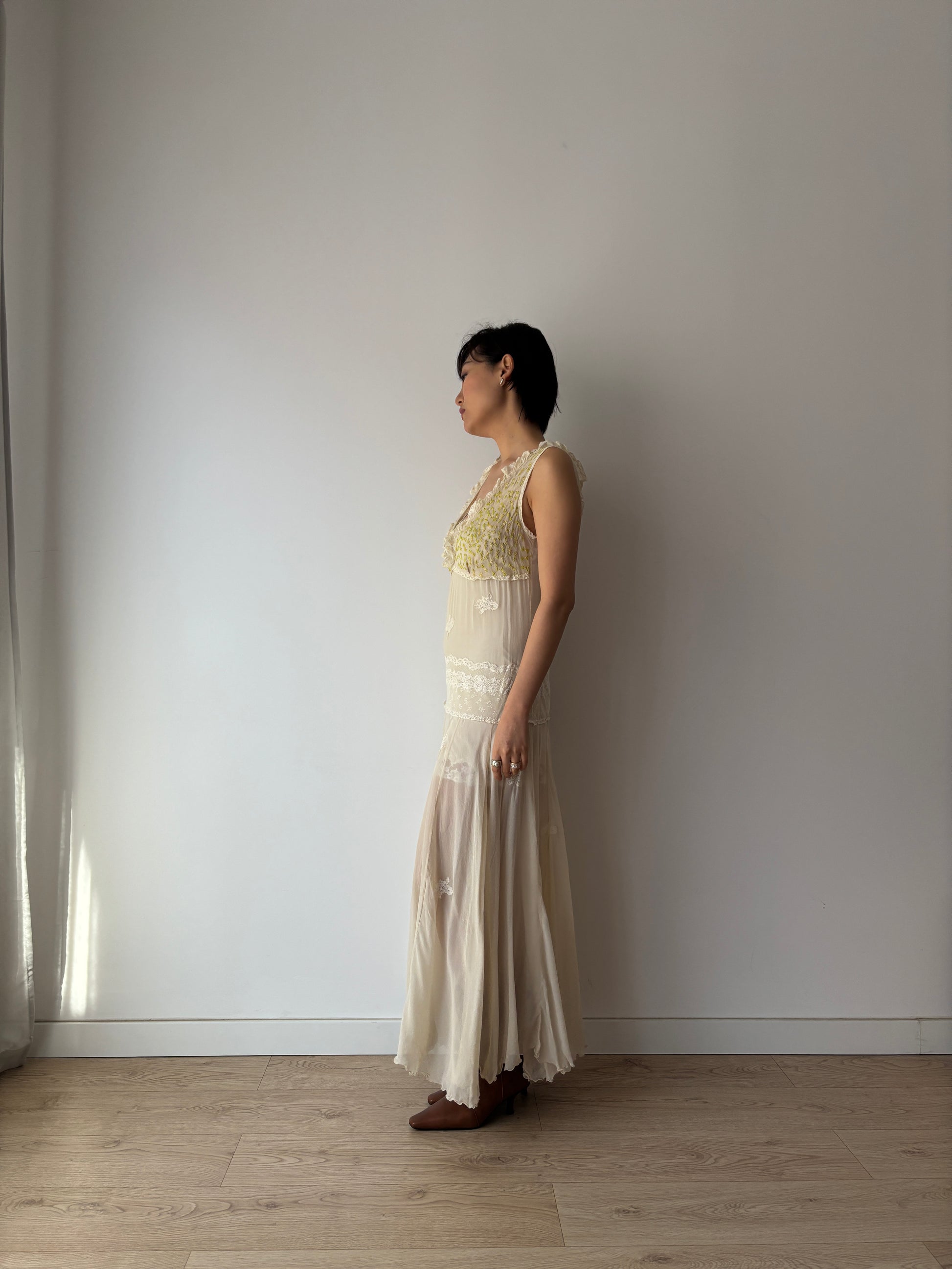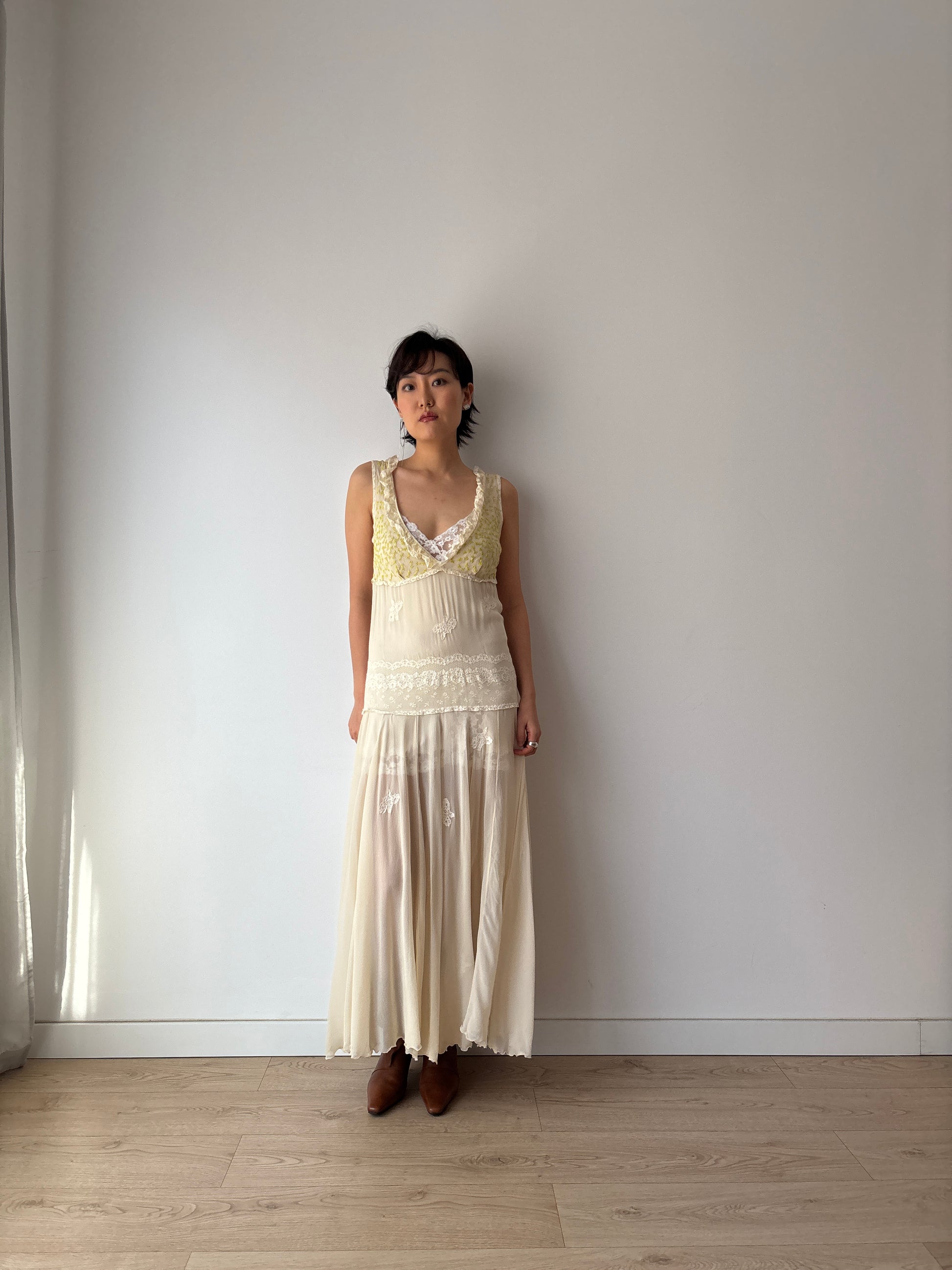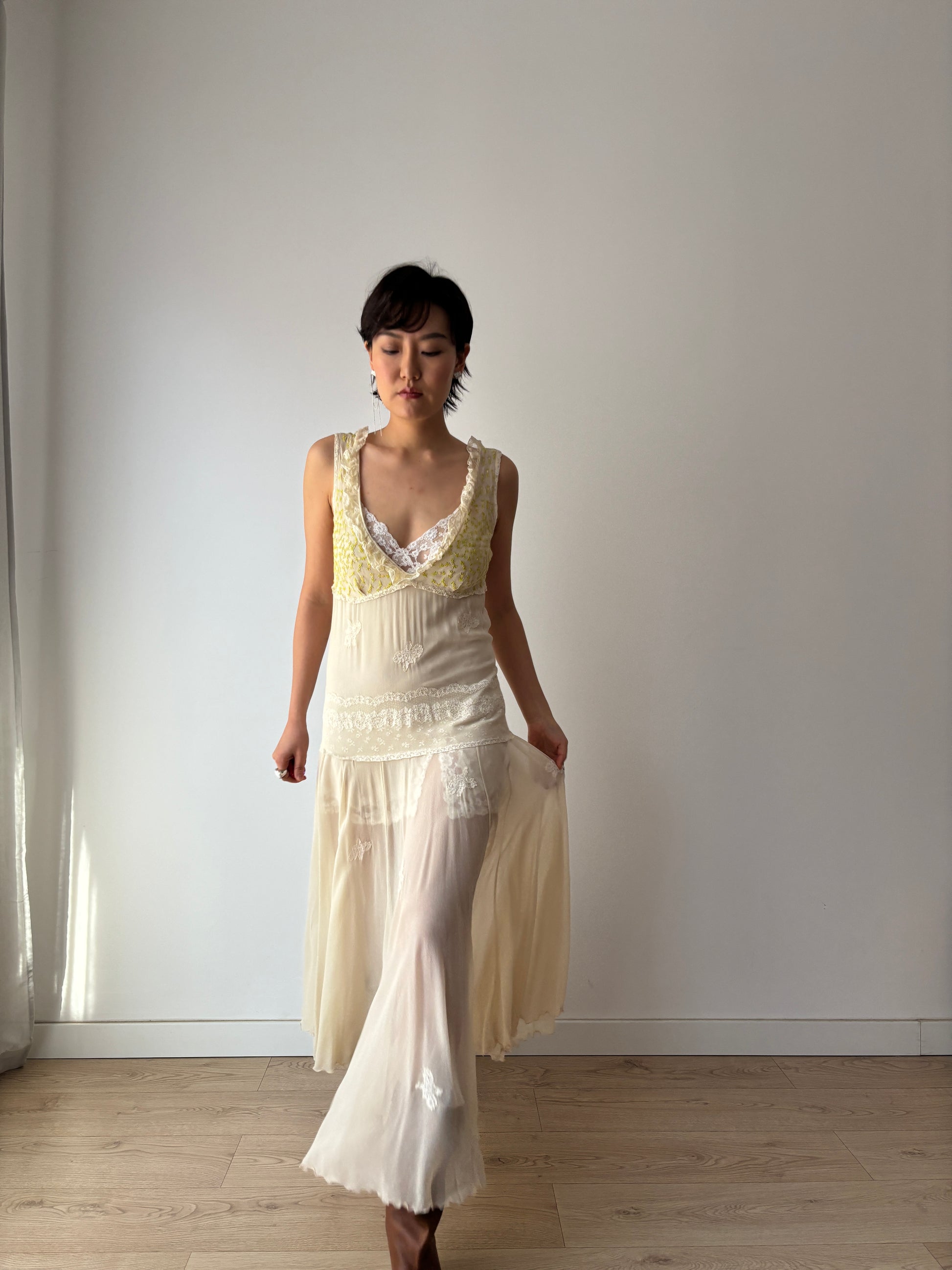 This exquisite 1930s white silk chiffon gown is a true masterpiece. Featuring rare, hand-embroidered flower appliqué all over the dress, also highlighting the delicate green leaves and yellow flowers on the bodice, it showcases unparalleled artistry. The ethereal chiffon drapes beautifully, creating a romantic and timeless silhouette. please noted that the inner slip is not included for sale.