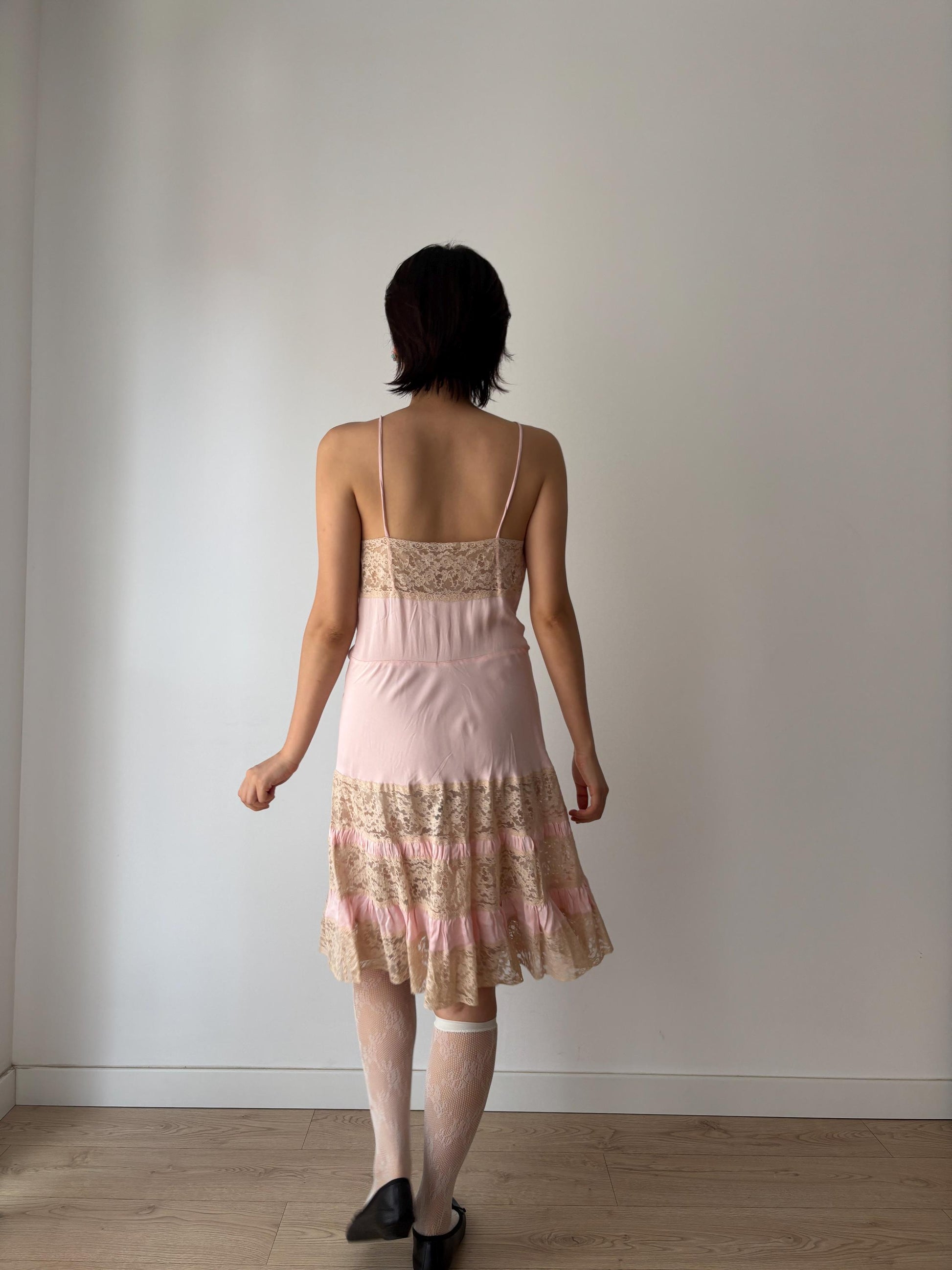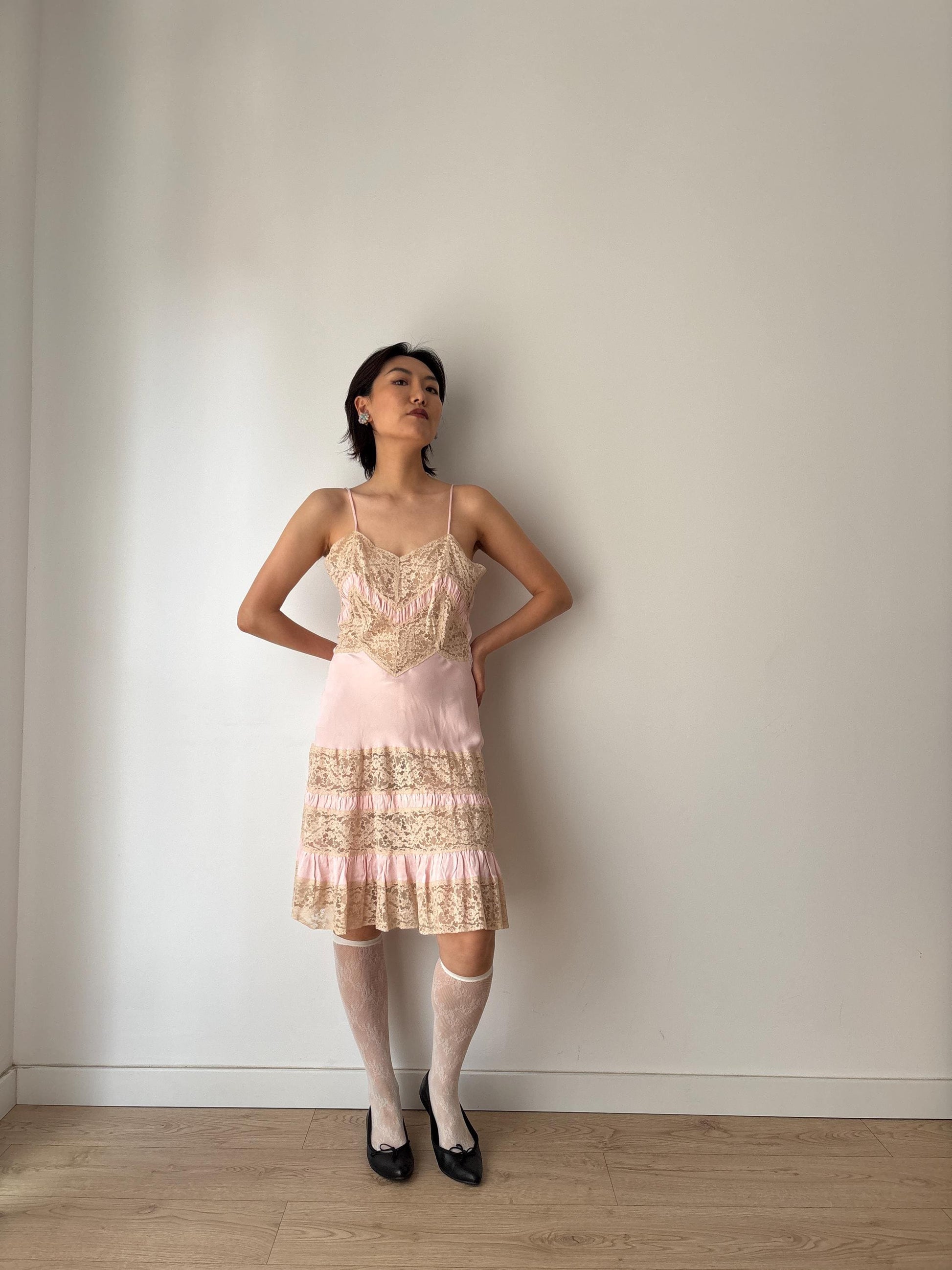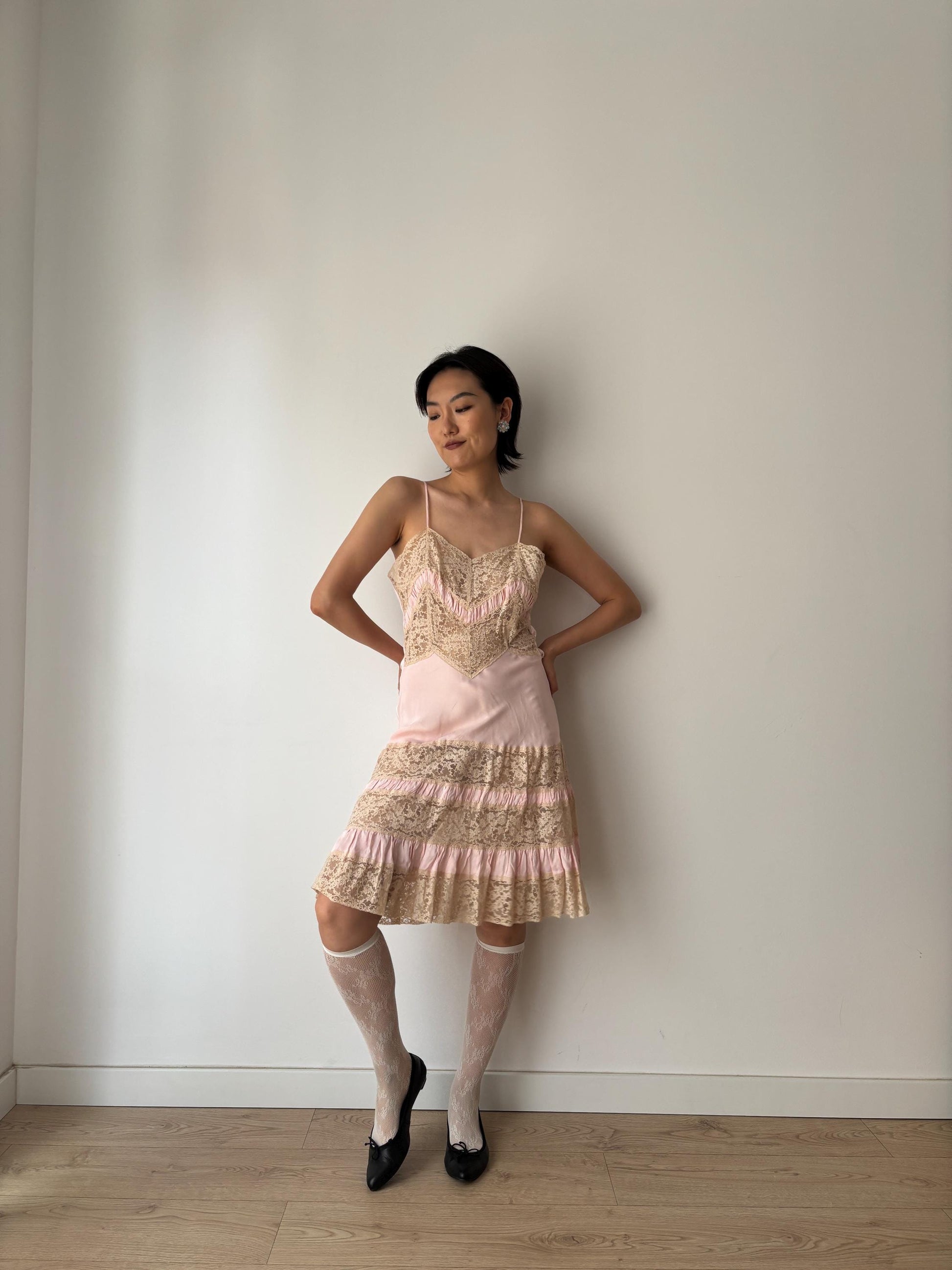 1940s 1950s Antique Pale Pink Lace Liquid Silk Satin Slip dress, Vintage lace mini dress