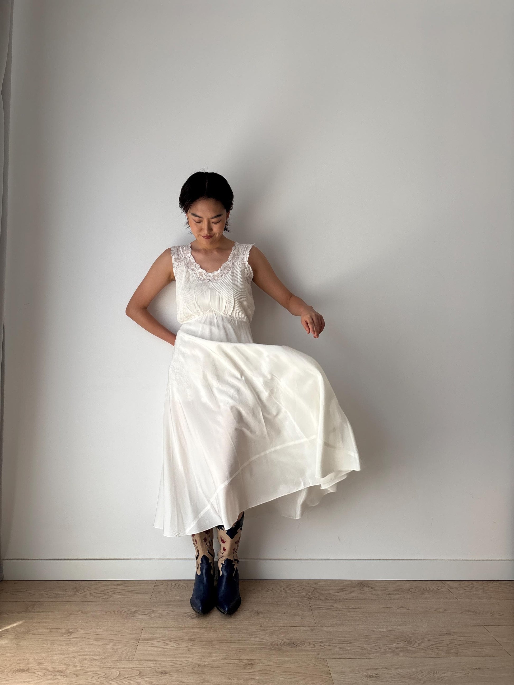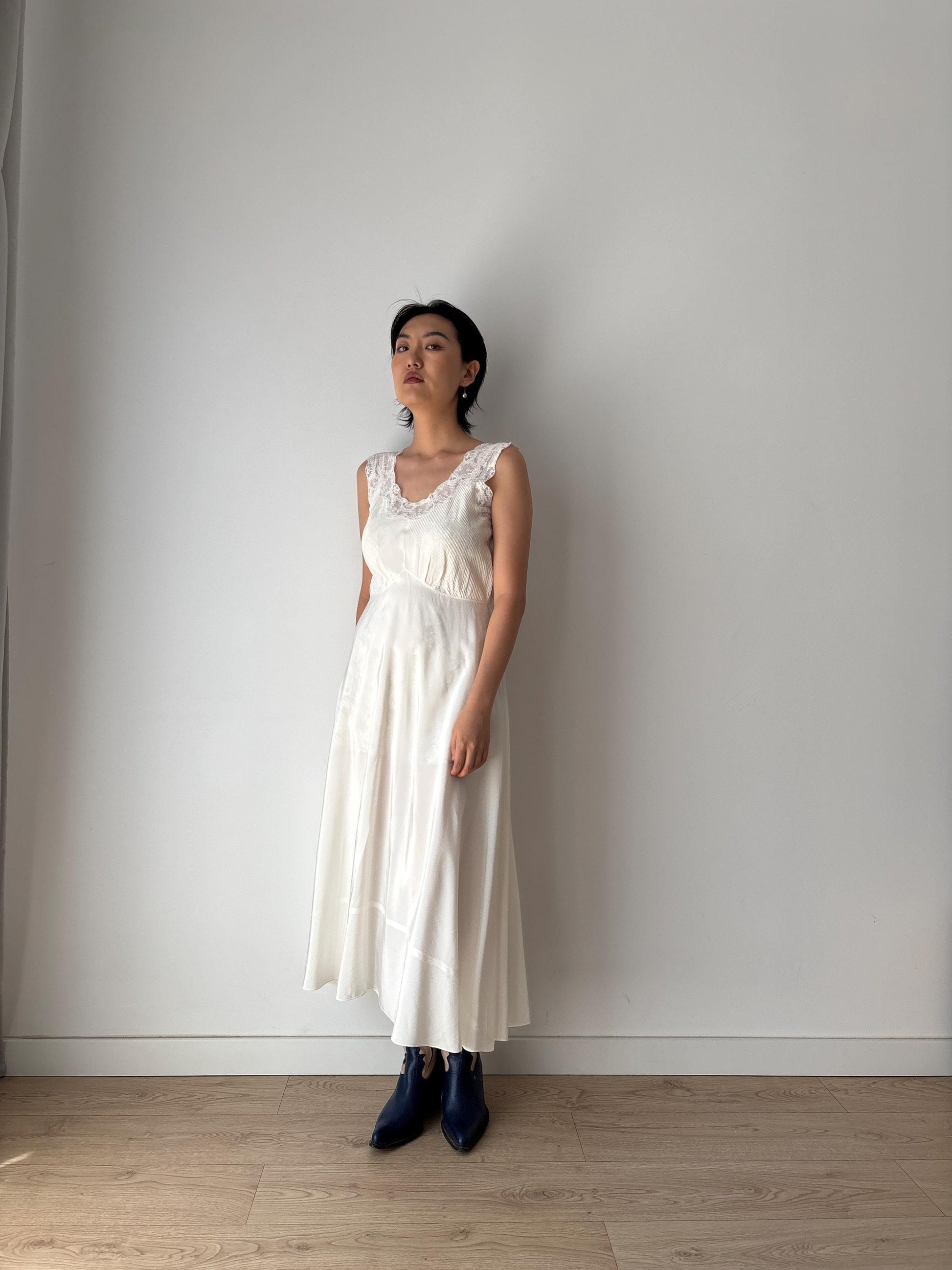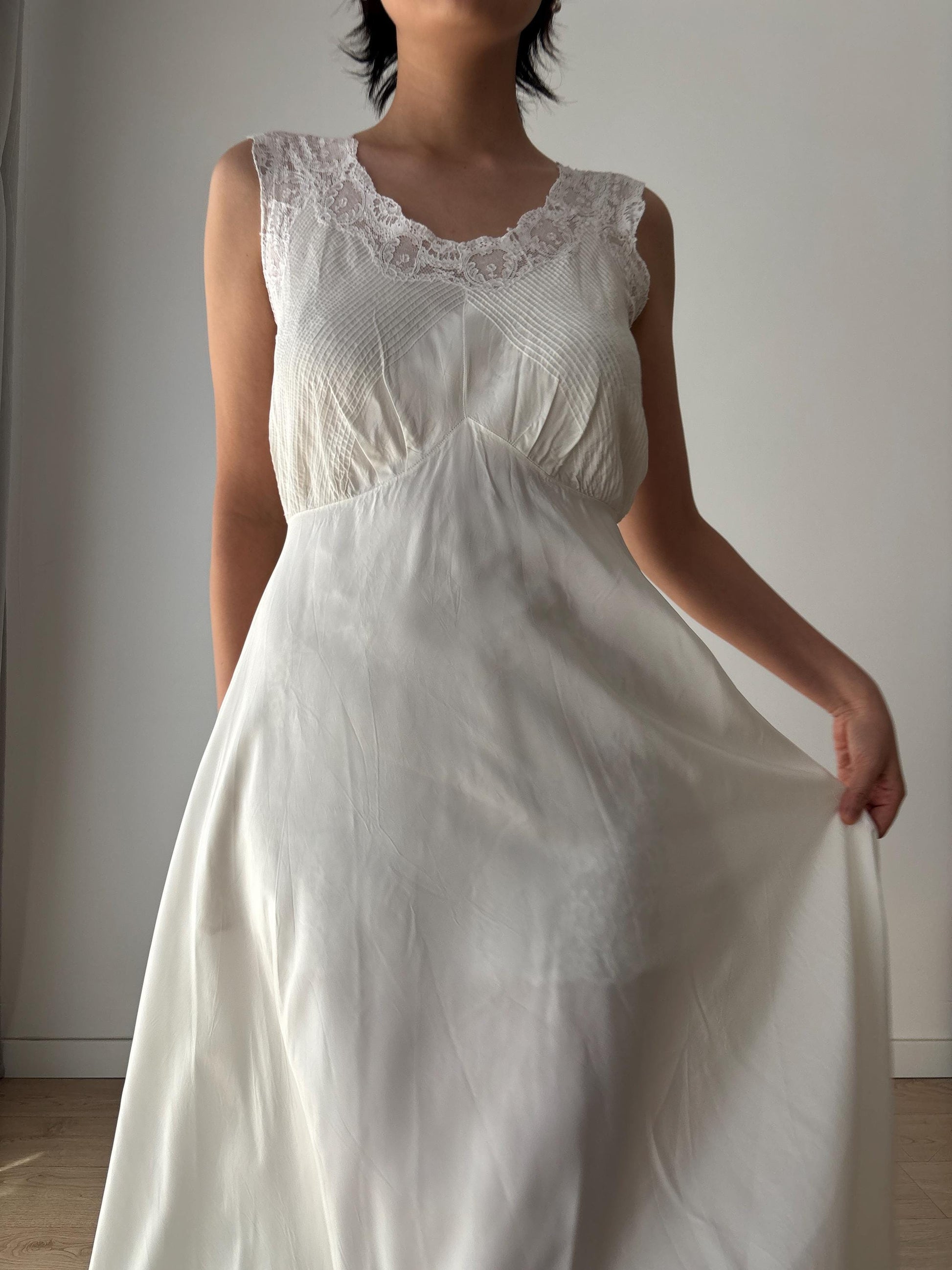1940s 1950s Antique White 100% Satin French Lace Long Maxi dress
