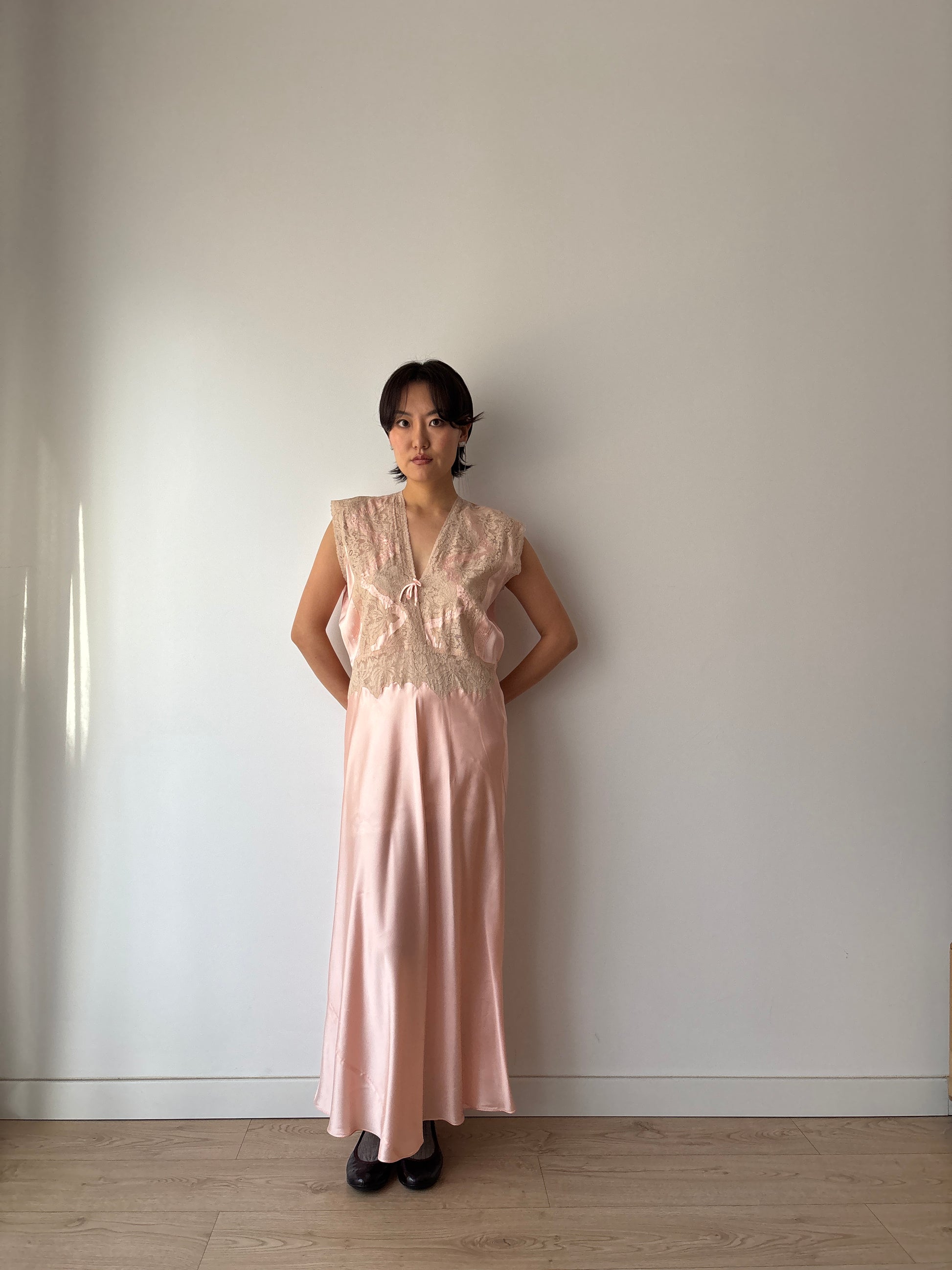 Vintage 1940s pink lace hand embroidered satin bias cut dress