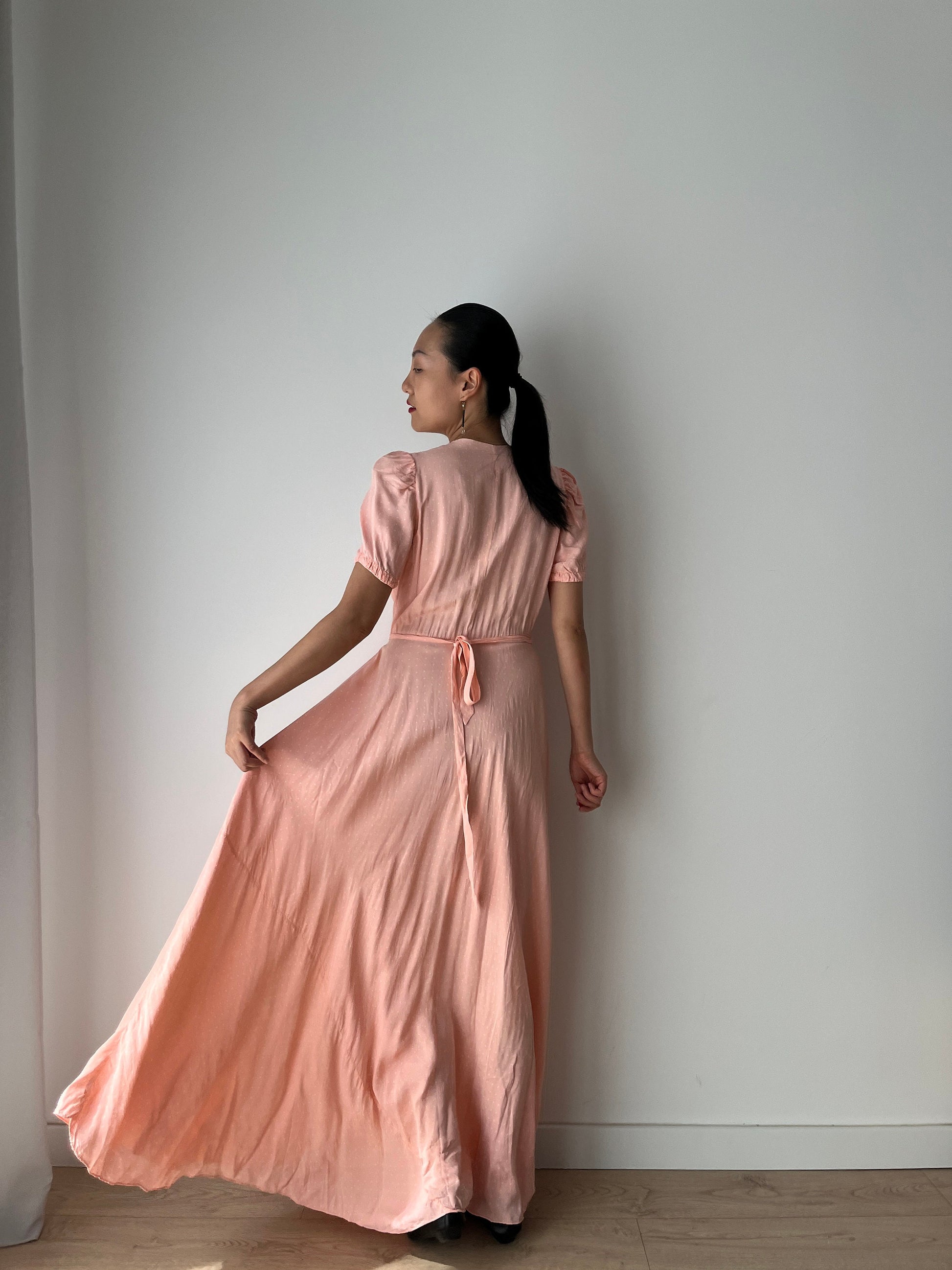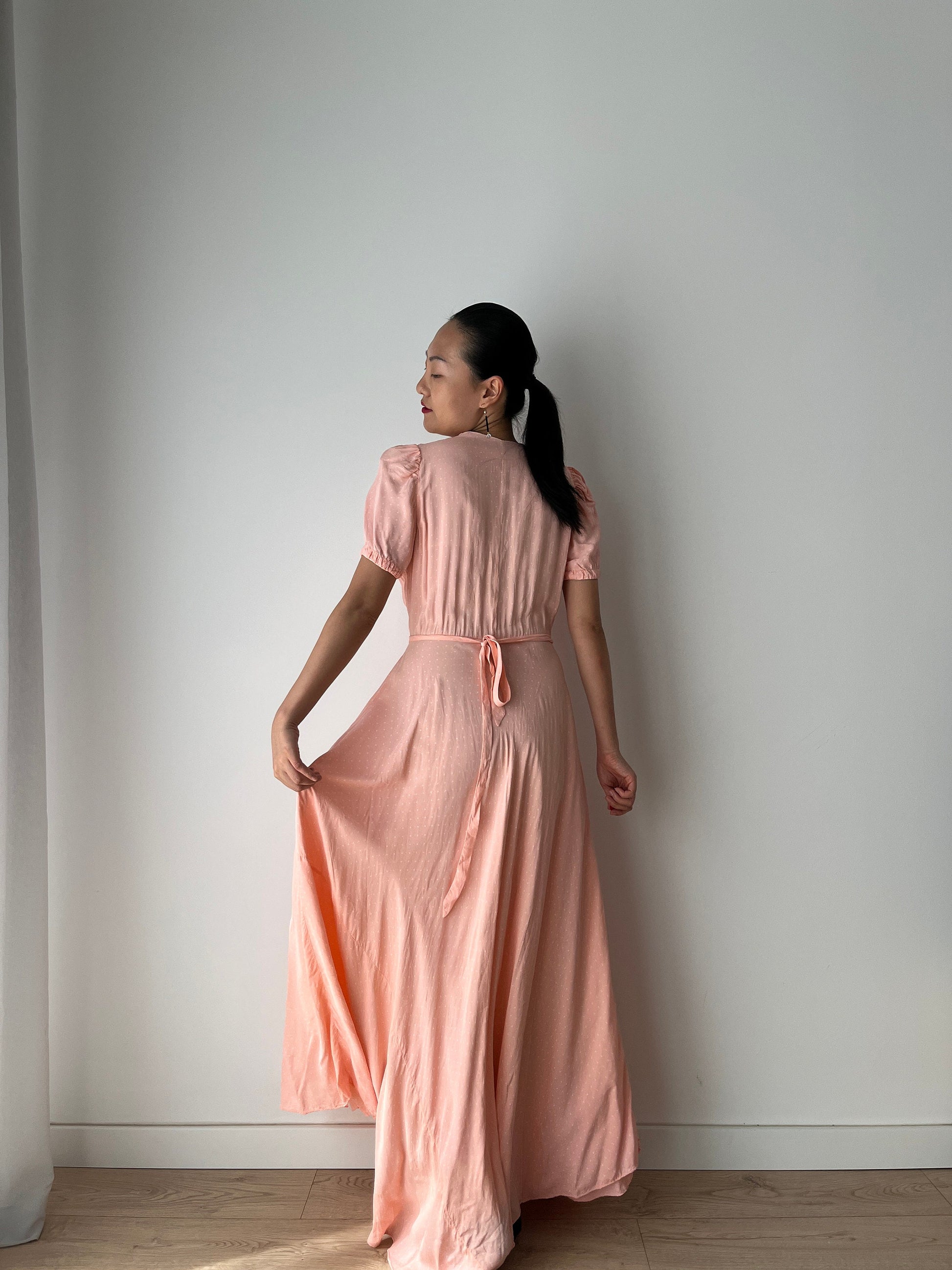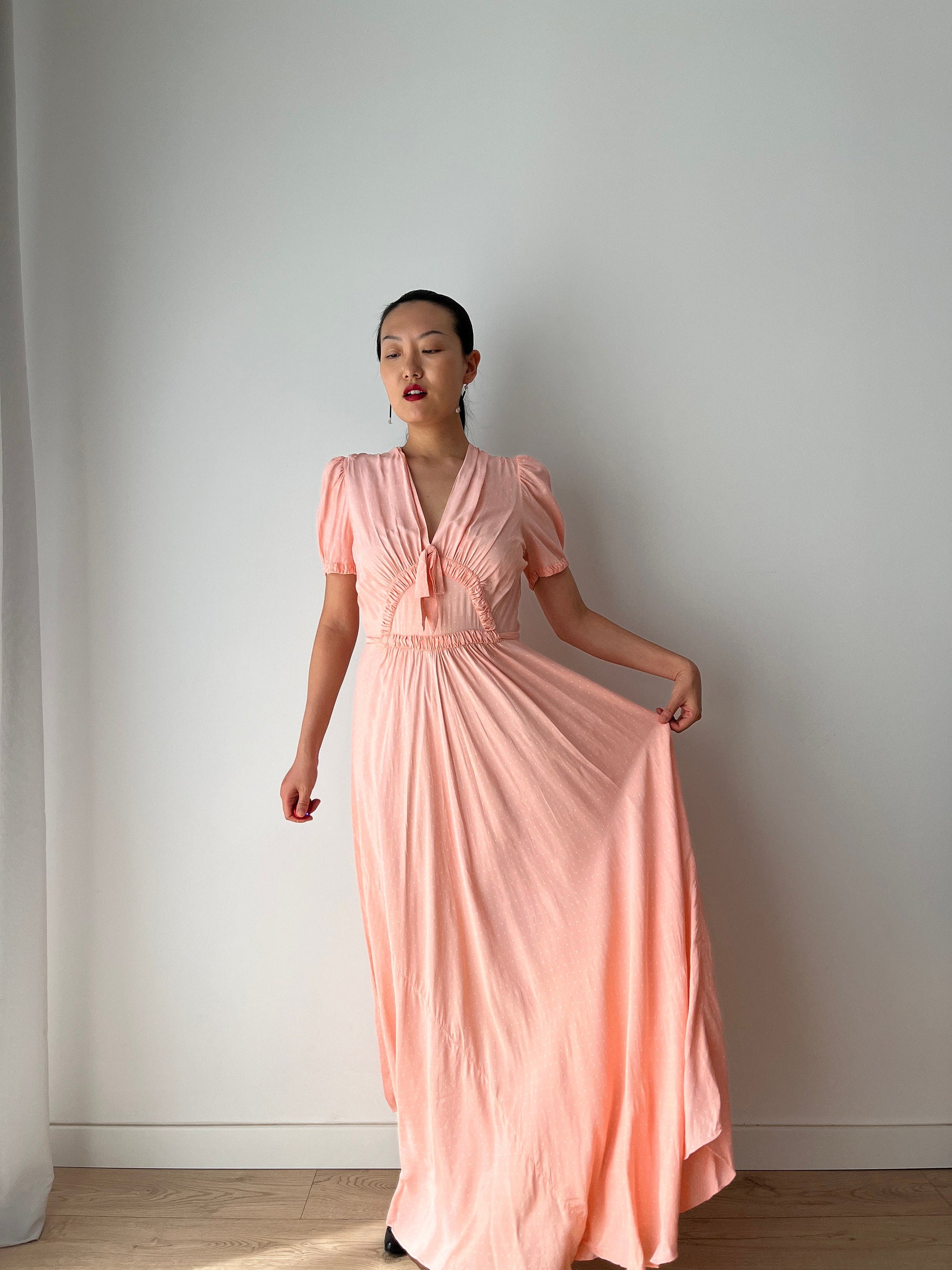 1940s Antique Bias Cut Pastel Pink Rayon Dots Print Bow Dress