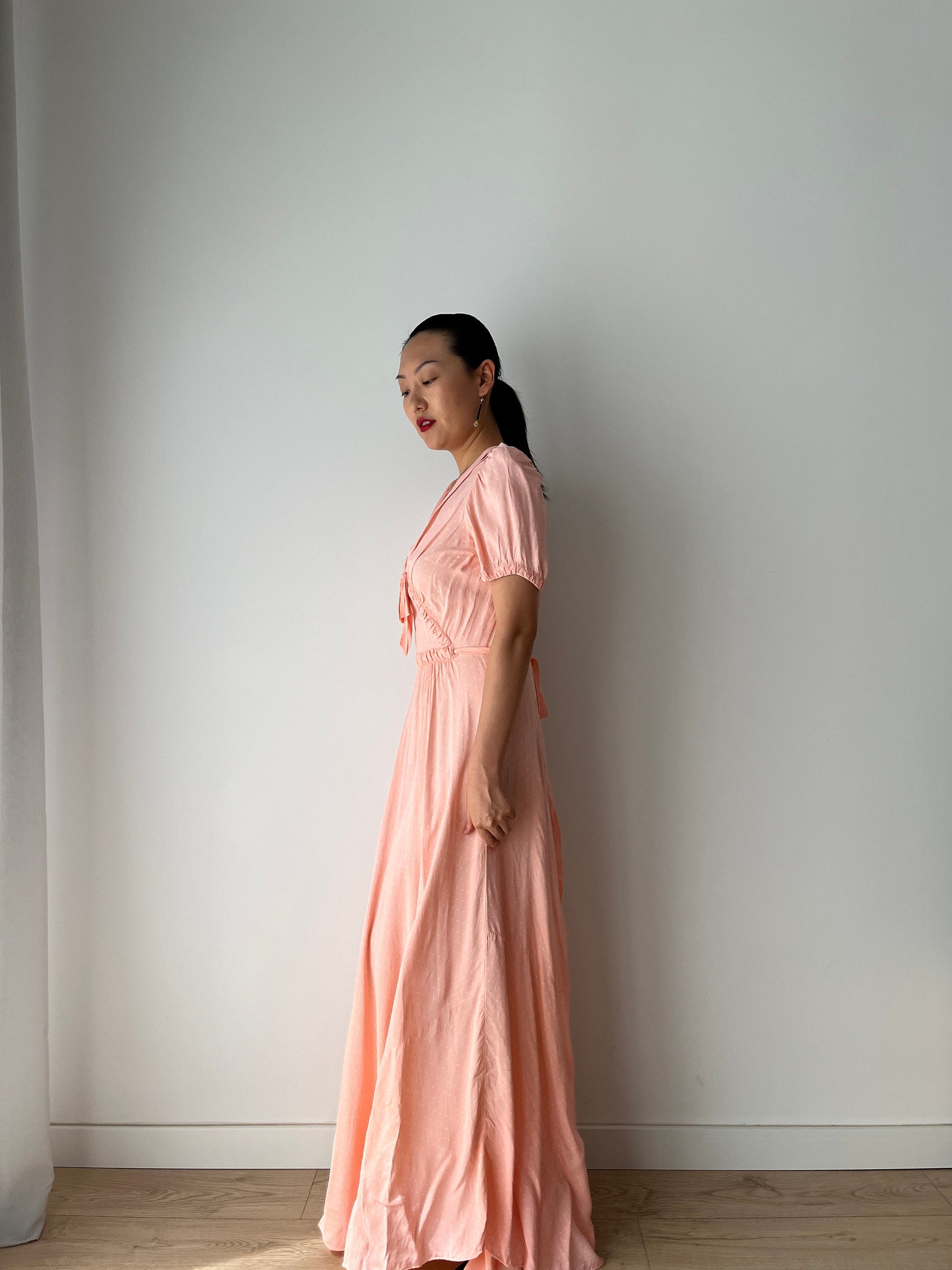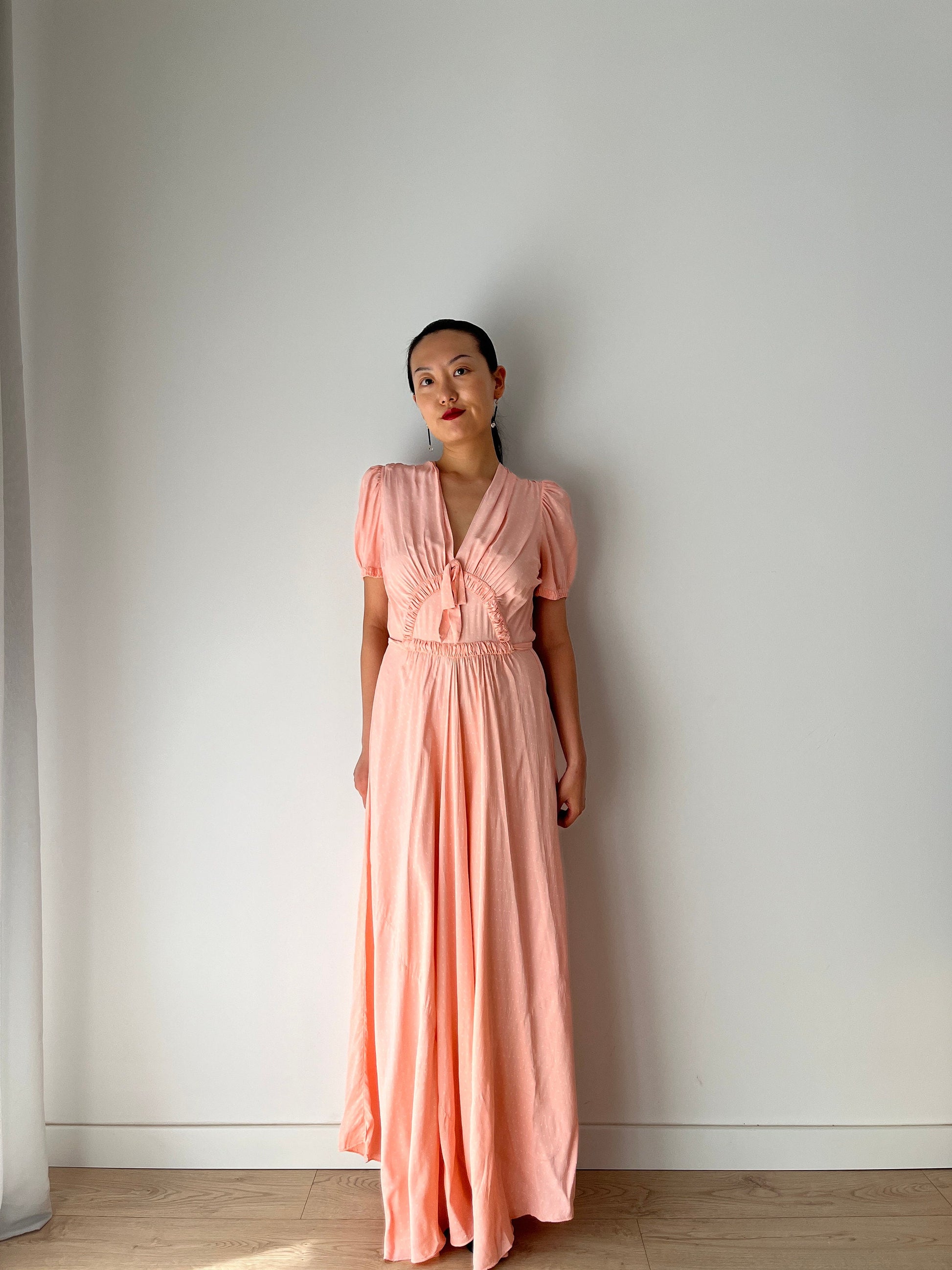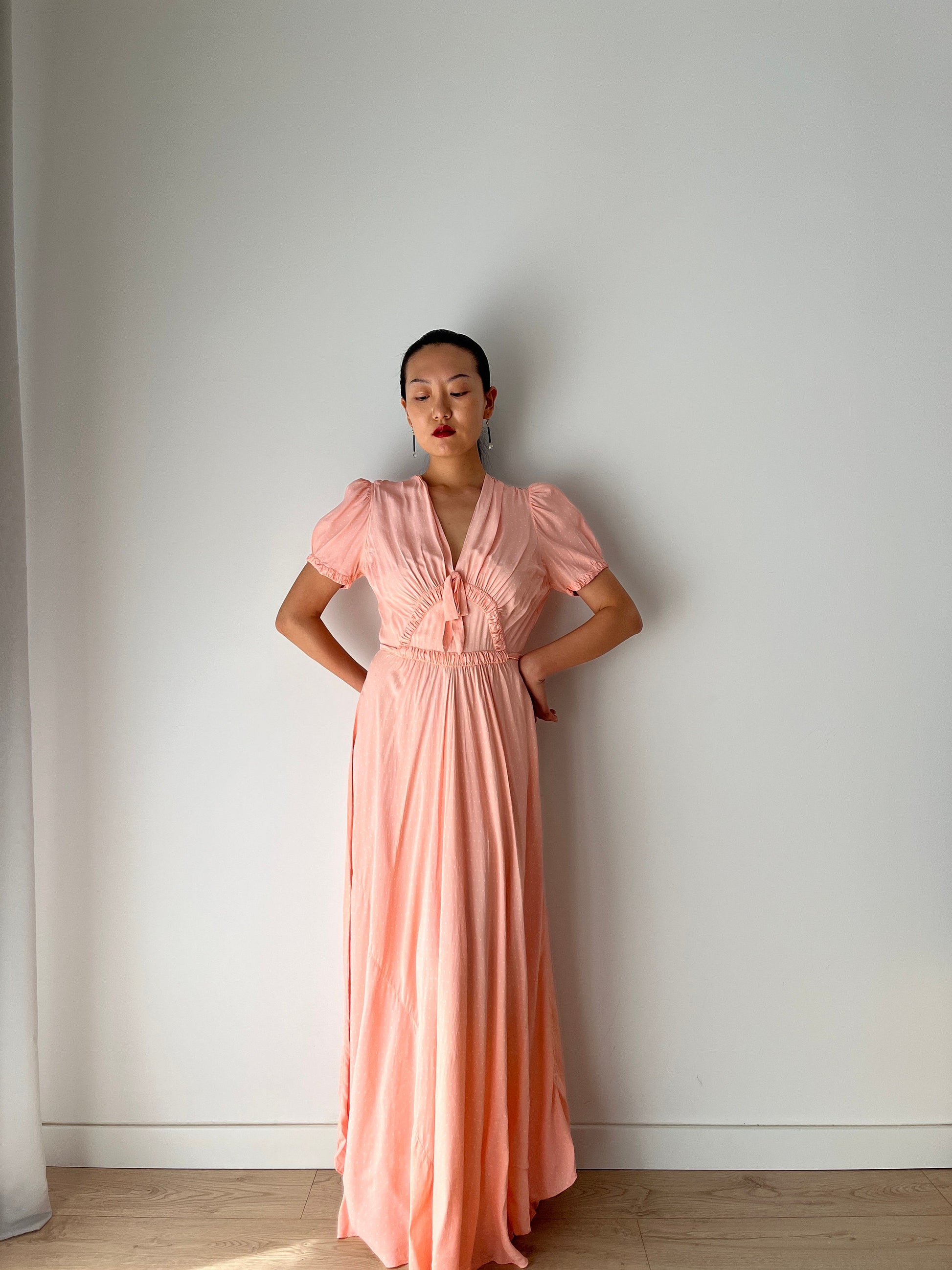 1940s Antique Bias Cut Pastel Pink Rayon Dots Print Bow Dress