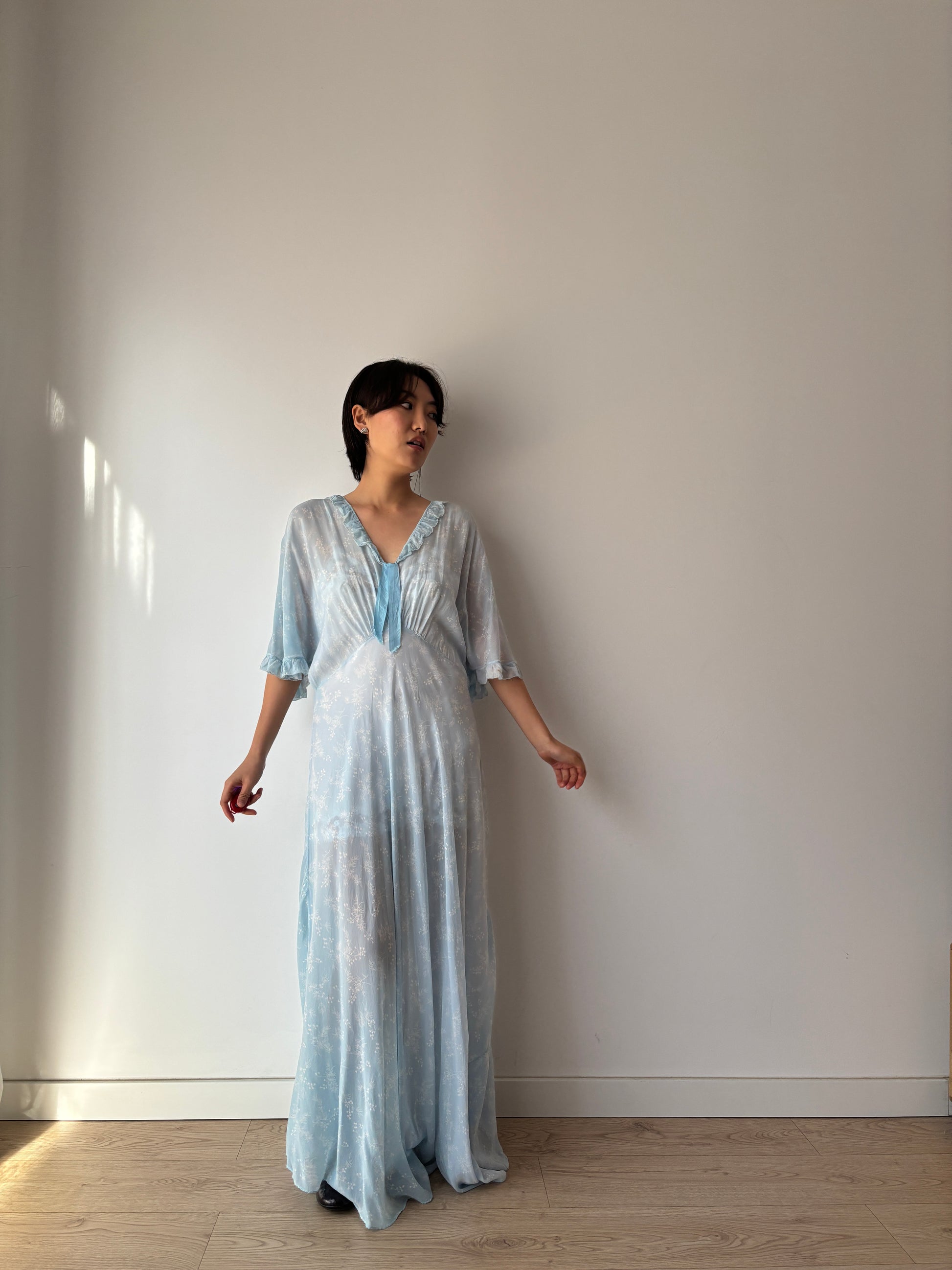 Vintage 1940s Blue Floral Silk Nightgown - Bias Cut, Maxi Length