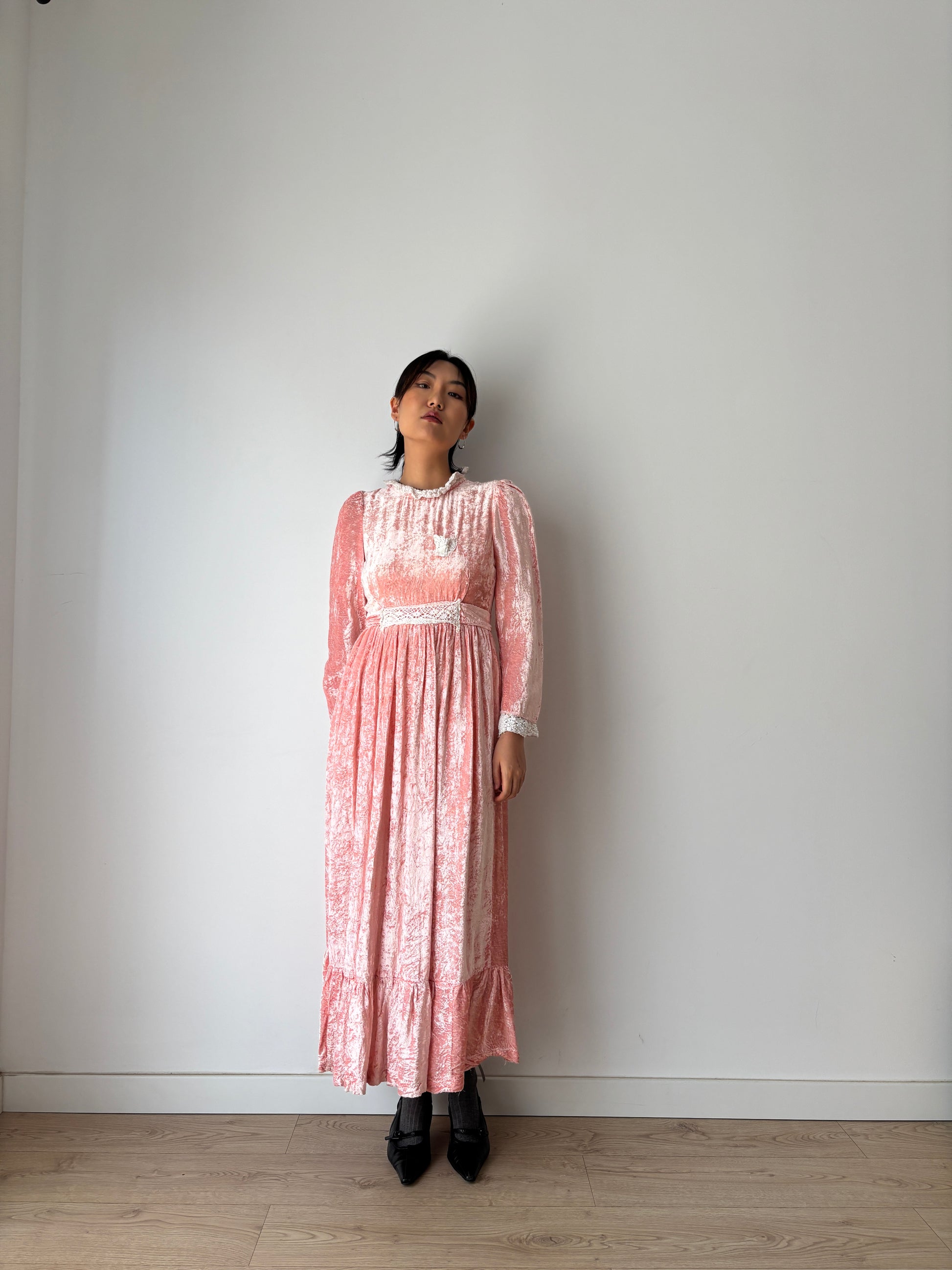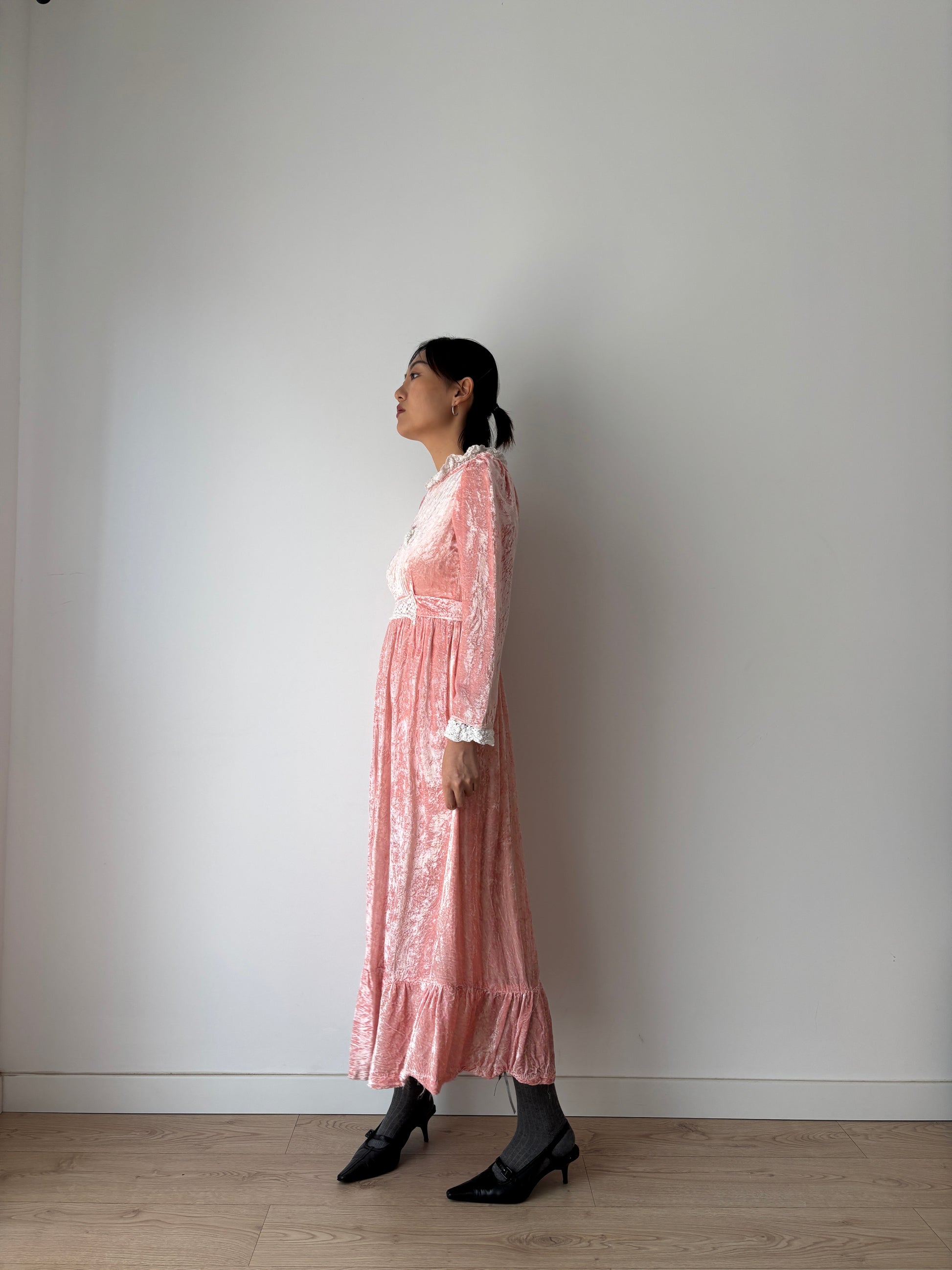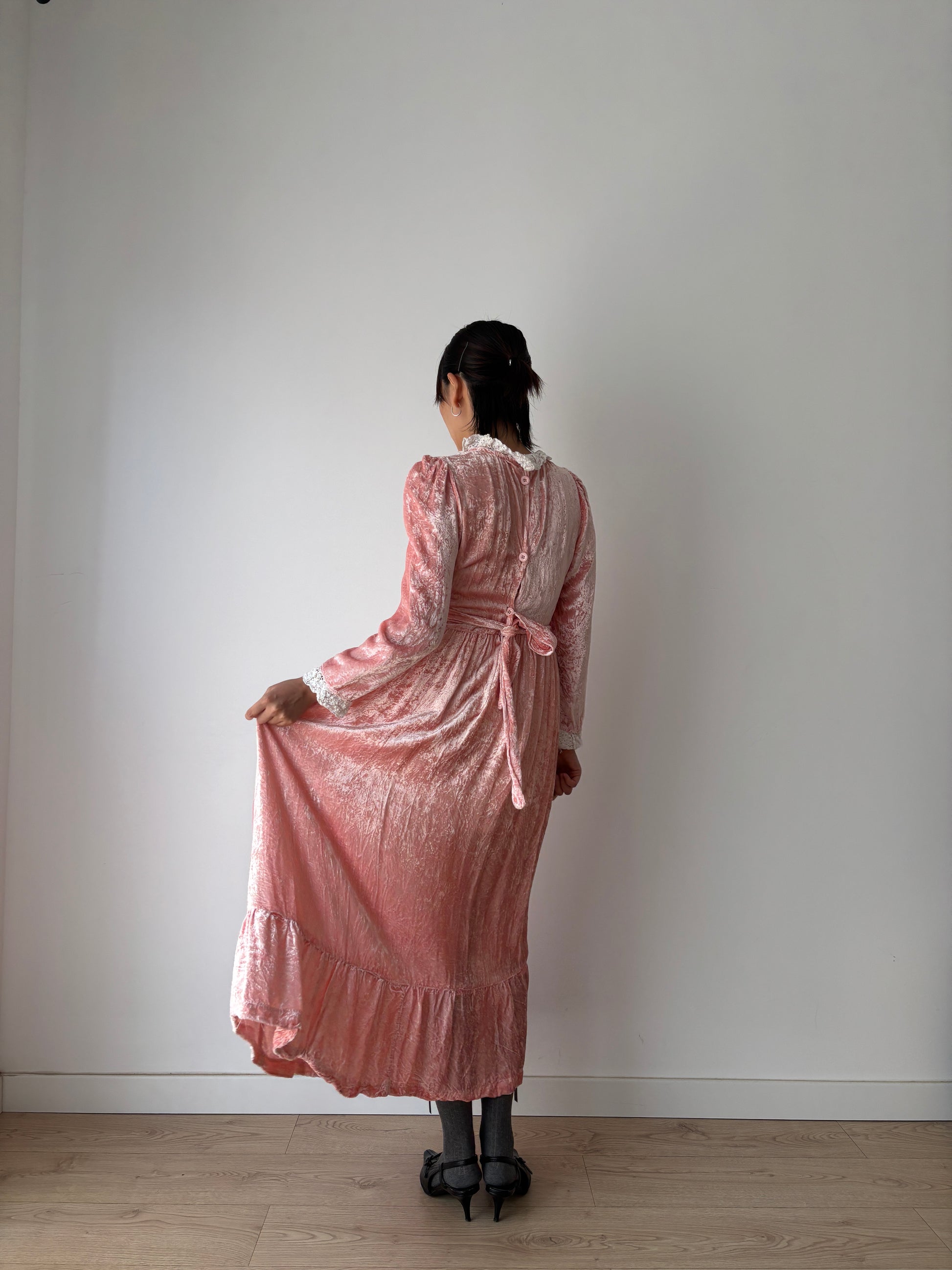 1940s Vintage lace pink velvet dress, back zipper closure, attached waist ribbon.