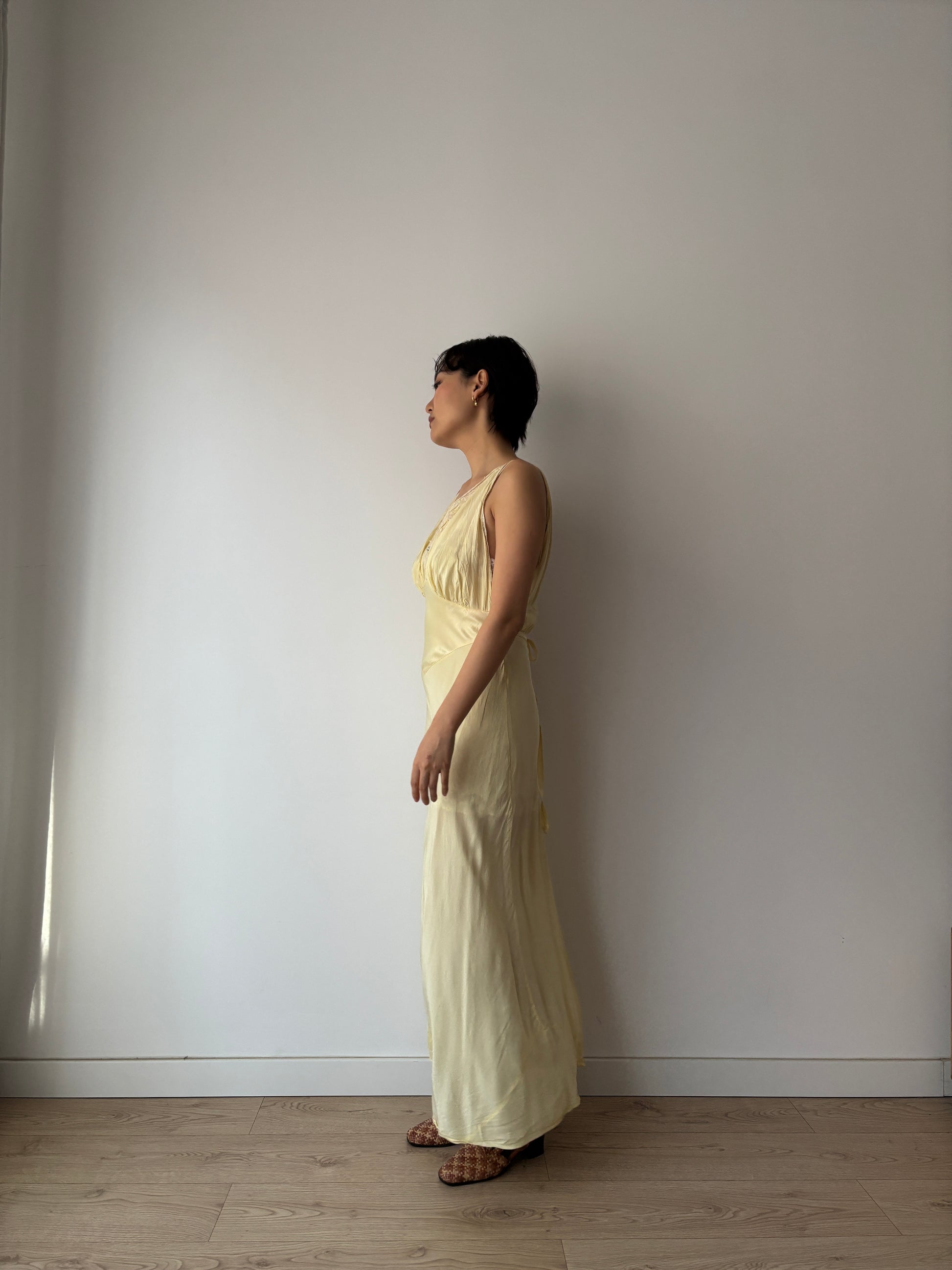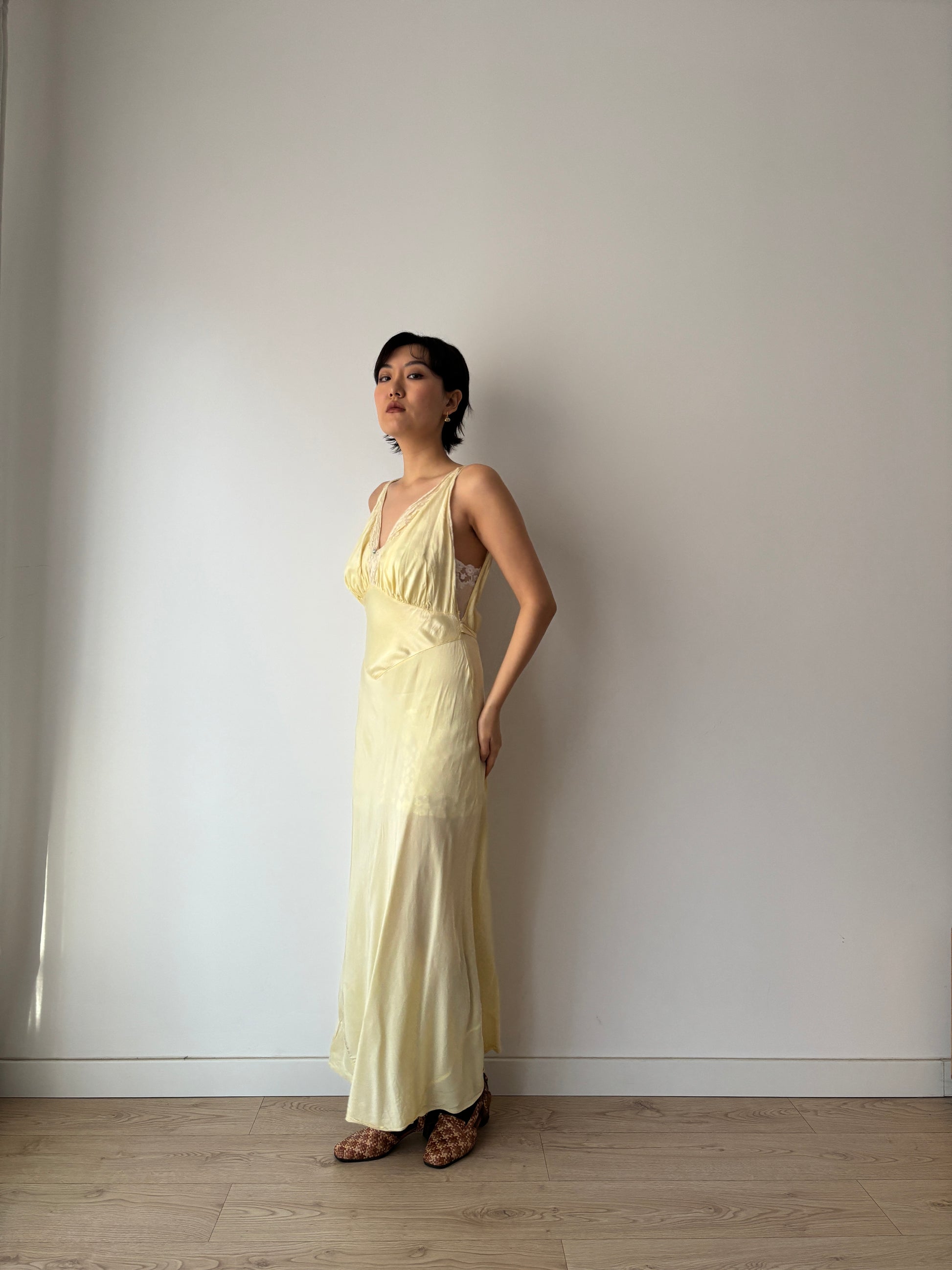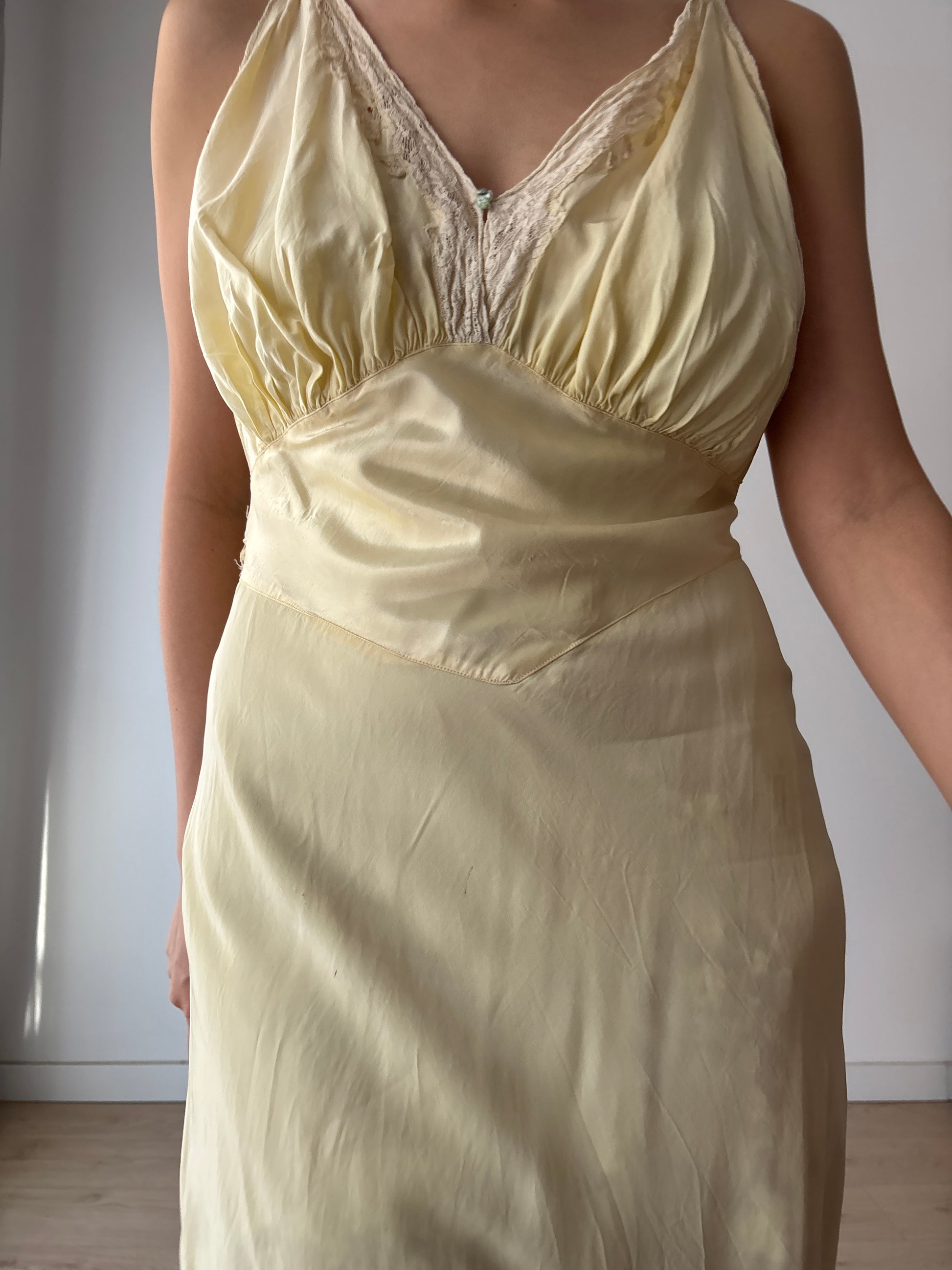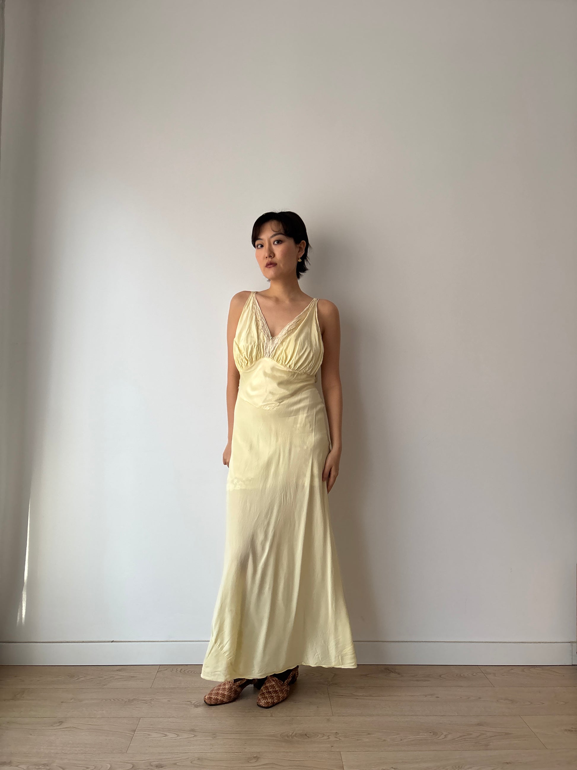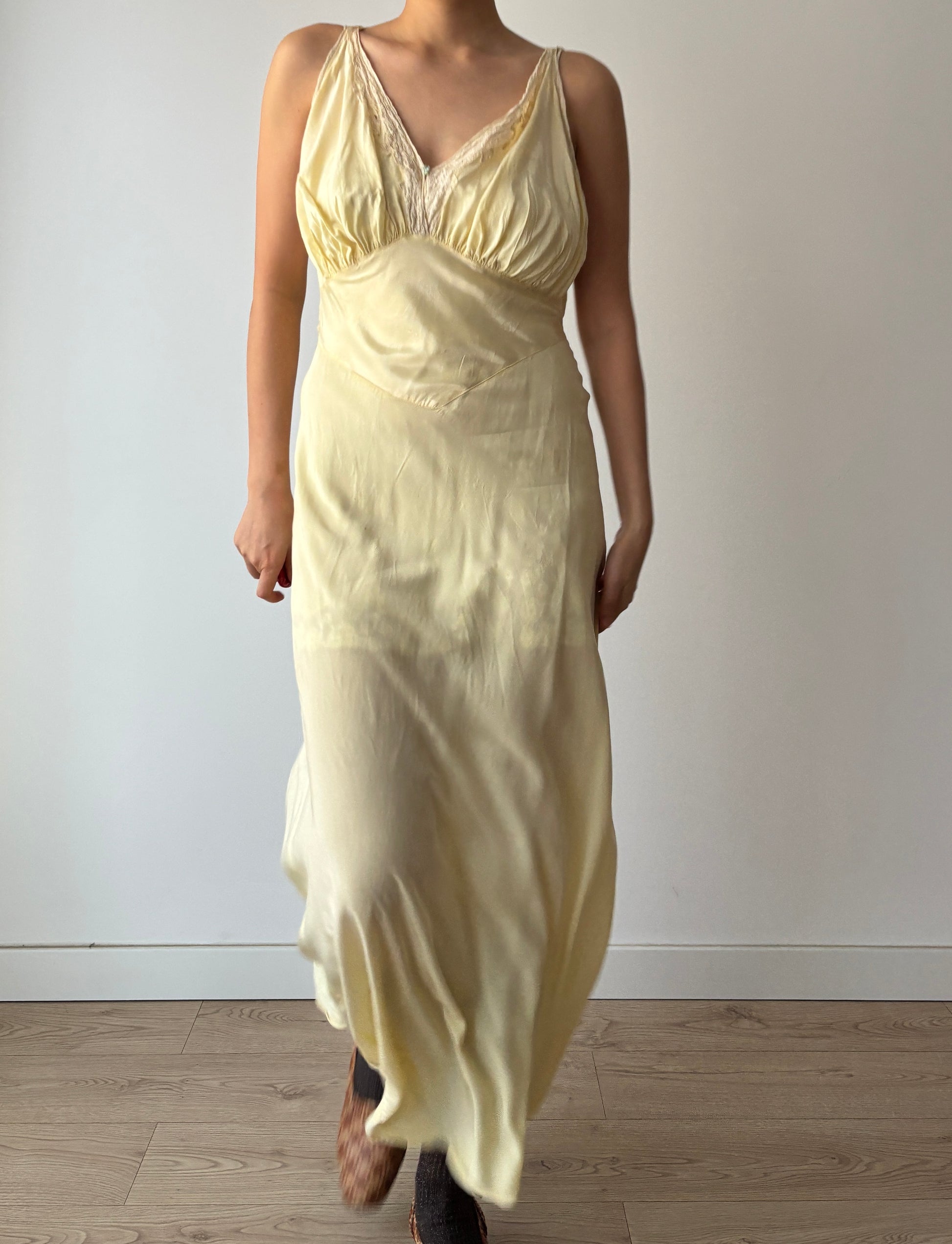 stunning 1940s yellow rayon satin slip dress features delicate lace, cut on the bias for a graceful, flowing silhouette. The maxi length adds elegance.