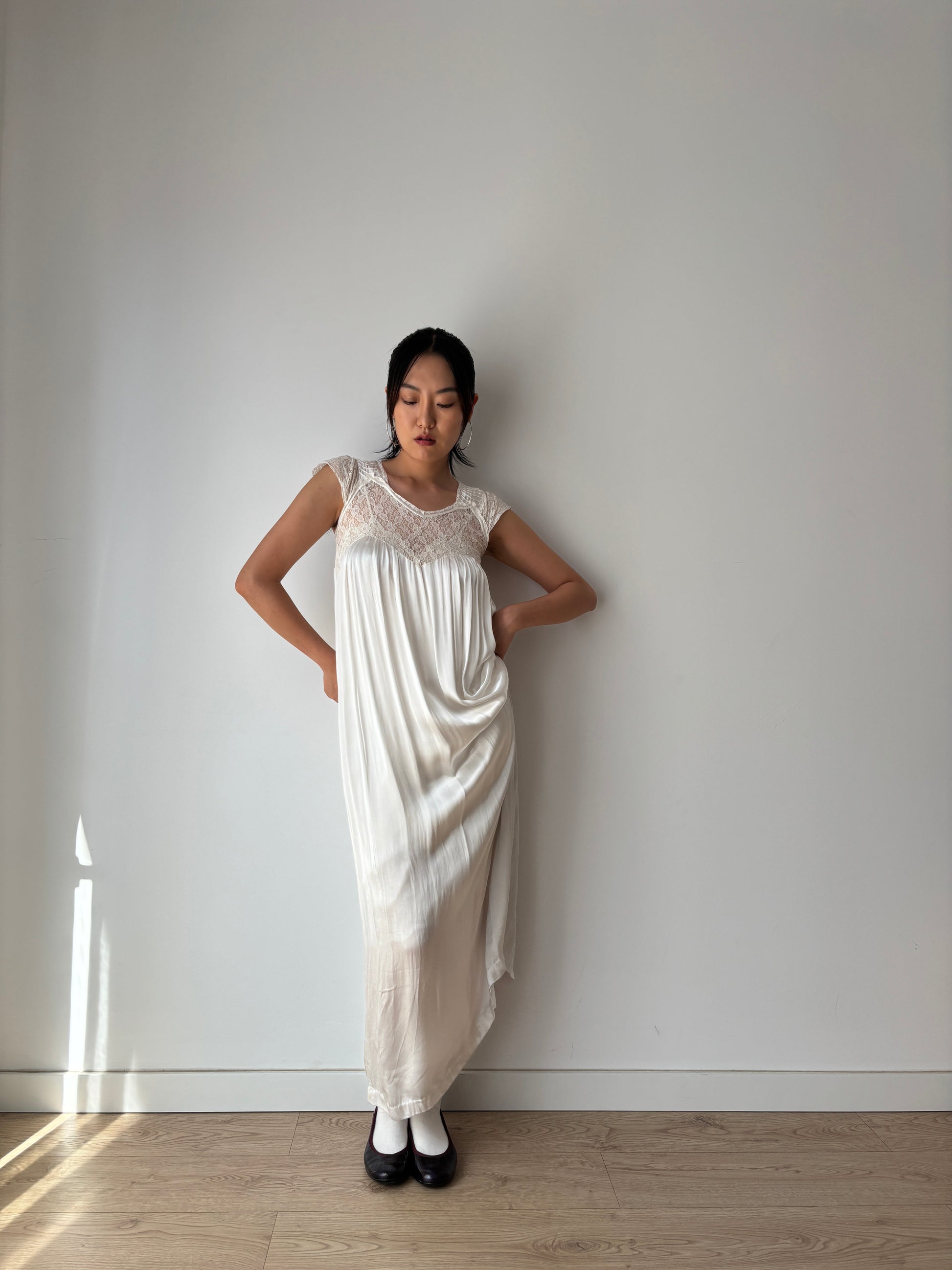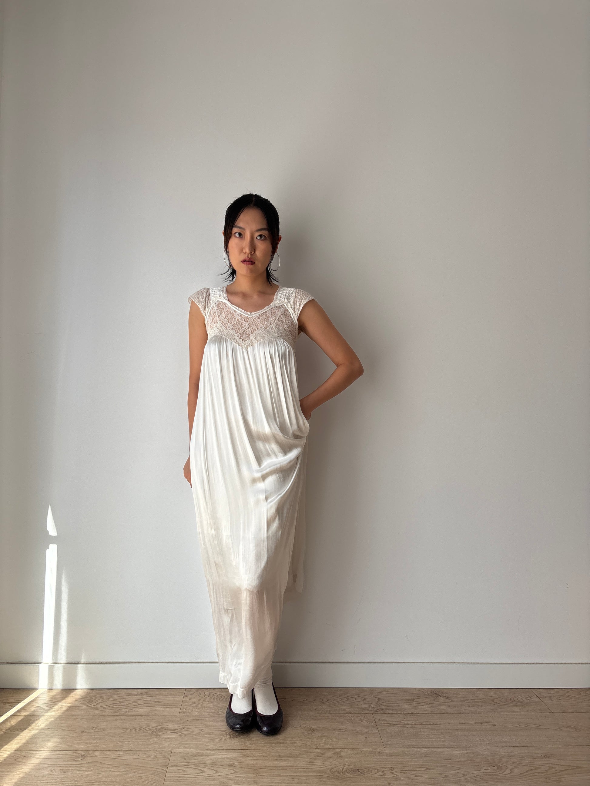 1950s Antique Silk Satin Bridal Dress, Floral Lace Maxi Gown