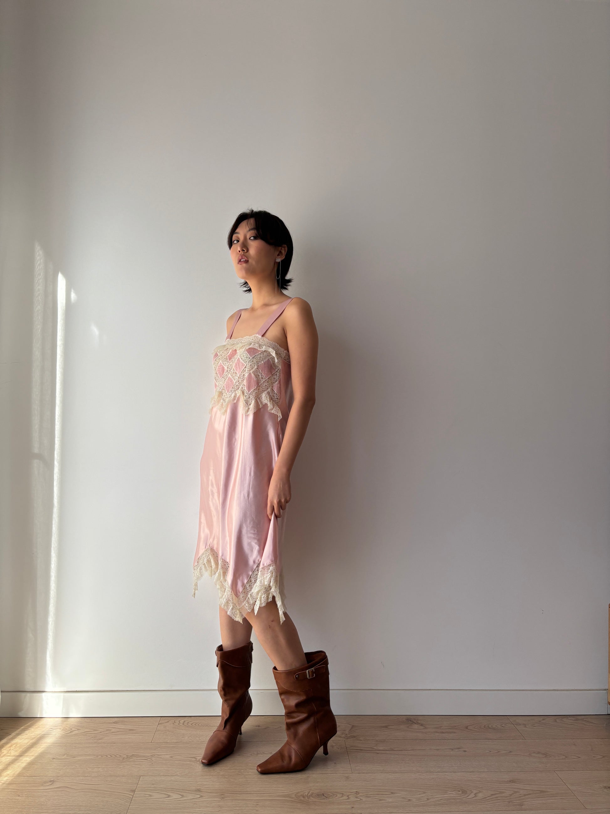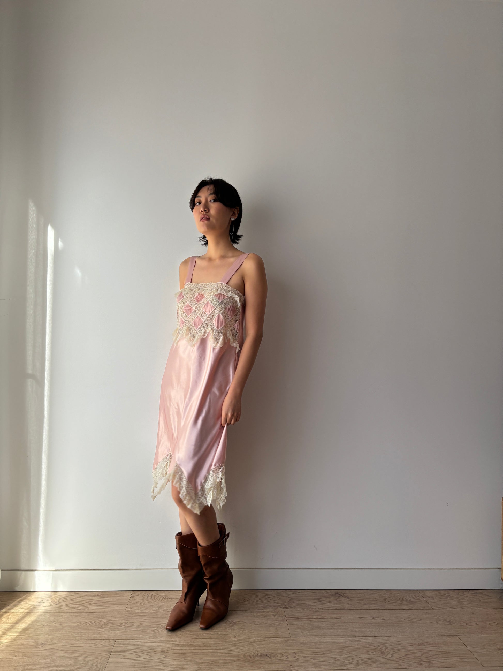 Vintage 1980s Short Nightgown in Pink - Rayon Lace with Floral Embroidery