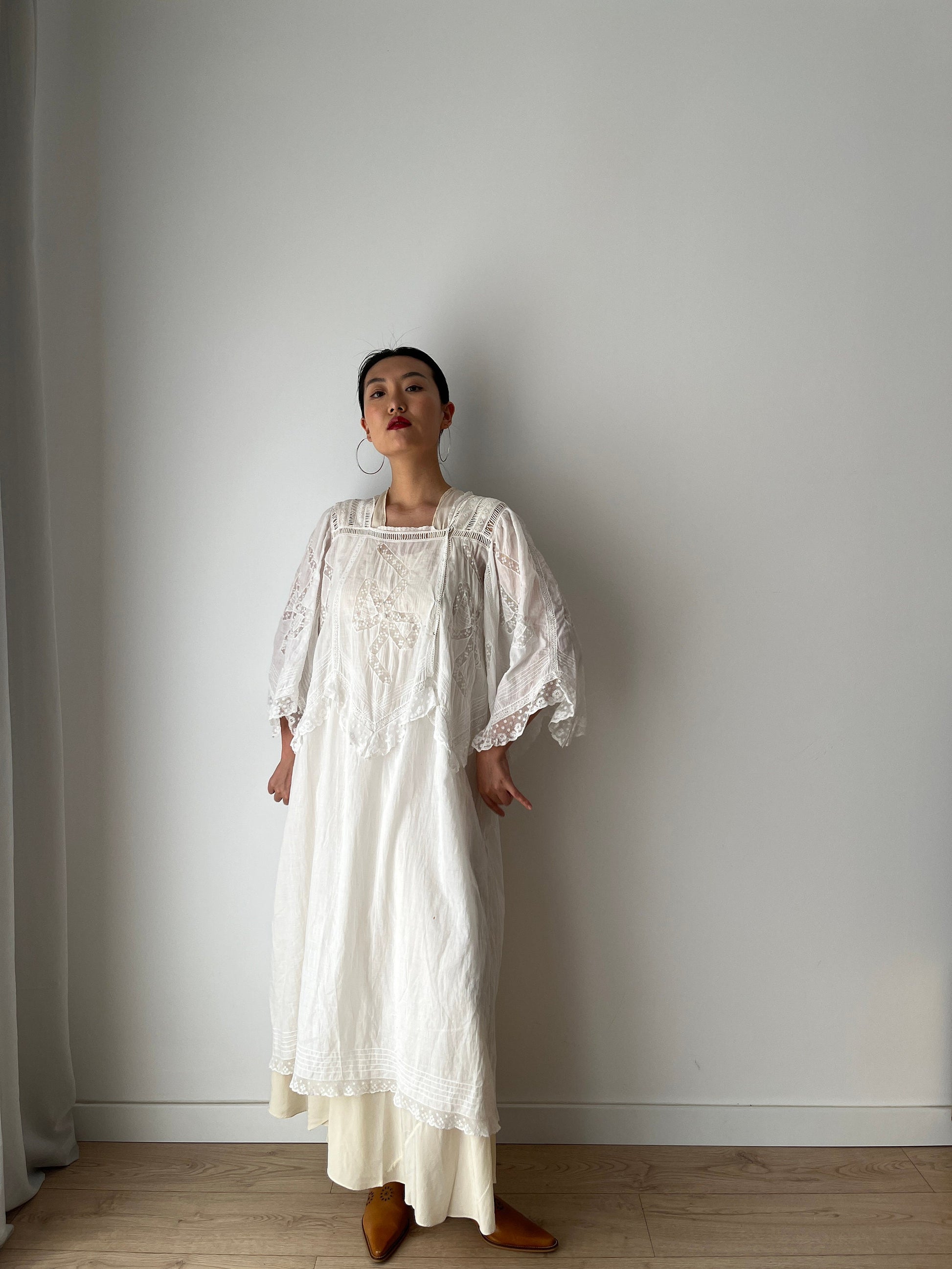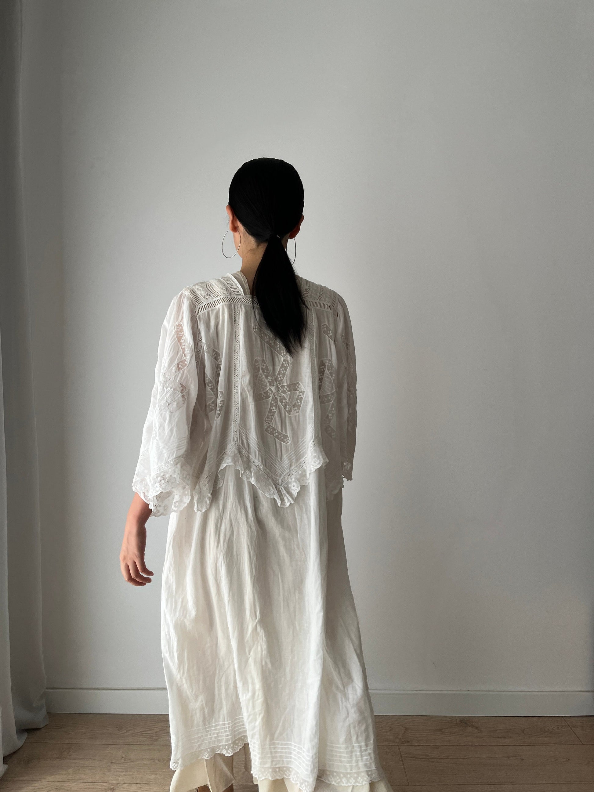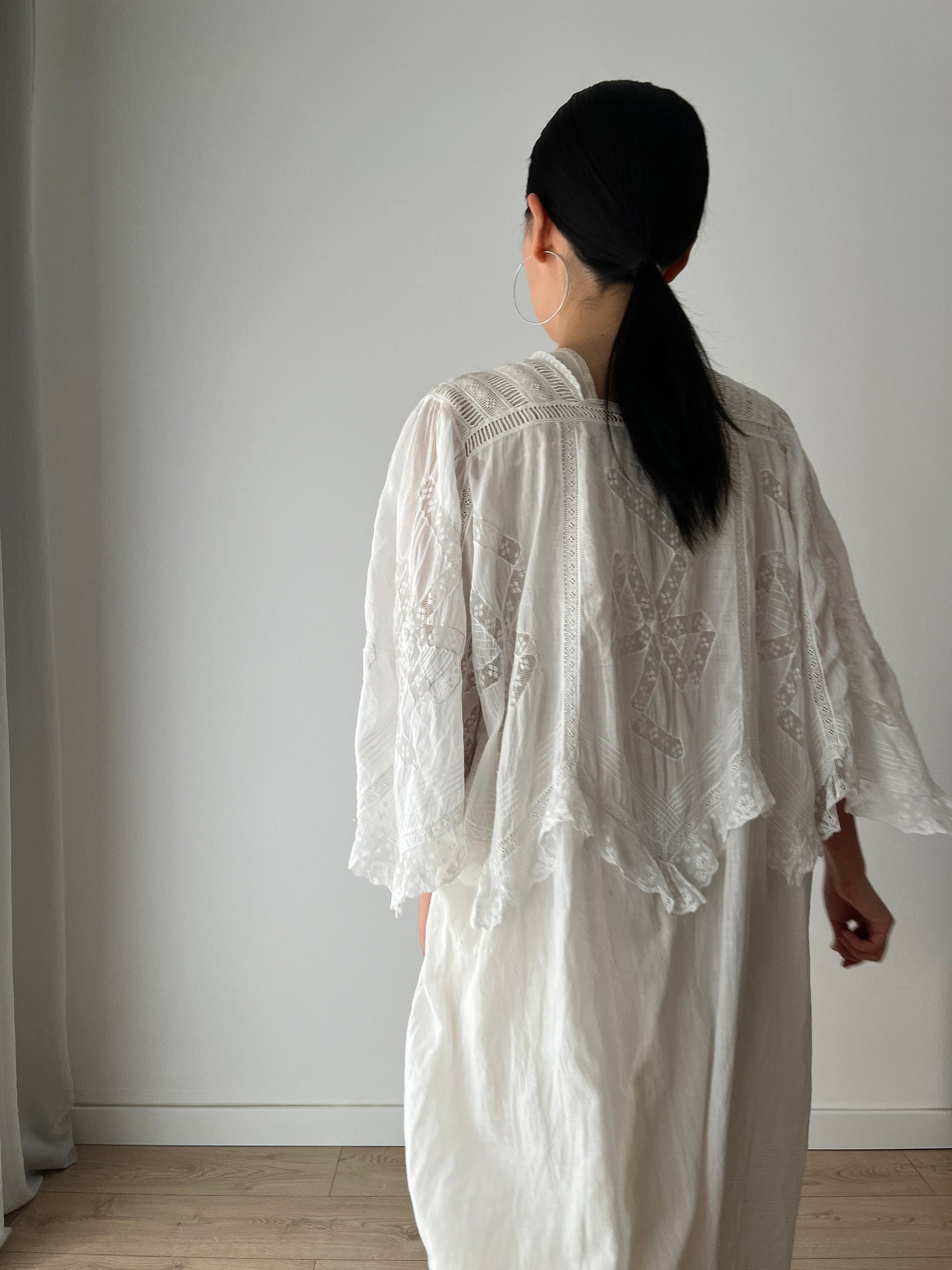 Beautiful and romantic antique Edwardian lace loose fit white nightgown, with lace inserts and trim over top bodice and the wide bat sleeves decorated with beautiful lace