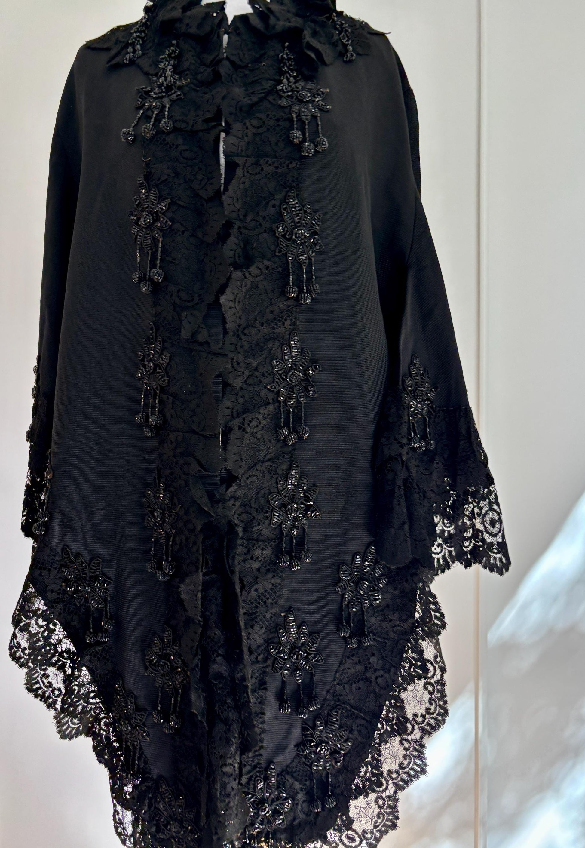 Antique 1900French beaded Silk cape with embroidery, Victorian black cape rich lace