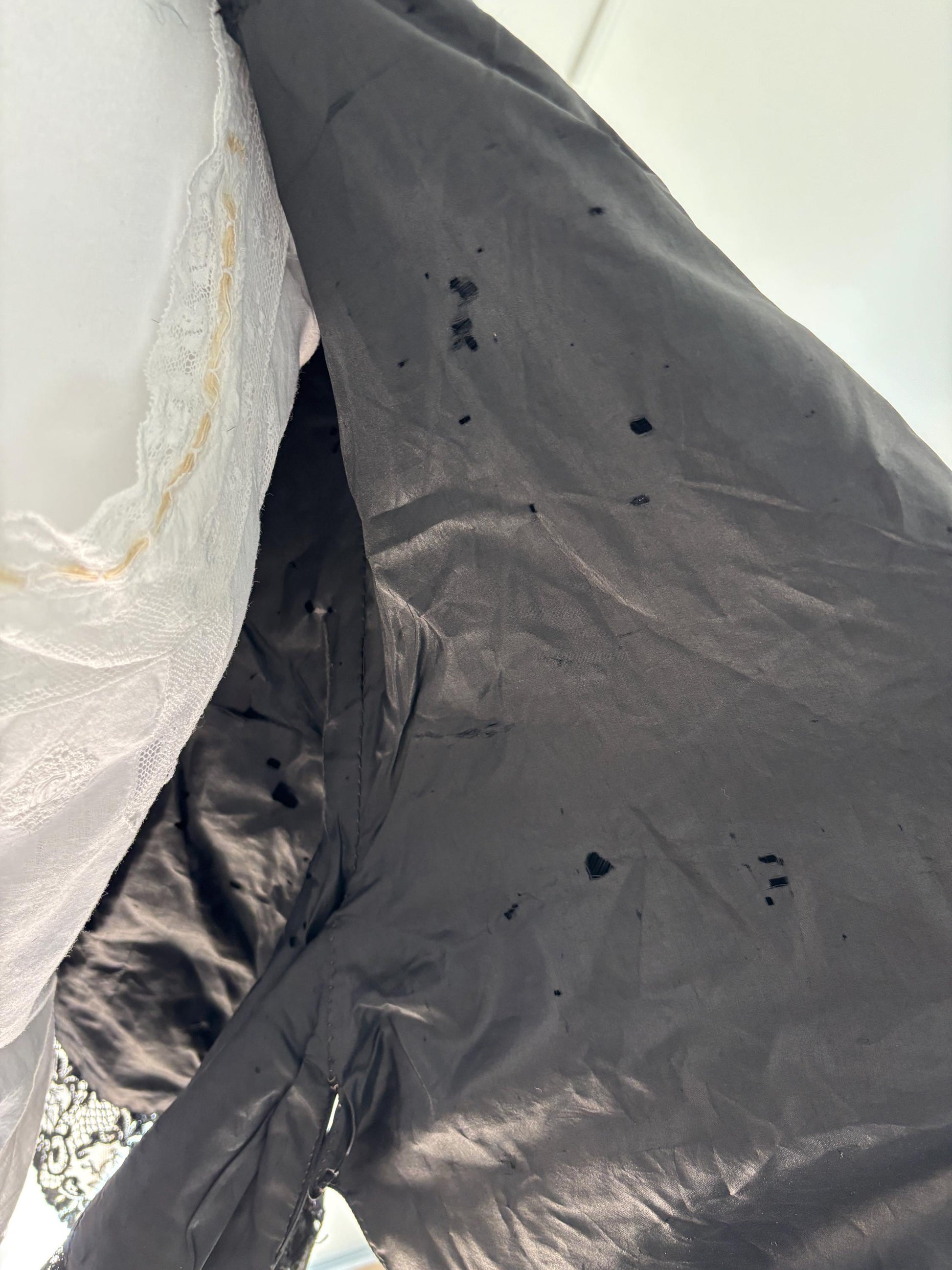 Antique Late 1800s Victorian French Black Beaded Silk Cape Cloak with Rich Lace and Embroidery Crafted from luxurious silk, this piece is in very good antique condition. The beading remains largely intact, with minimal loss. There are some minor flaws on the inner lining, such as small tears and tiny holes. However, the outer surface is well-preserved and virtually free of noticeable imperfections.,