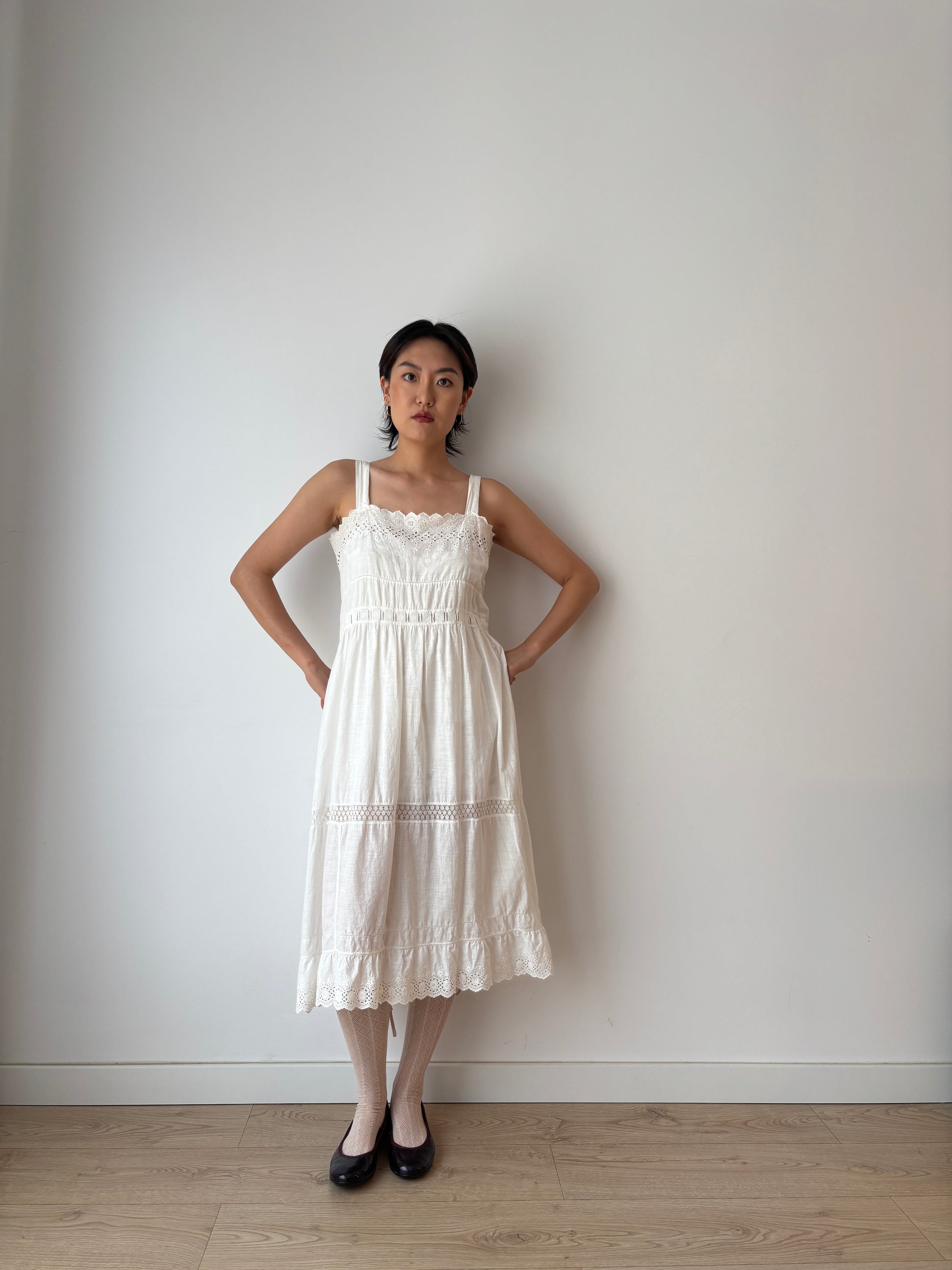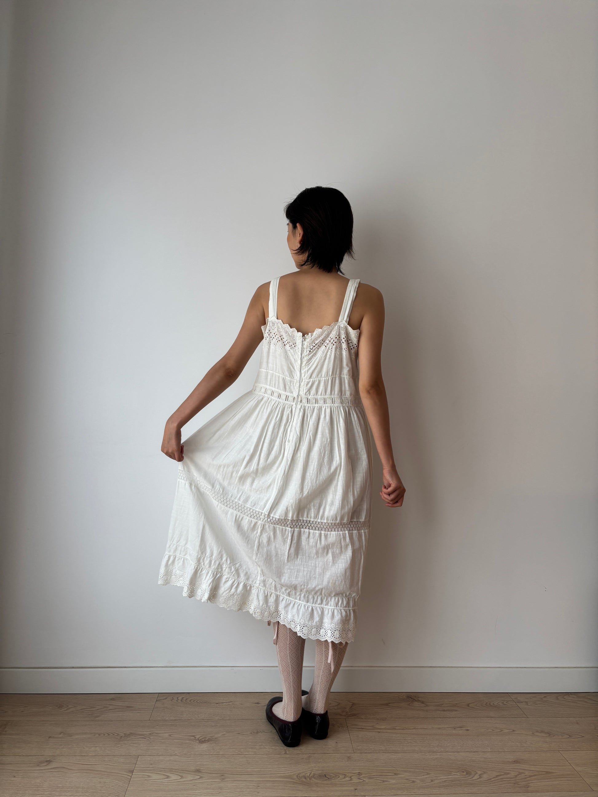 Beautiful romantic antique Victorian Edwardian lace white cotton dress with back zipper closure