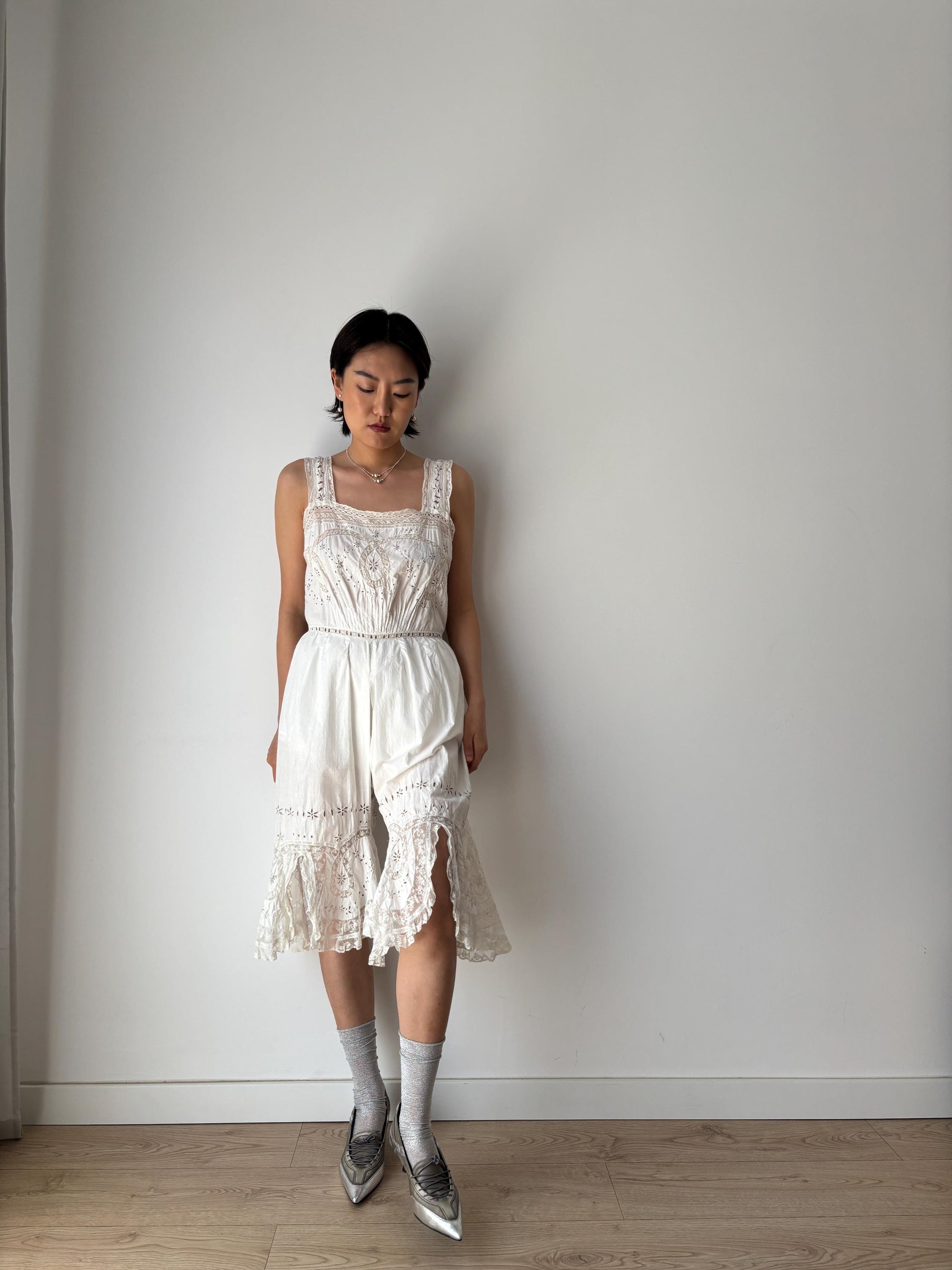 Antique 1910s Edwardian White Cotton Floral Embroidered Lace Jumpsuit Romper, One Piece Cami Split Crotch Pantaloons with Broderie Anglaise